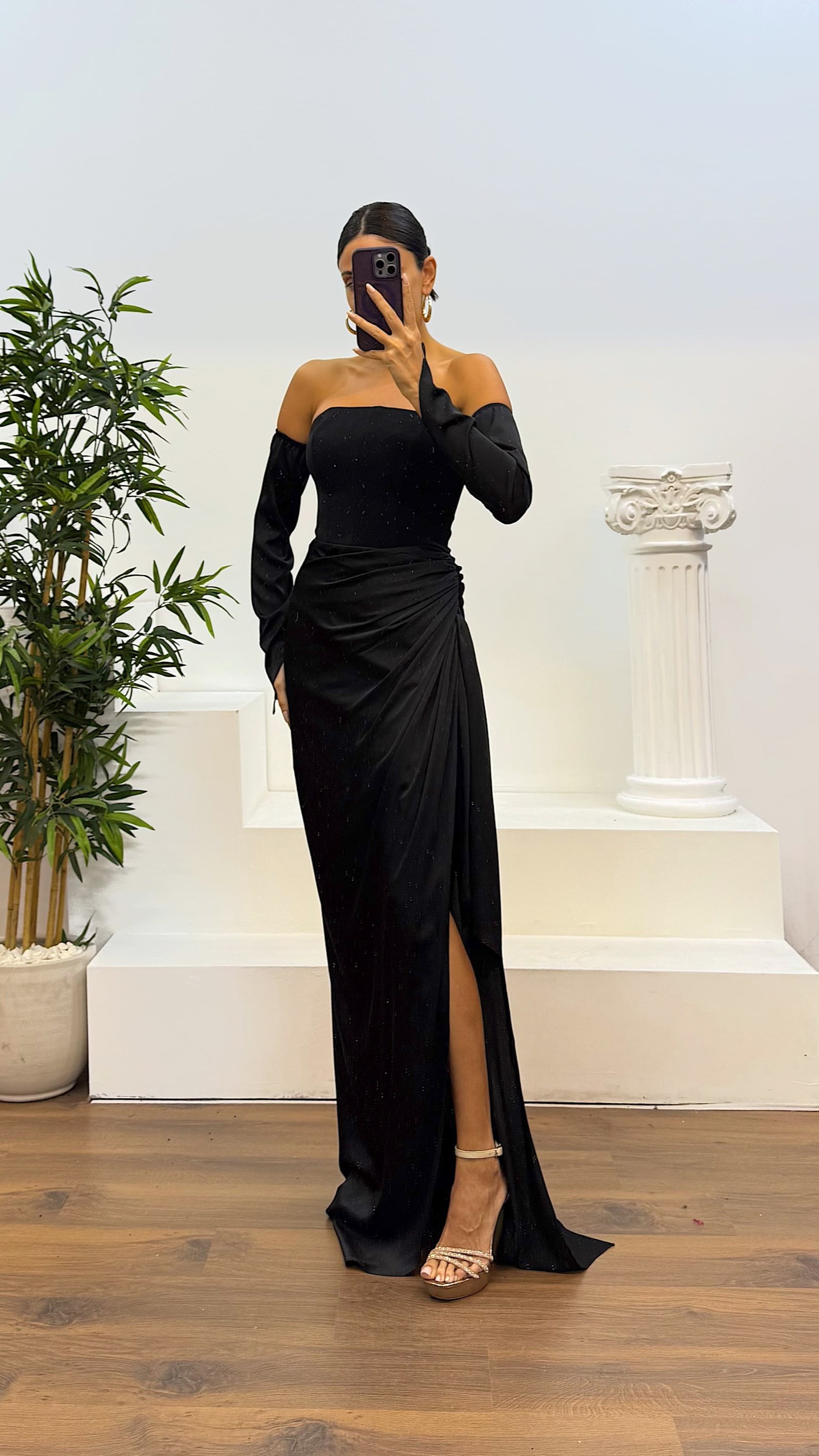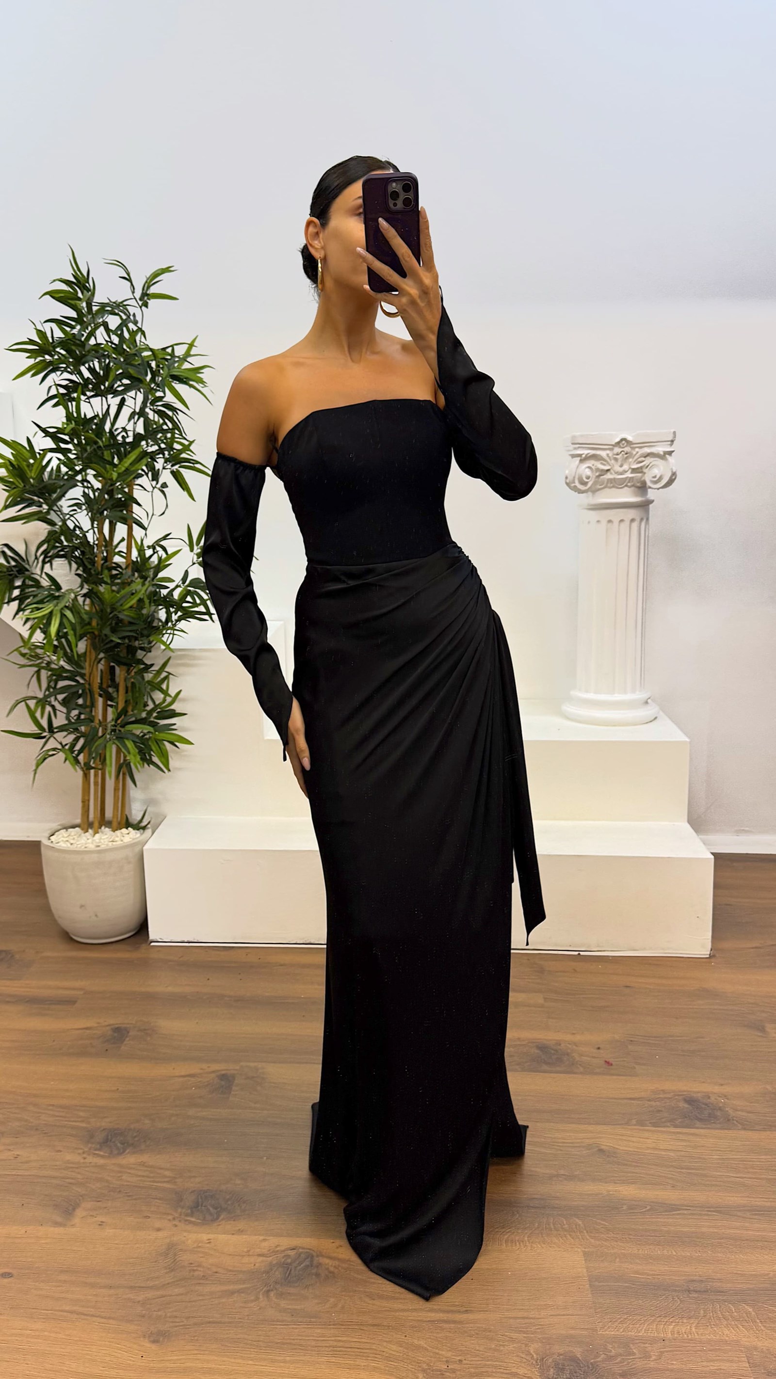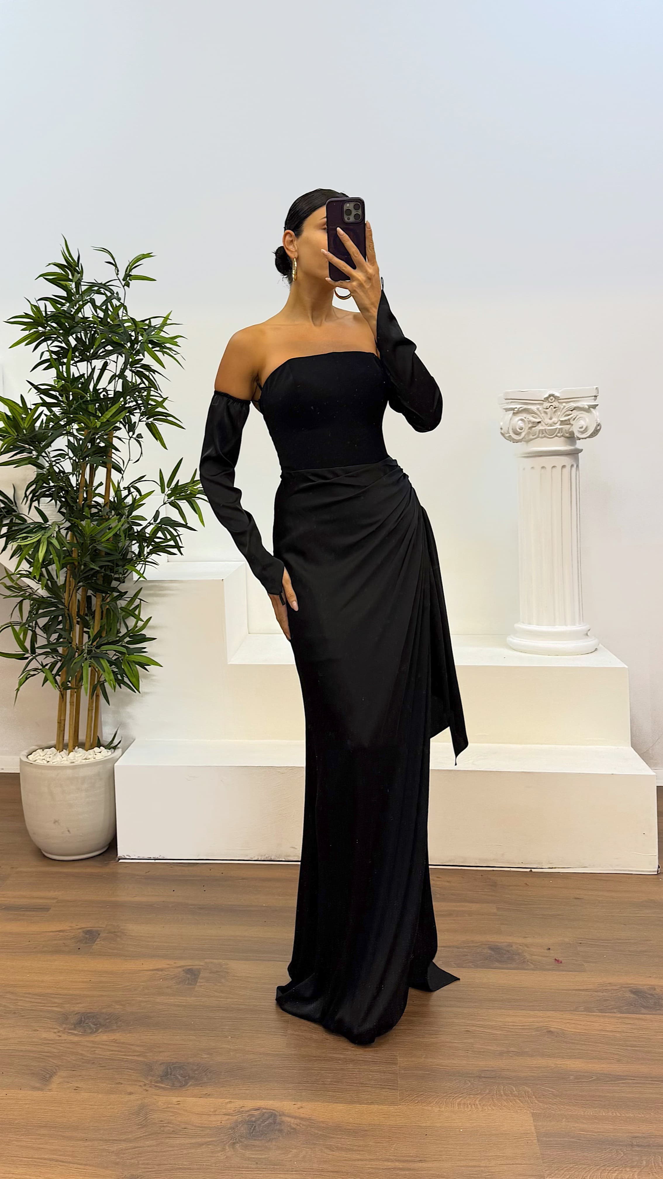 Siyah Straplez Eldivenli Saten Abiye Elbise