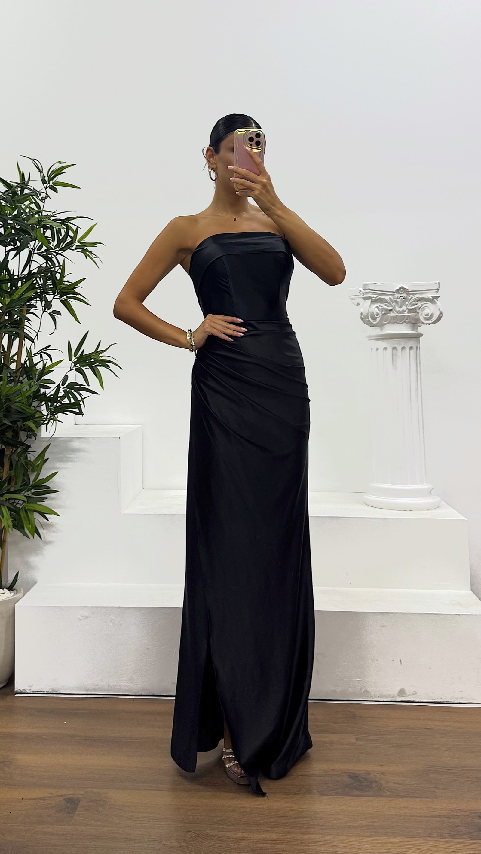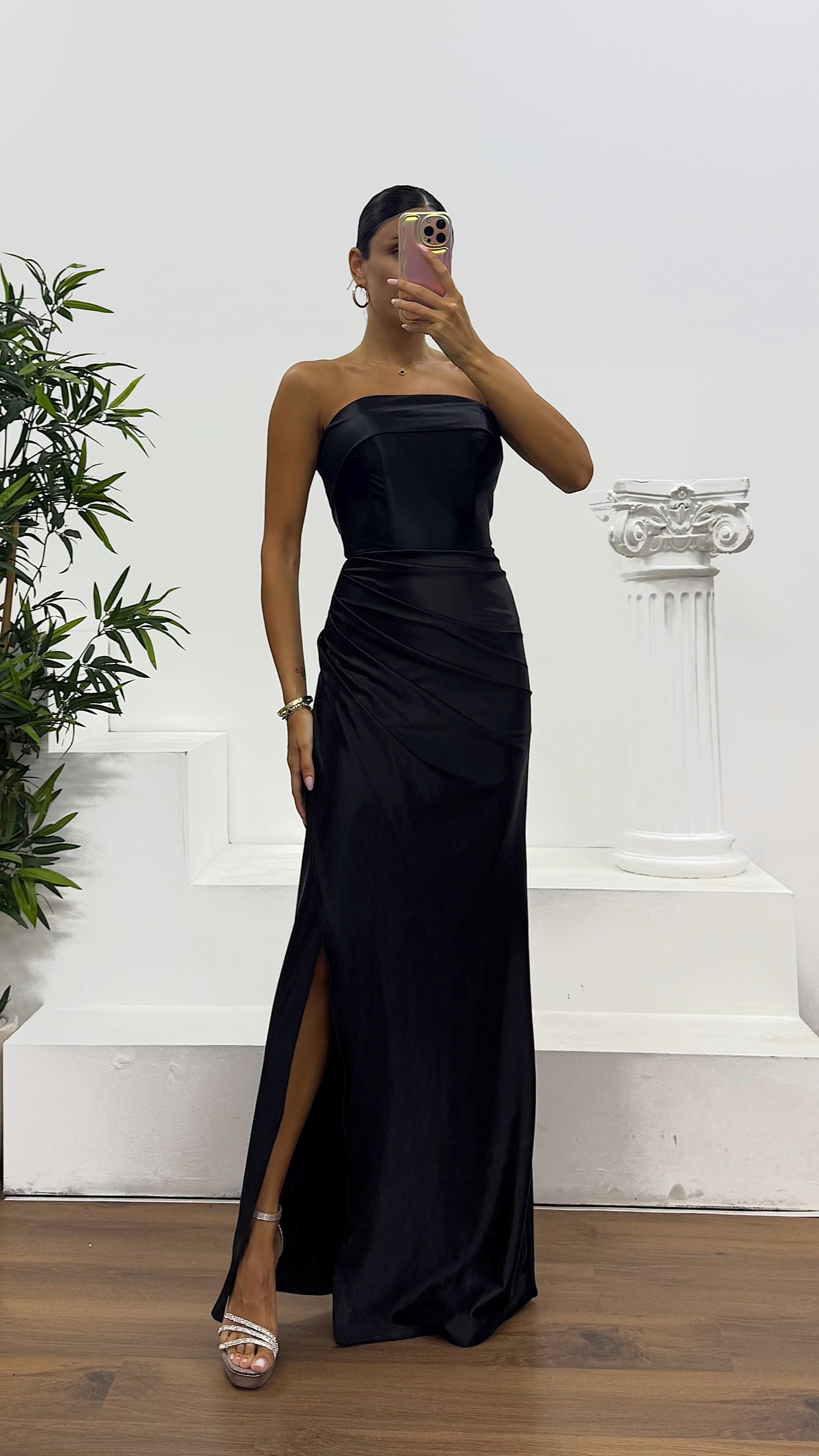 Ürün 36-42 bedene kadar uyumlu, göğüs pedli, astarlı, sırt capraz ip ve fermuar kapamalı, yırtmaçlı abiye olarak tasarlanmıştır.