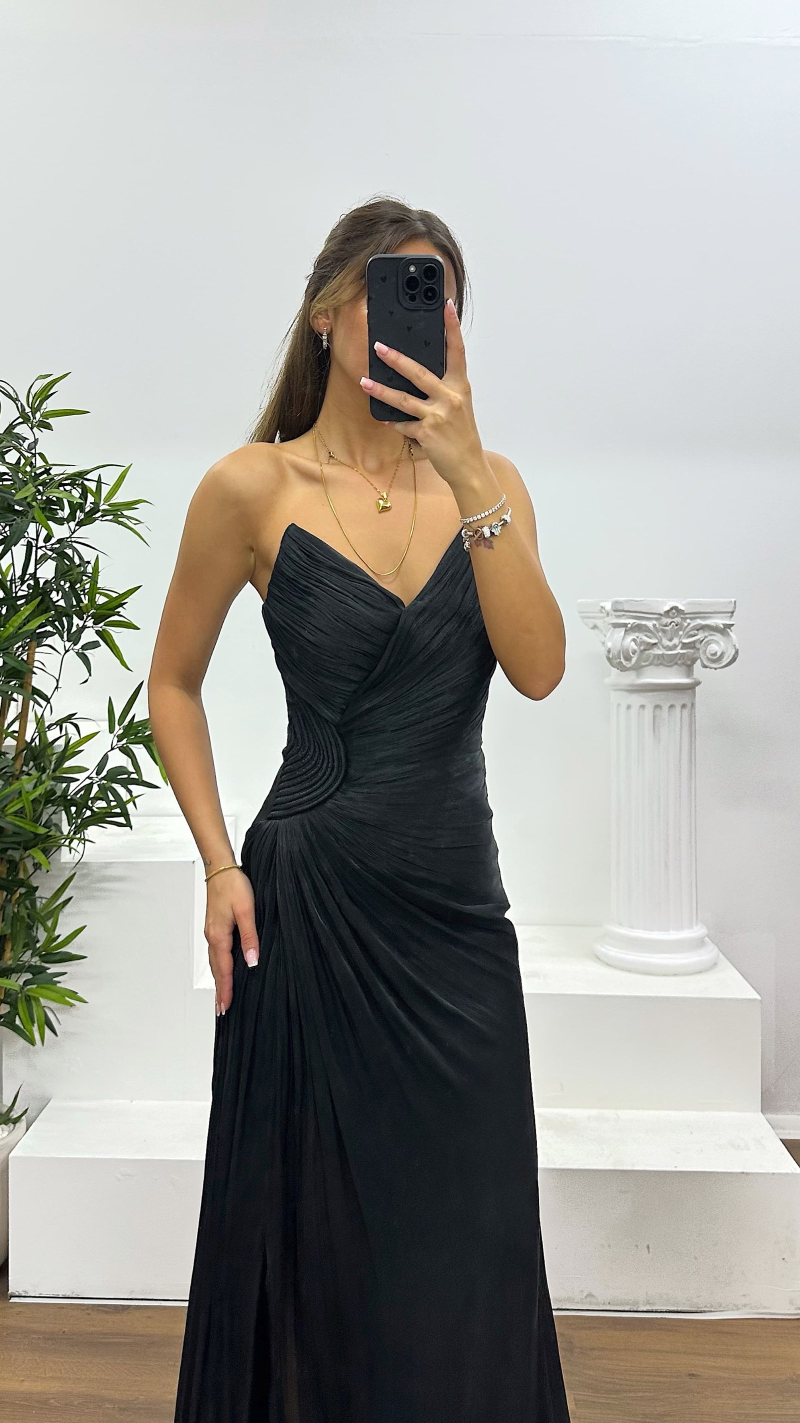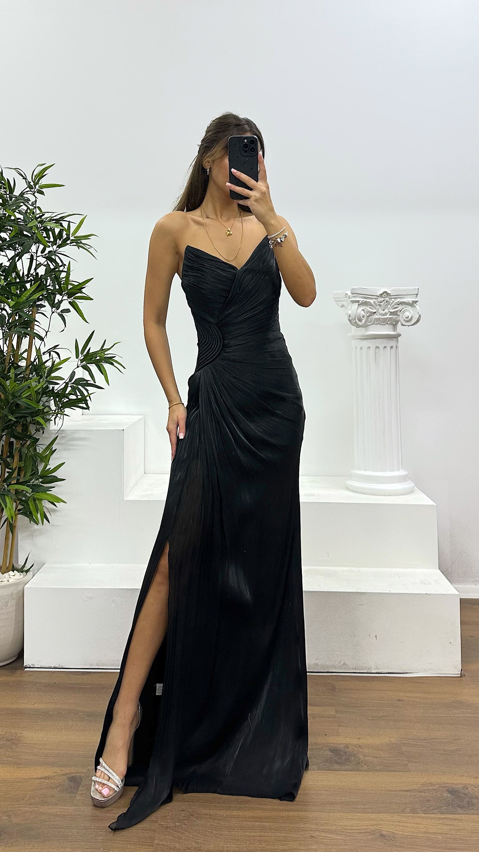 Ürün 36-42 bedene kadar uyumlu, göğüs pedli, astarlı, sırt capraz ip ve fermuar kapamalı, yırtmaçlı abiye olarak tasarlanmıştır.