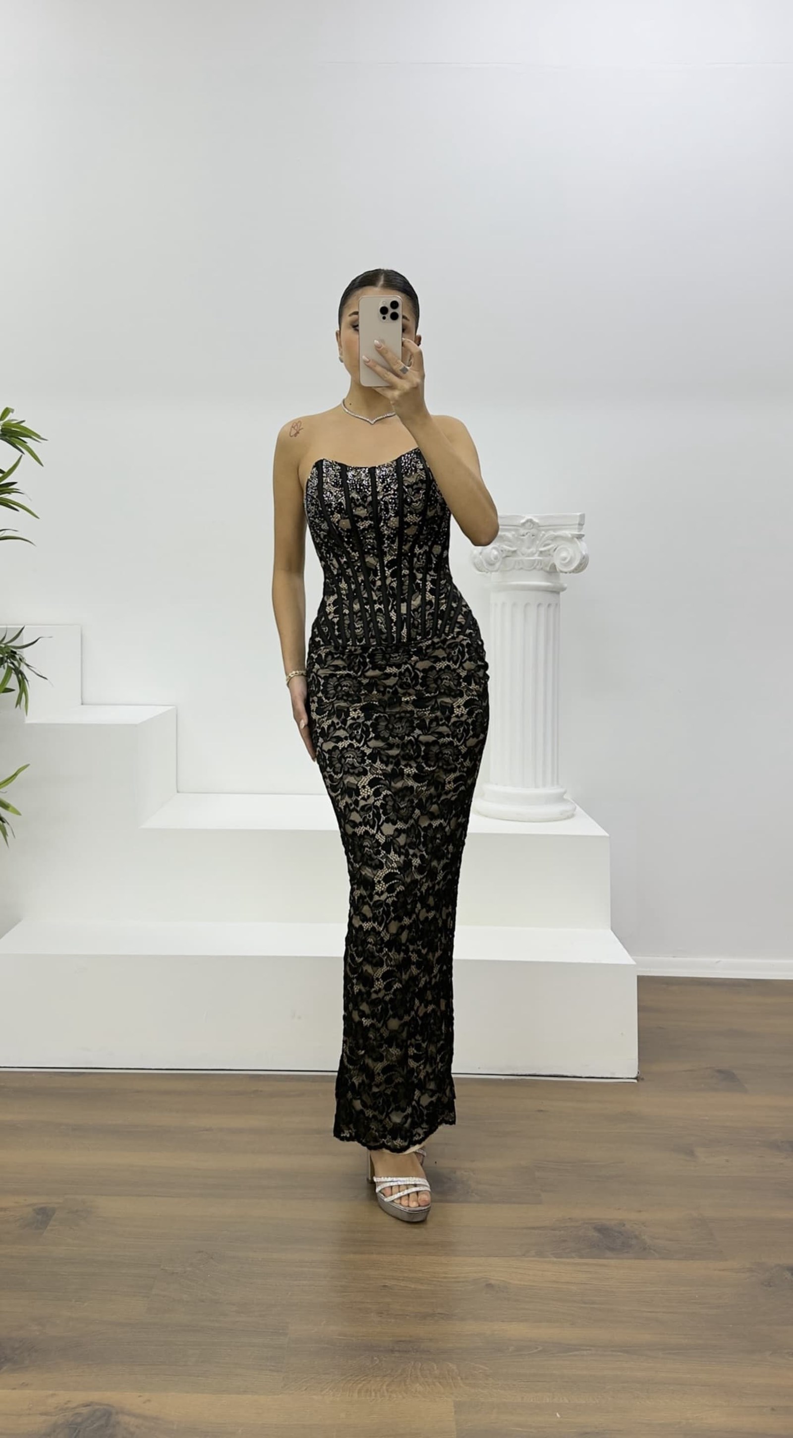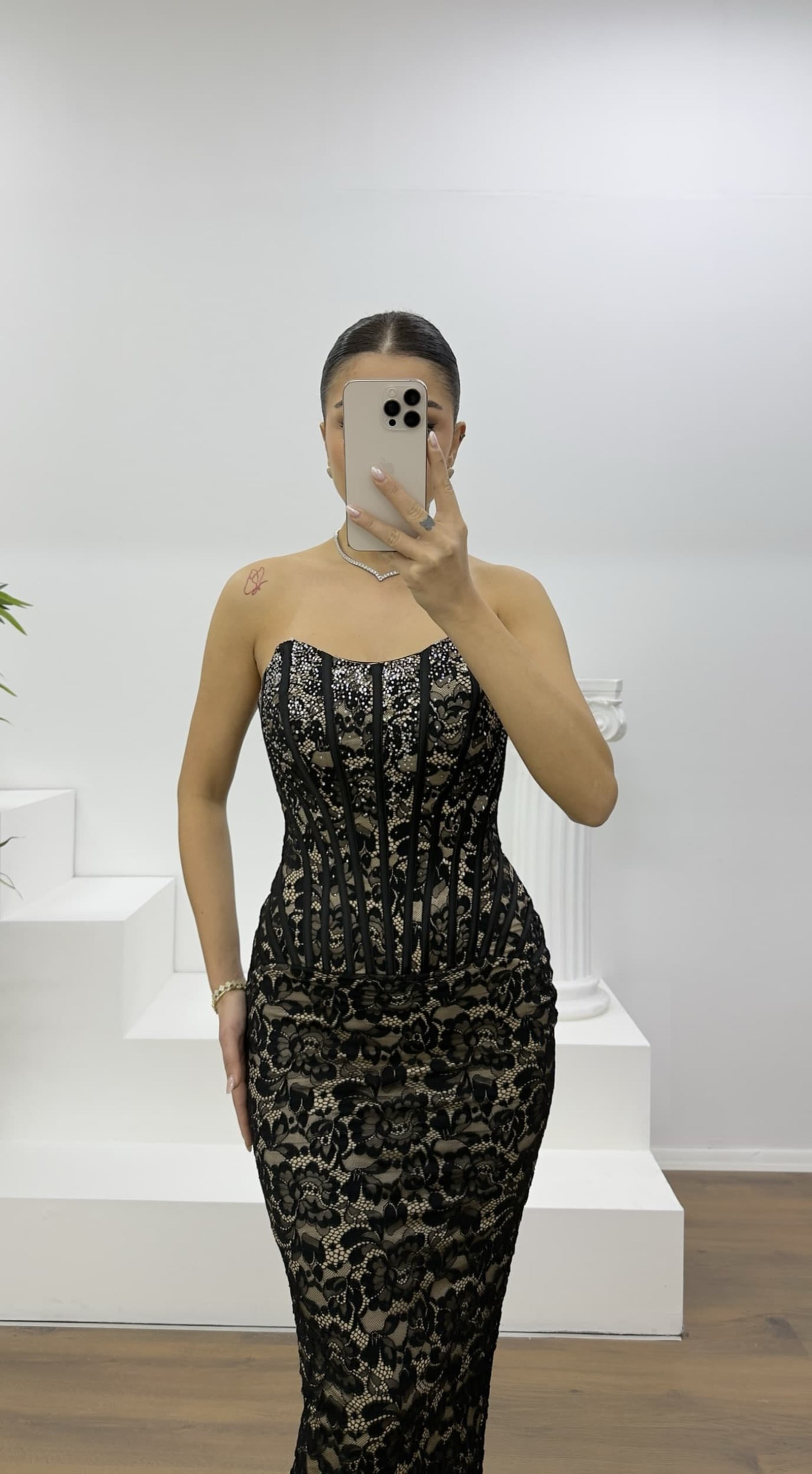 Siyah Straplez Taş Detay Dantel Abiye Elbise