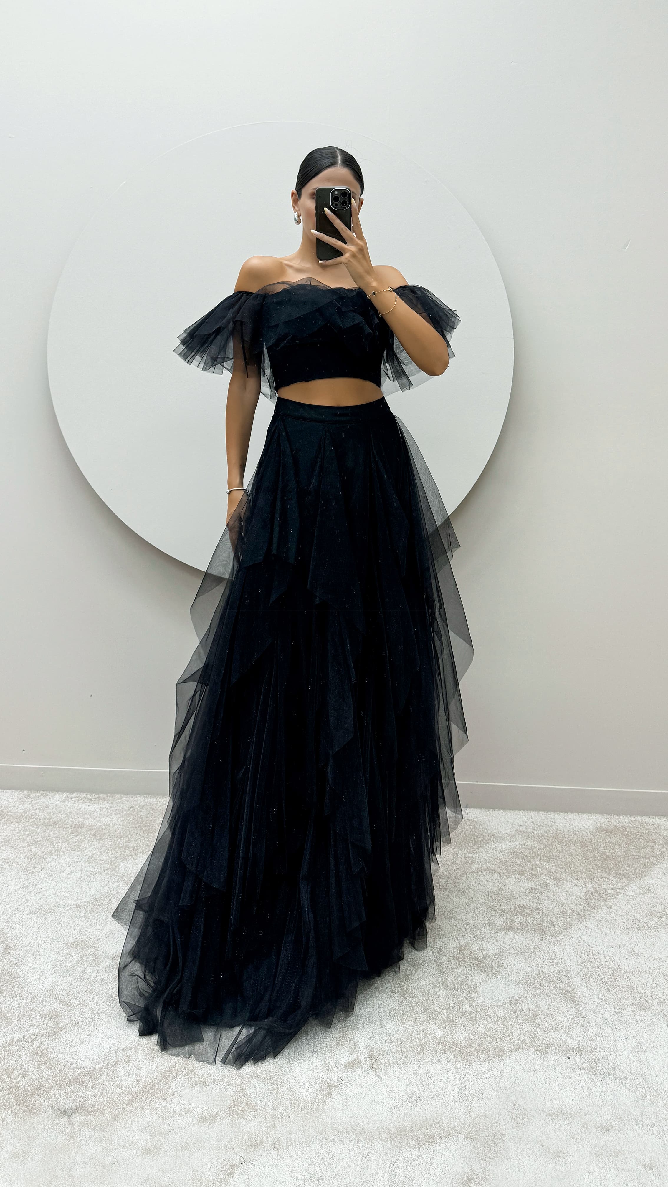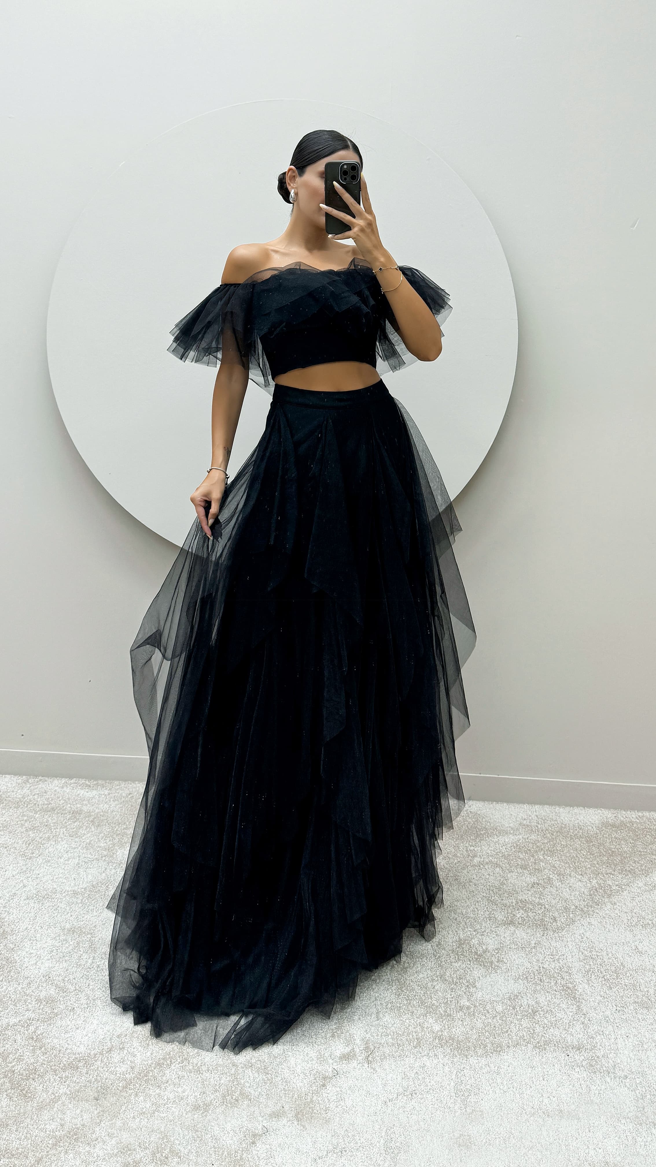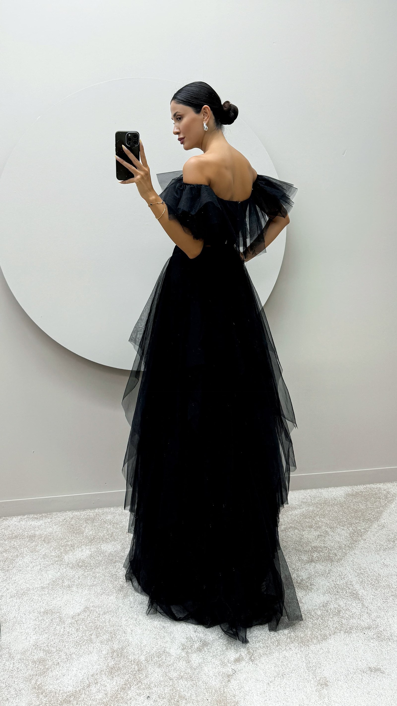 Siyah Straplez Tül Detay İkili Tasarım Elbise