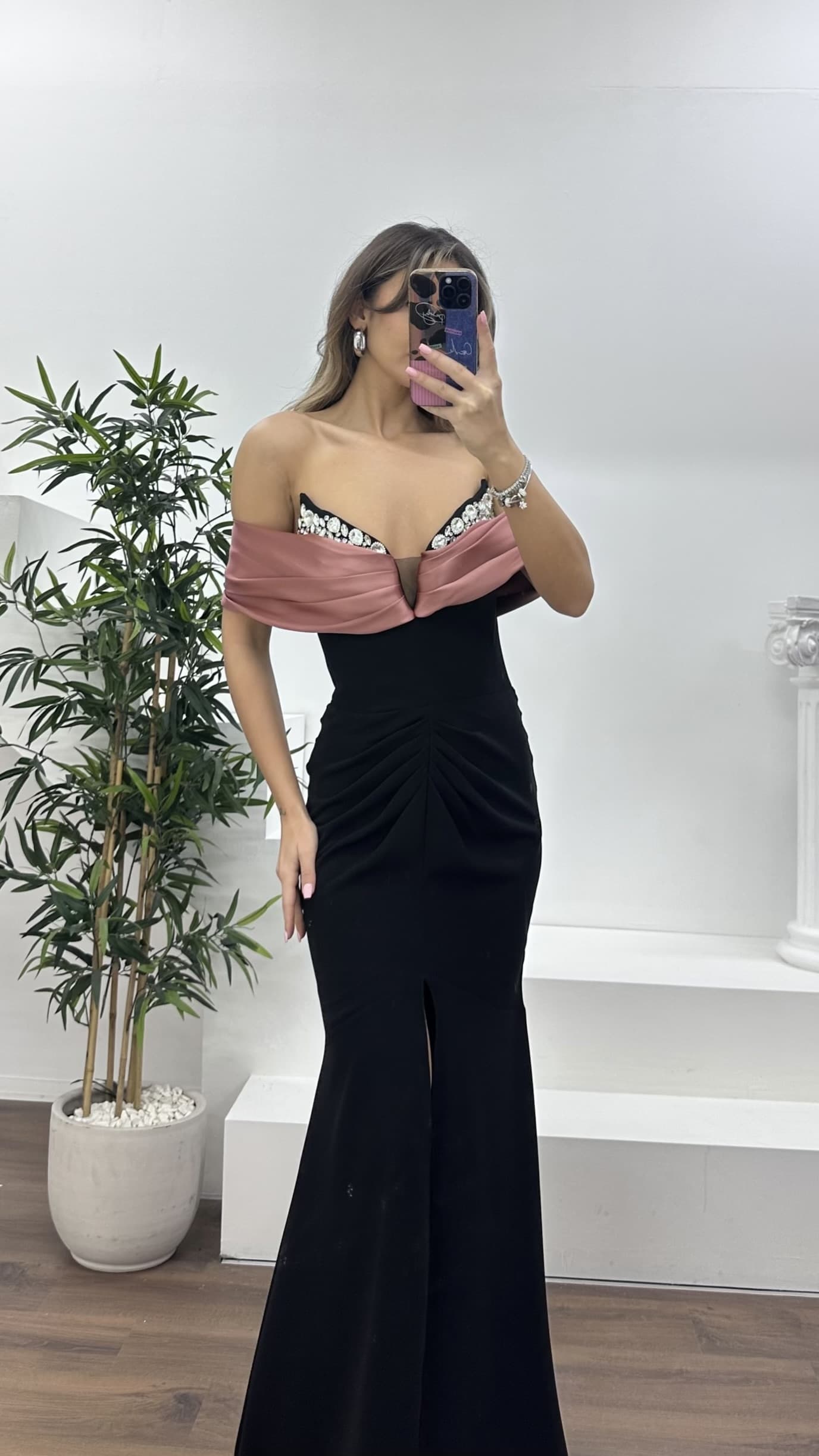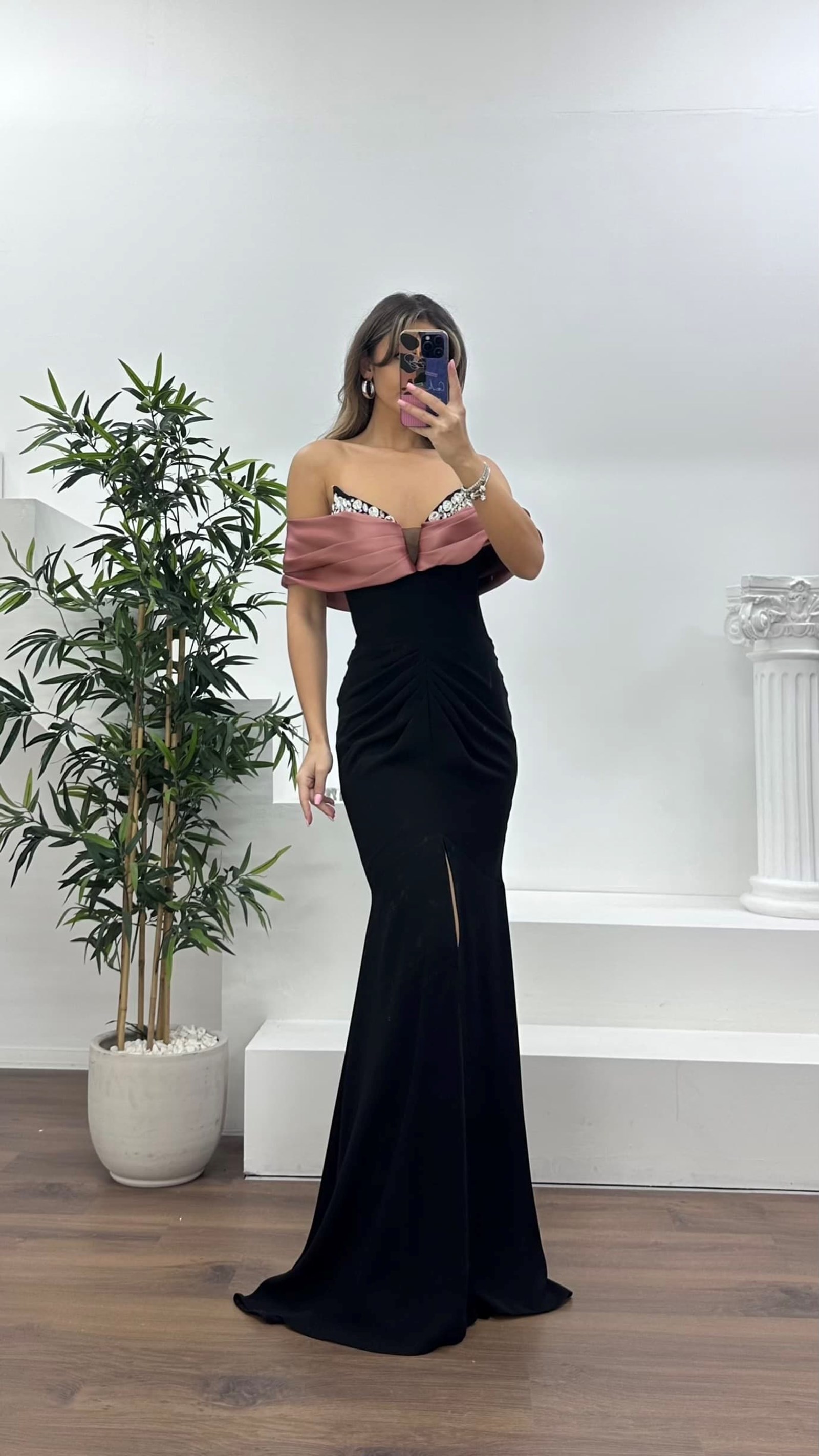 • Siyah-Tarçın Straplez Yaka, Dökümlü Yan Kol Detaylı Abiye Elbise