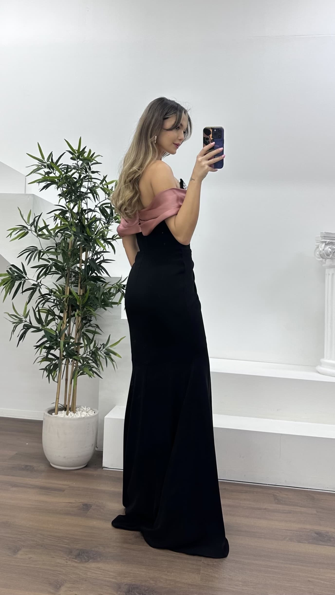 Siyah-Tarçın Straplez Yaka, Dökümlü Yan Kol Detaylı Abiye Elbise