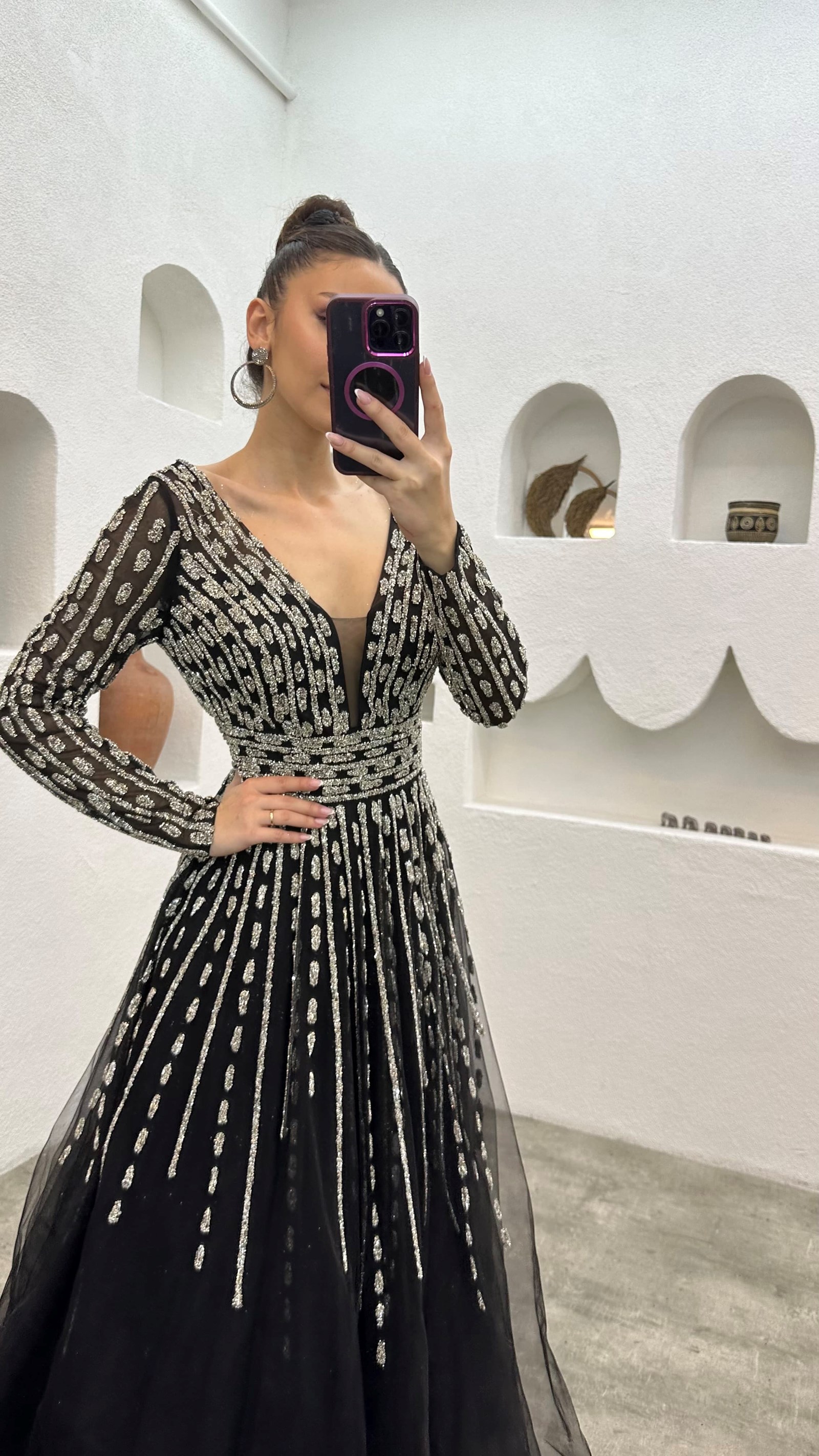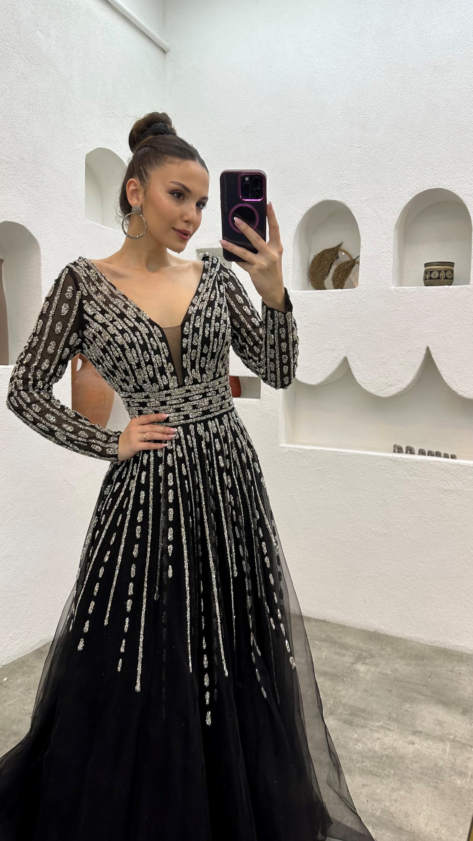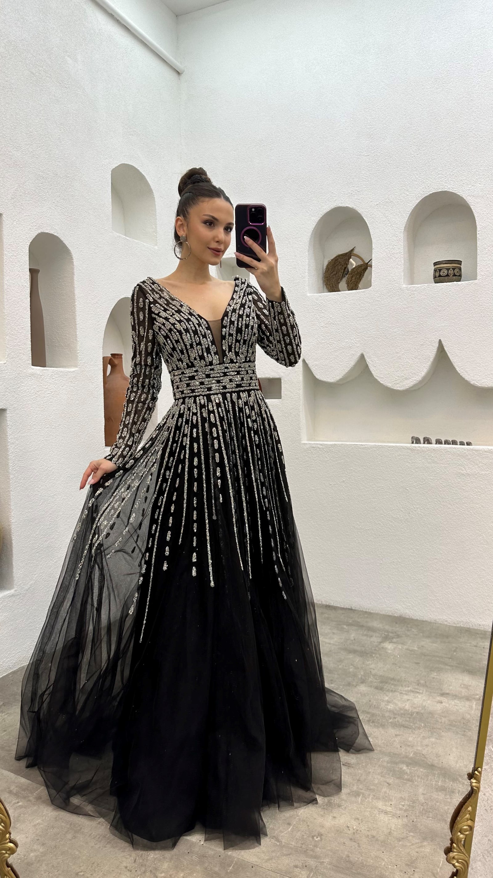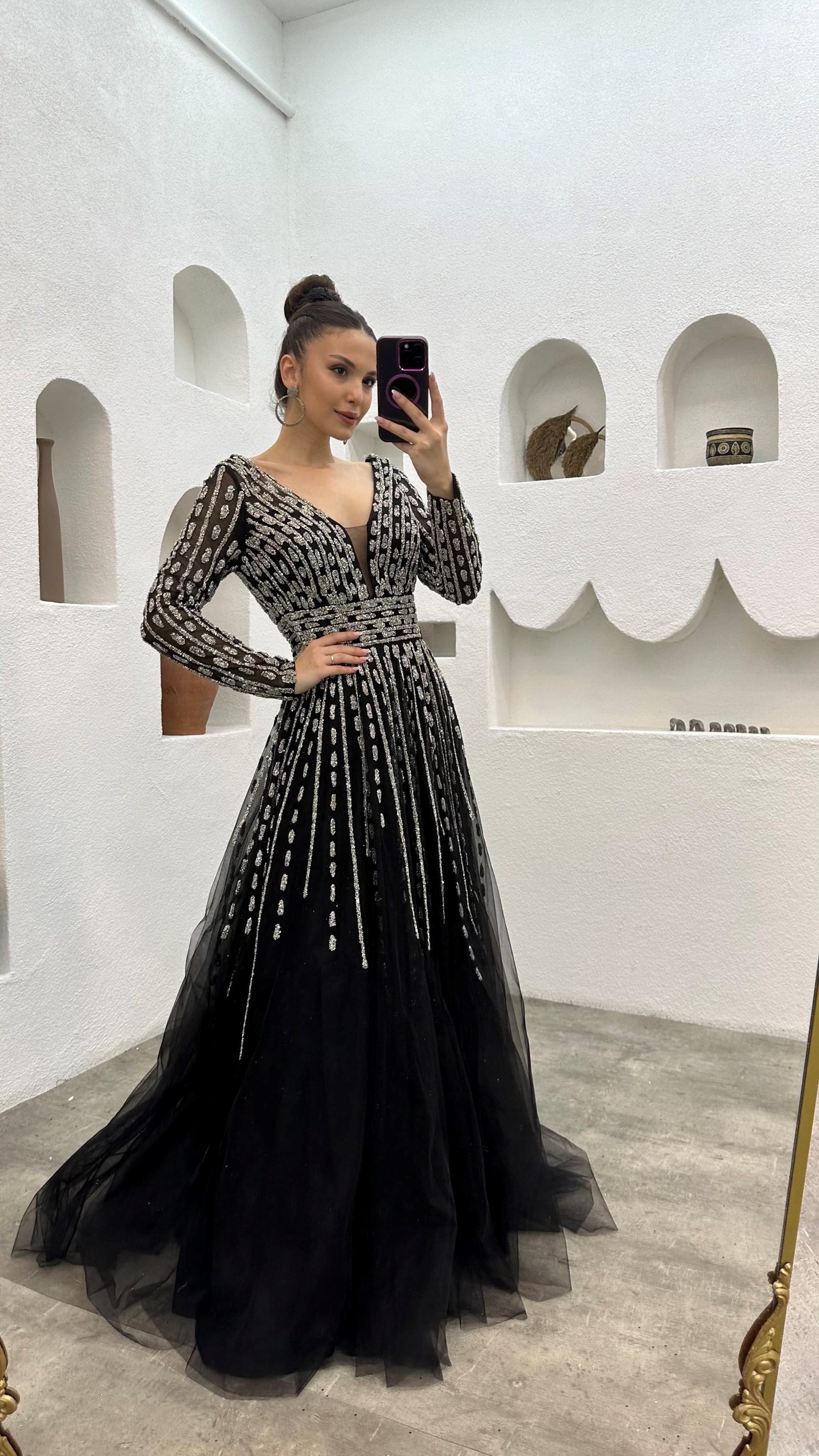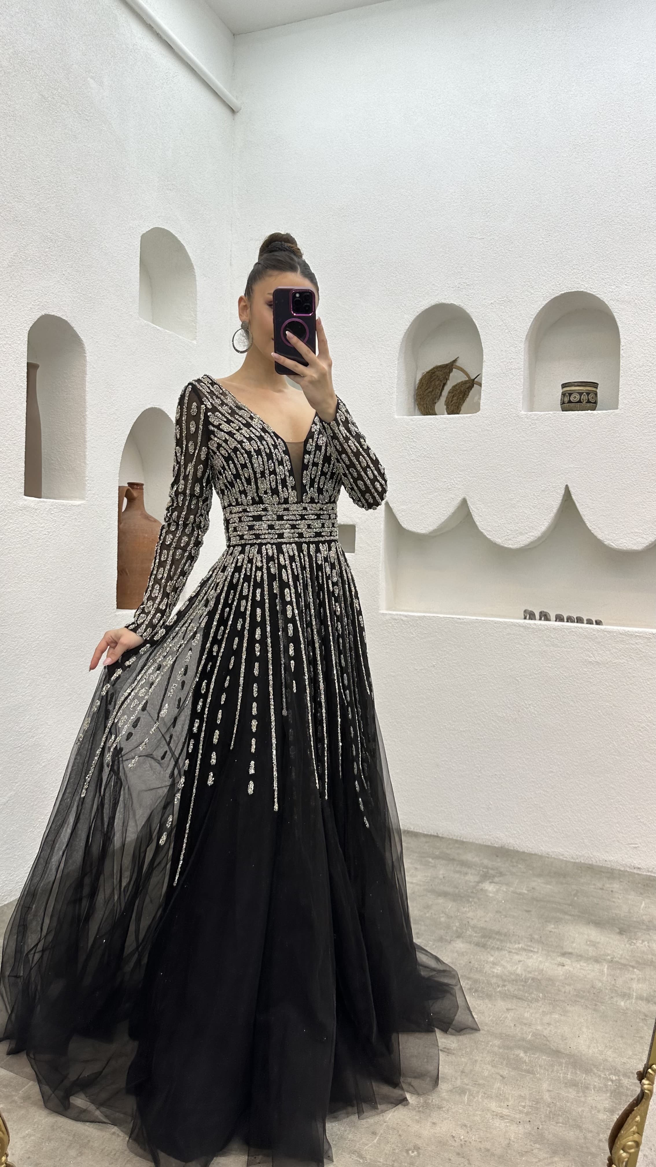 • Siyah Taşlı İşlemeli Tül Abiye Elbise