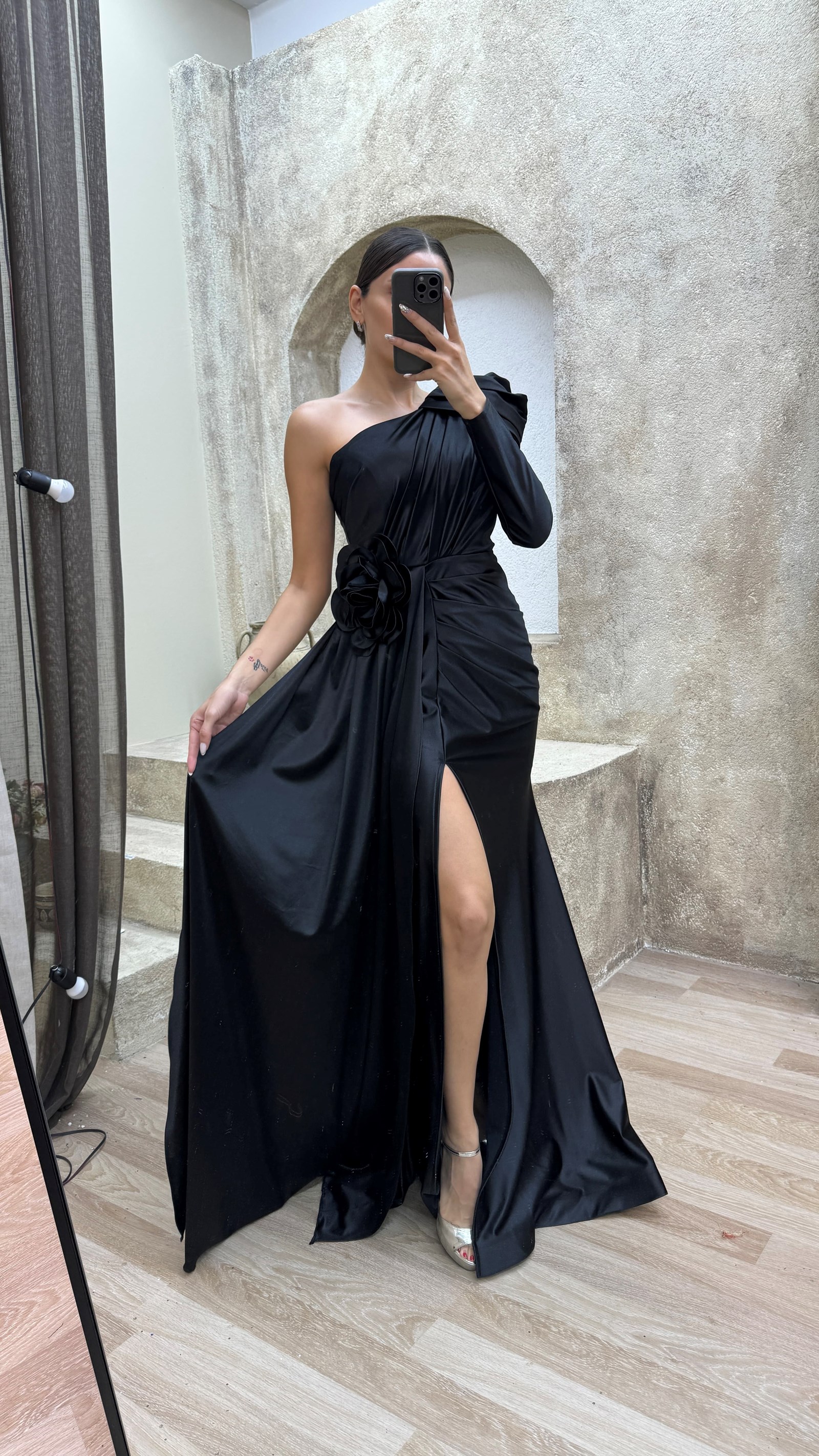 • Siyah Tek Kol Bel Detay Tasarım Saten Abiye Elbise