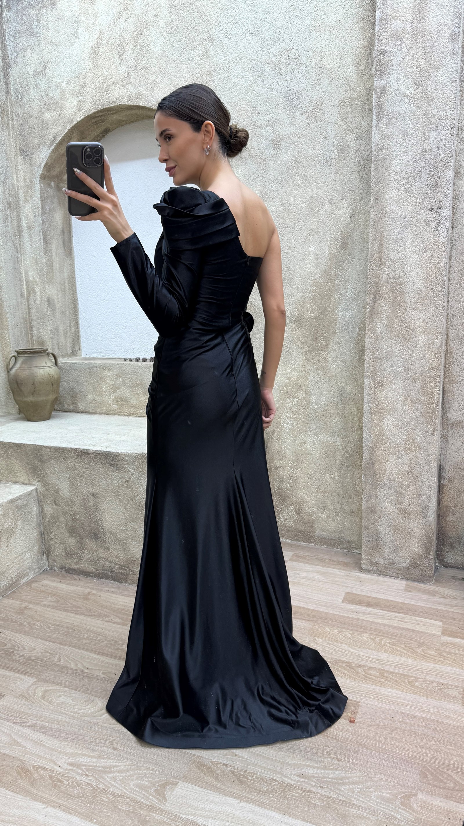 Siyah Tek Kol Bel Detay Tasarım Saten Abiye Elbise
