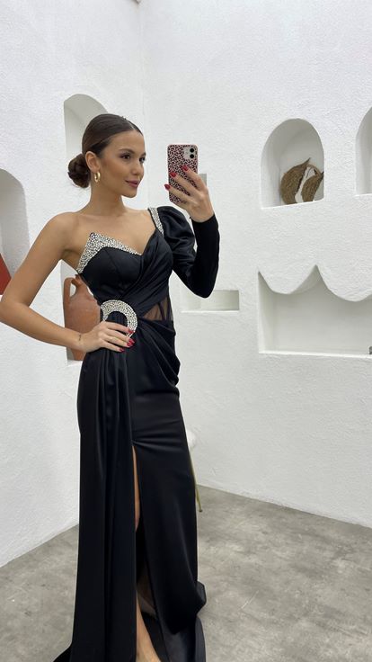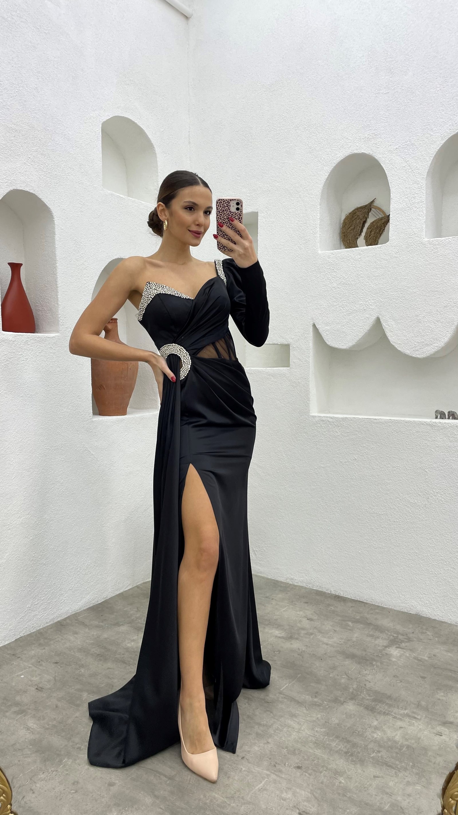 Siyah Tek Kol İşlemeli Saten Abiye Elbise