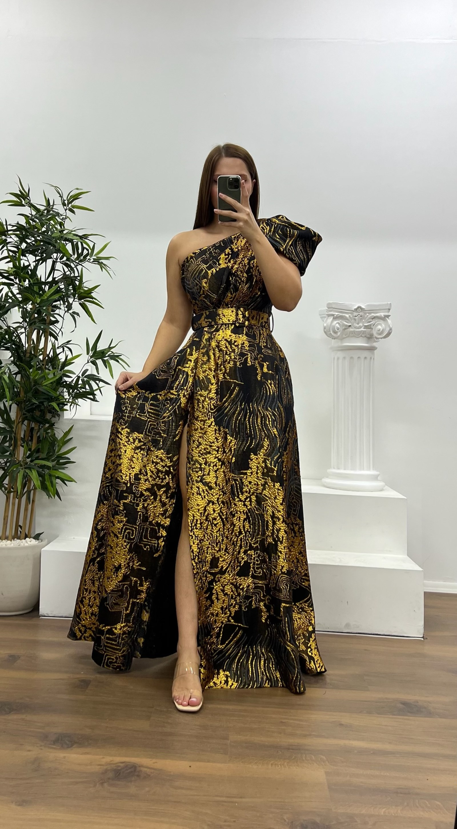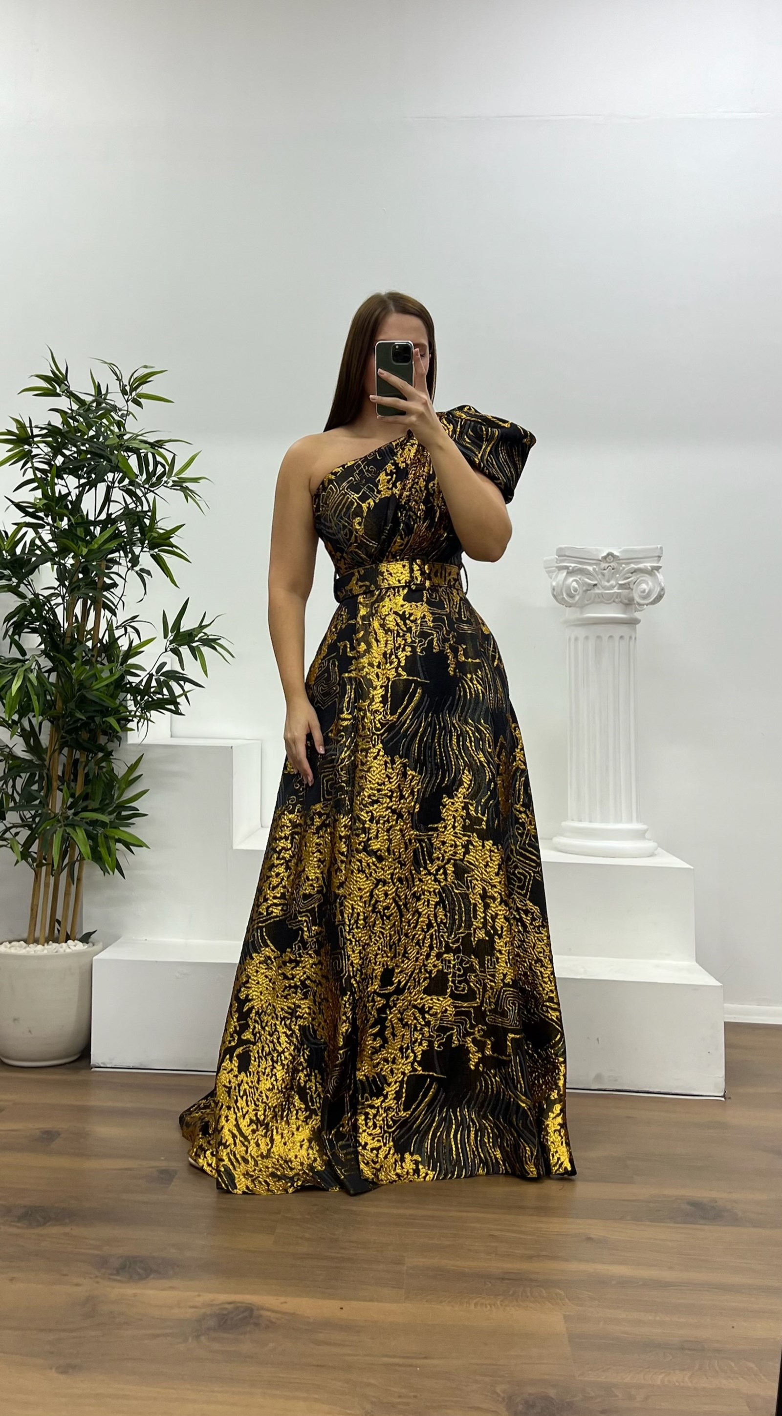 • Kemik Tek Omuz Desenli Büyük Beden Abiye Elbise