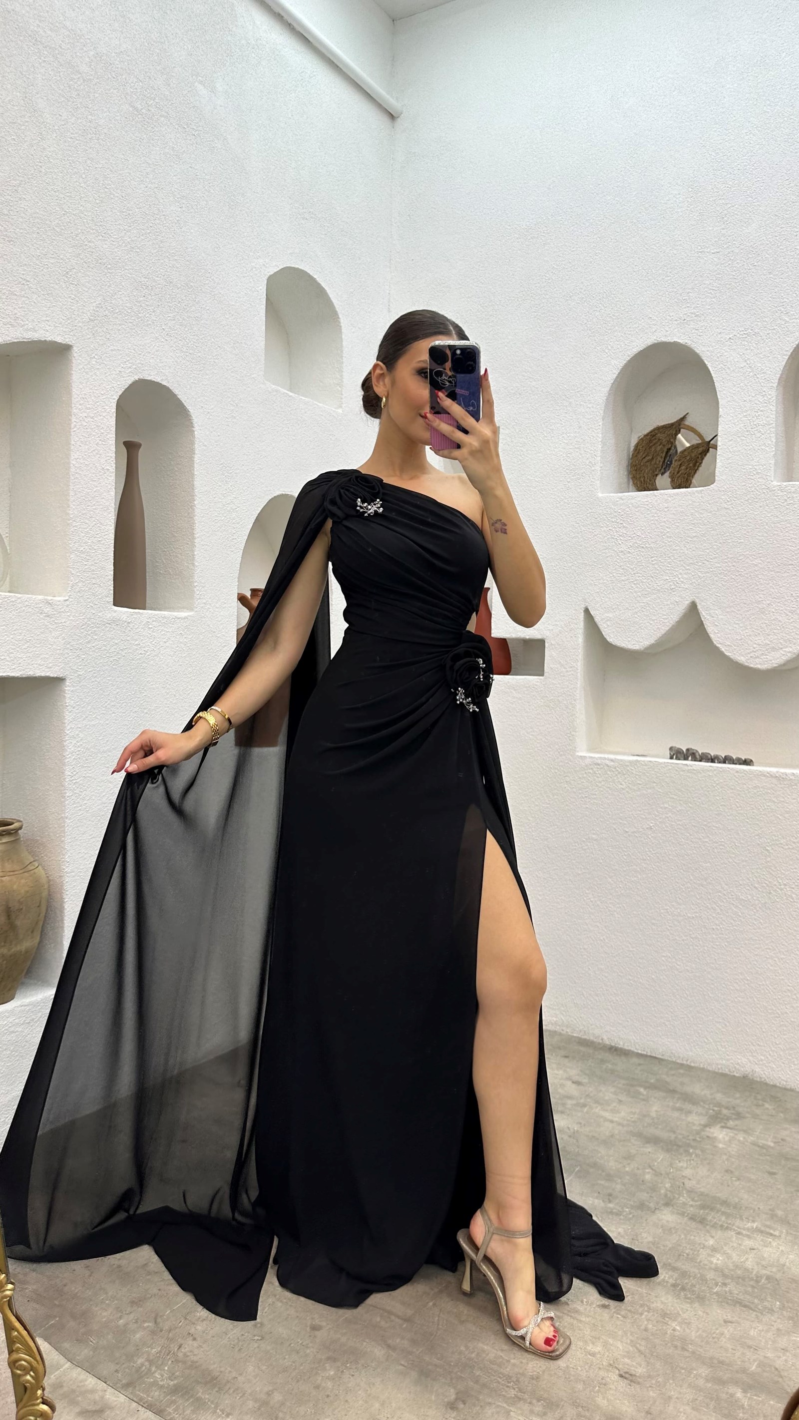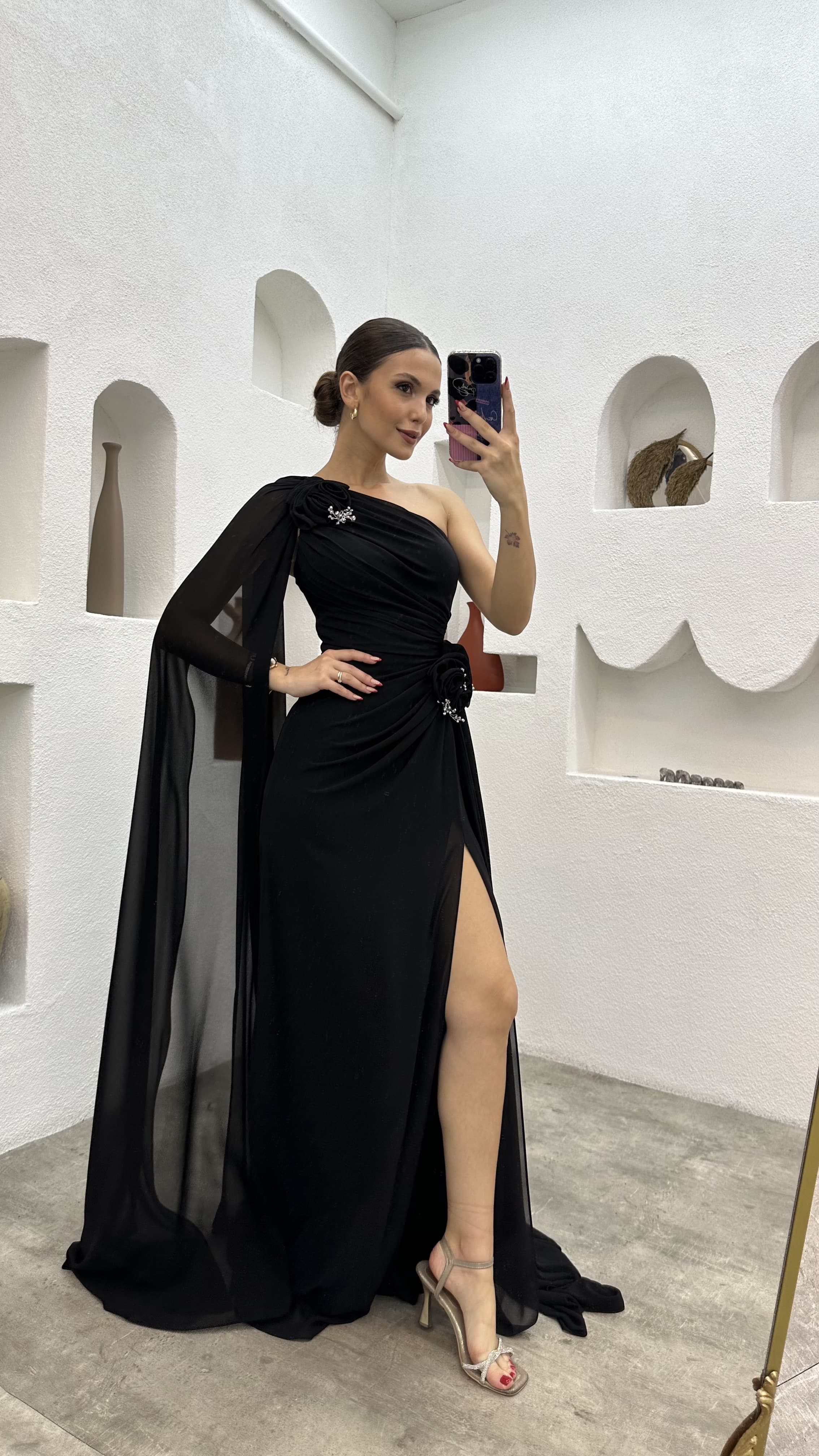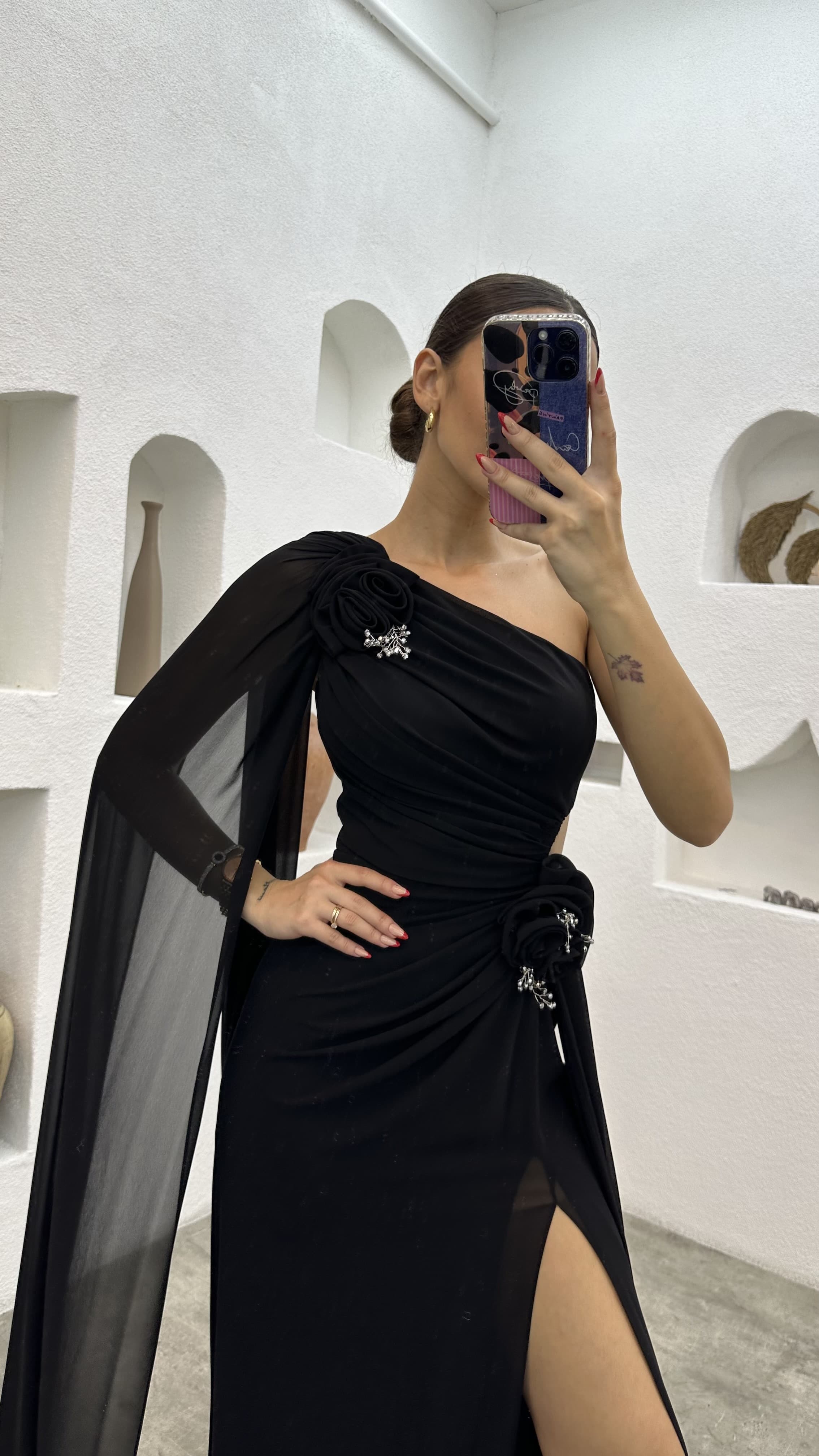 • Siyah Tek Omuz Gül Detay Drapeli Abiye Elbise