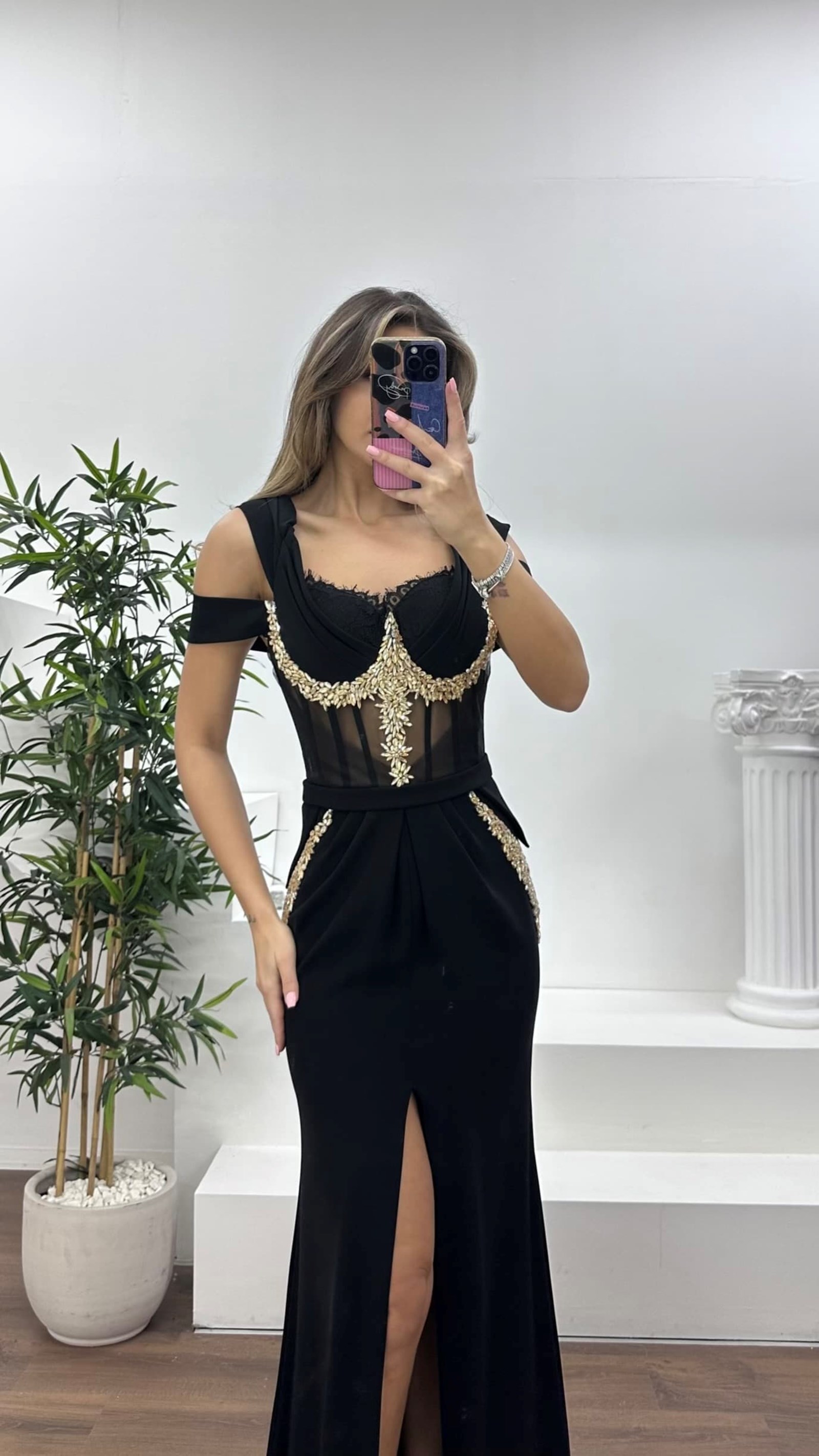 • Siyah Transparan Korse Detaylı Krep Kumaş Abiye Elbise