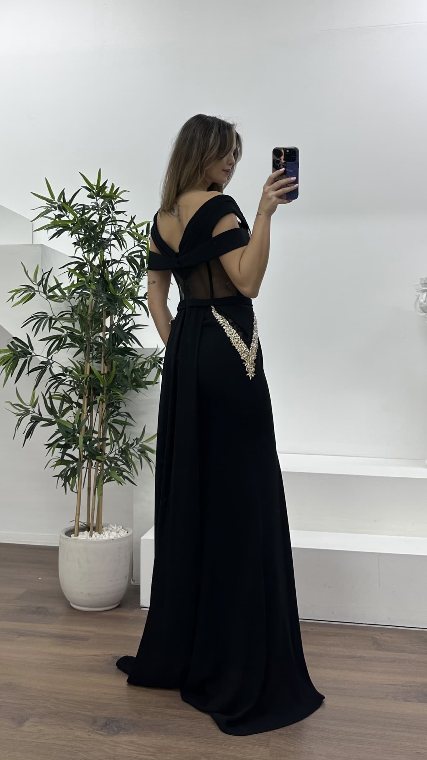 Siyah Transparan Korse Detaylı Krep Kumaş Abiye Elbise