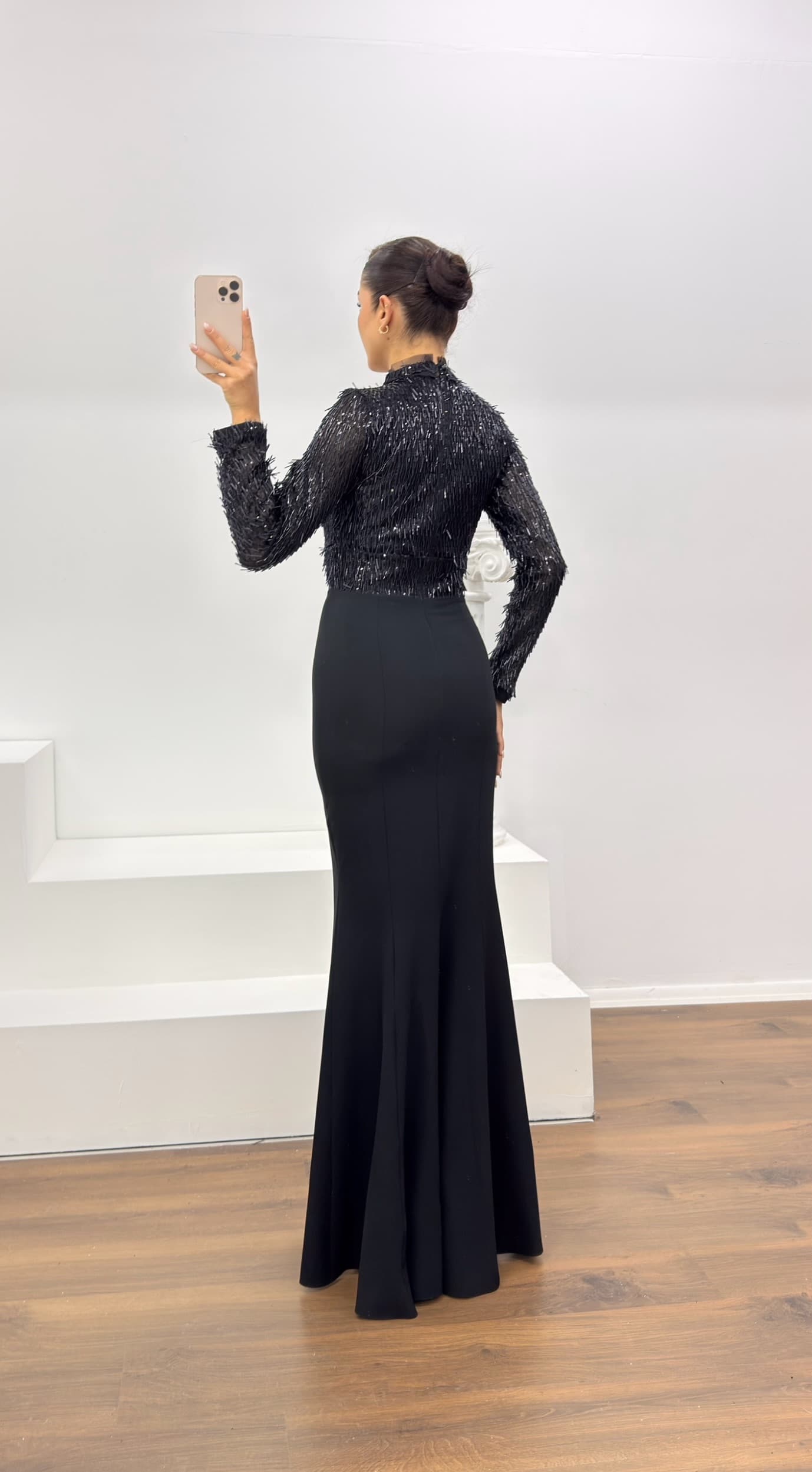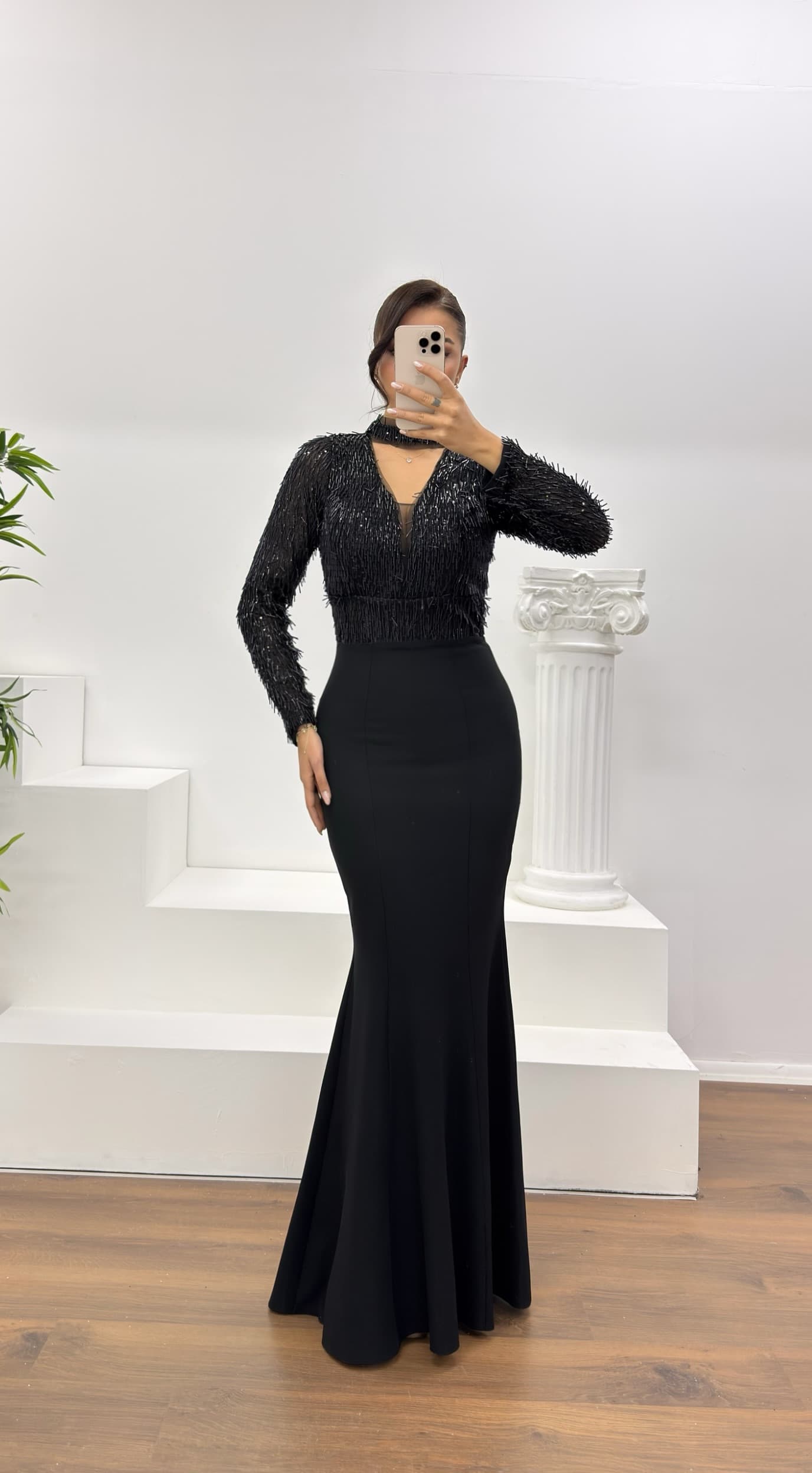 • Siyah Uzun Kollu İşleme Detaylı Abiye Elbise