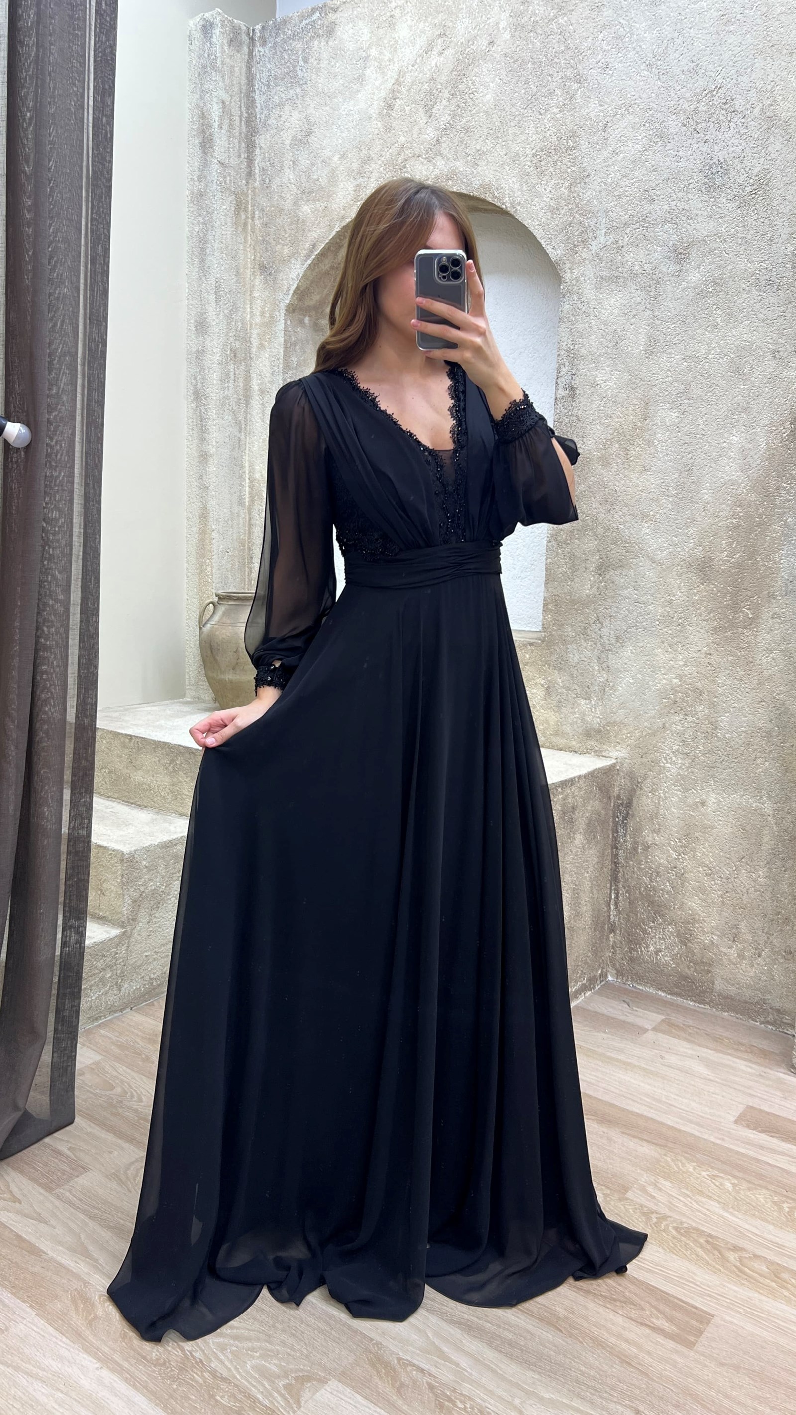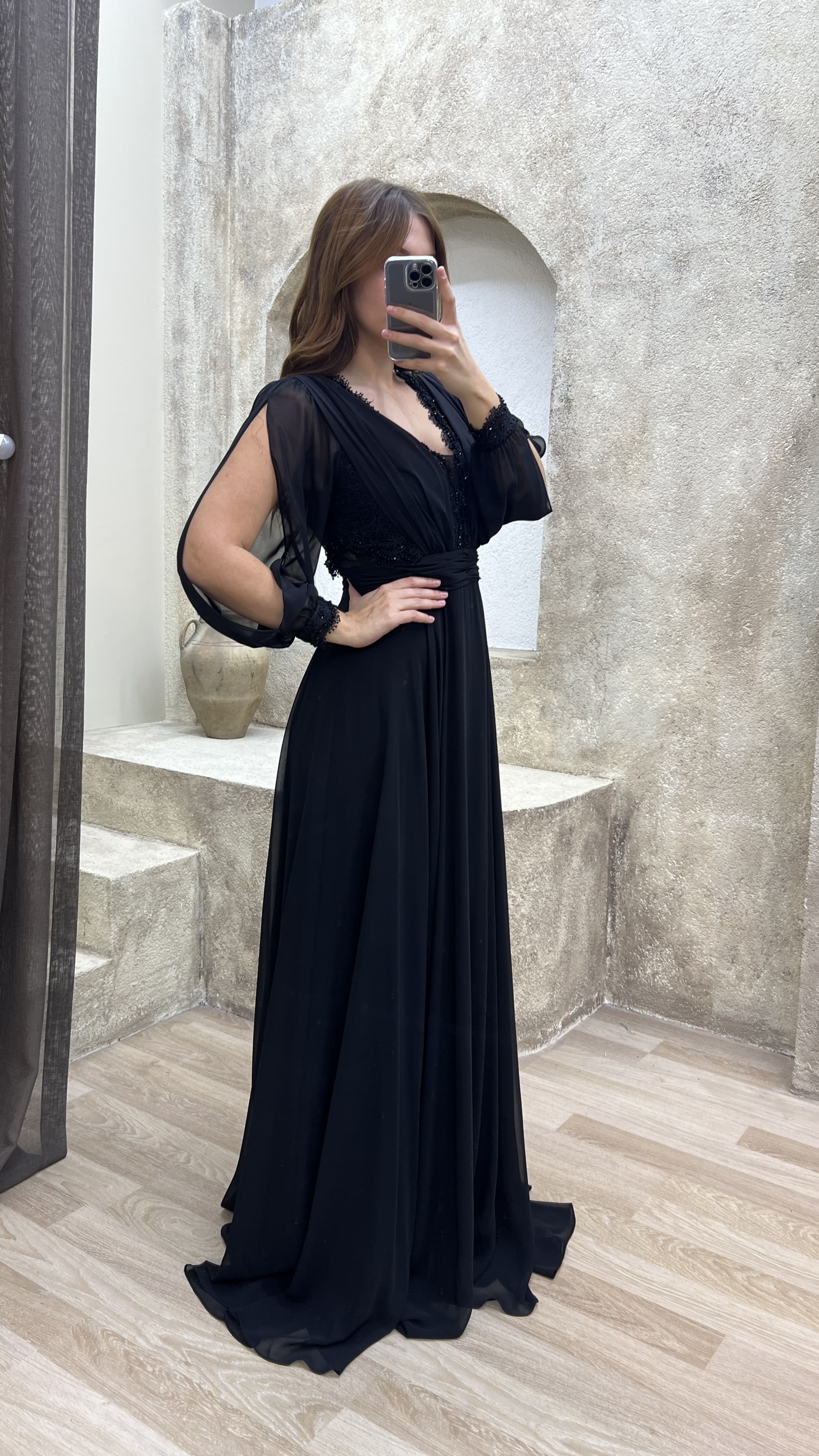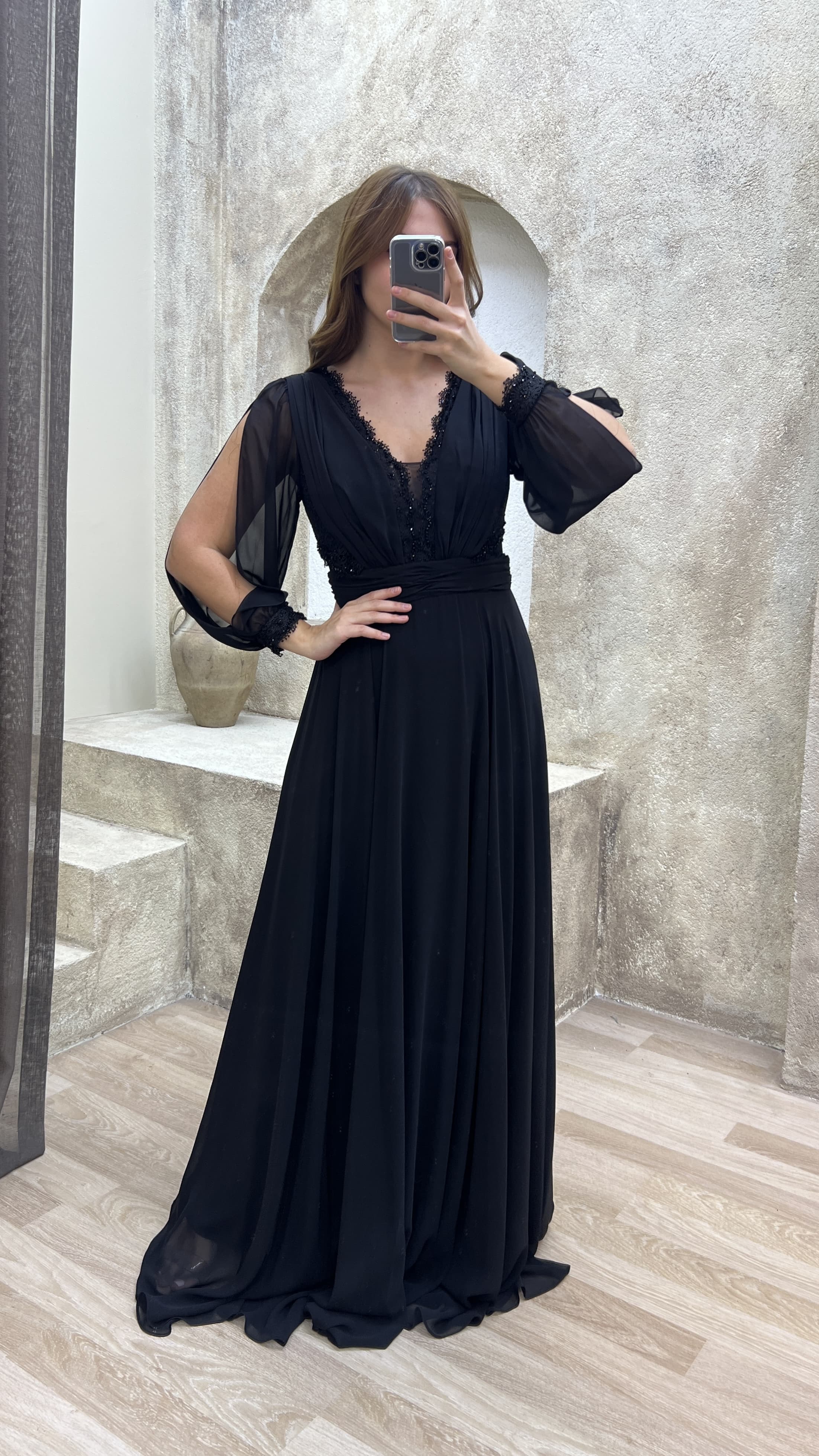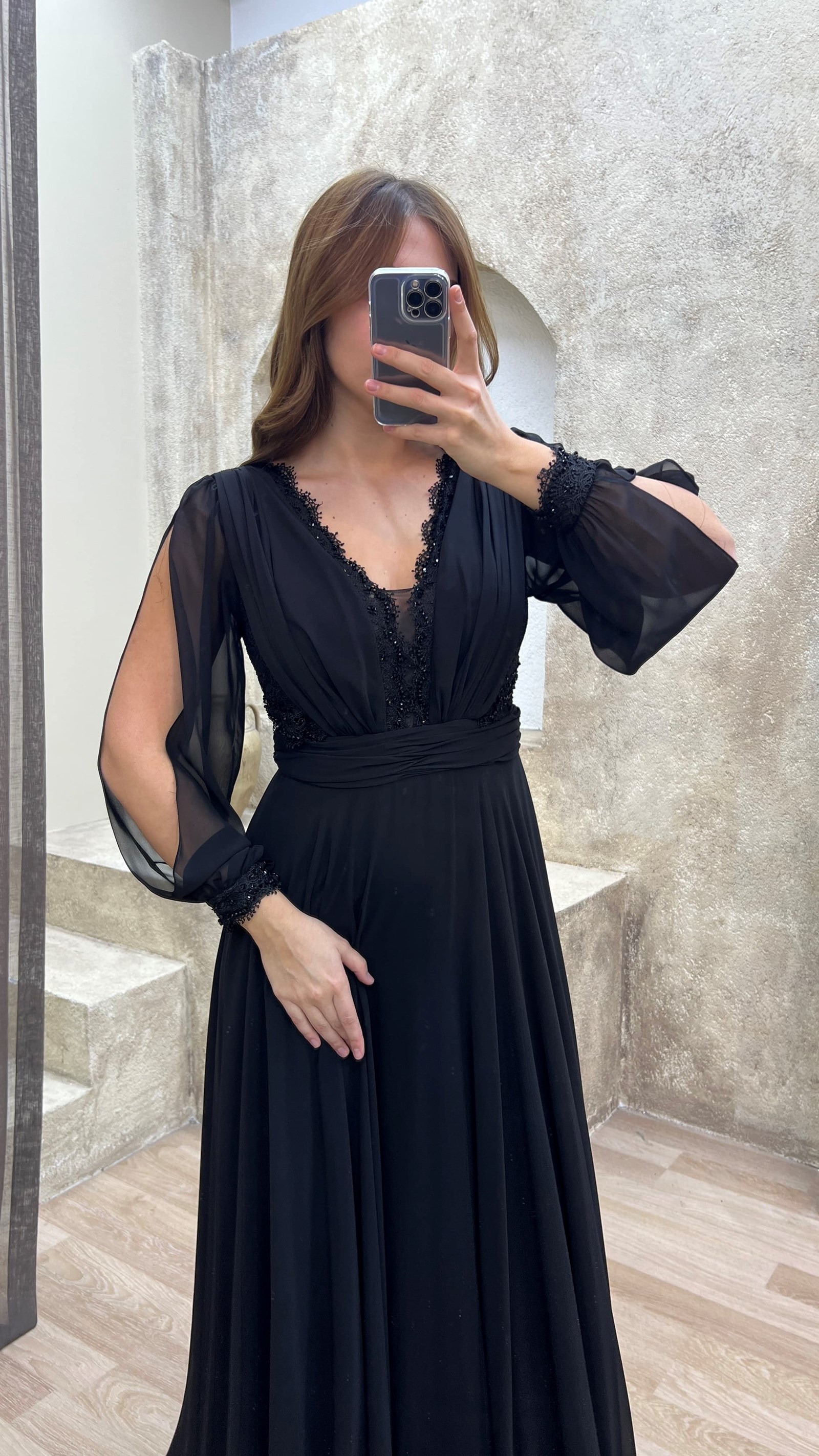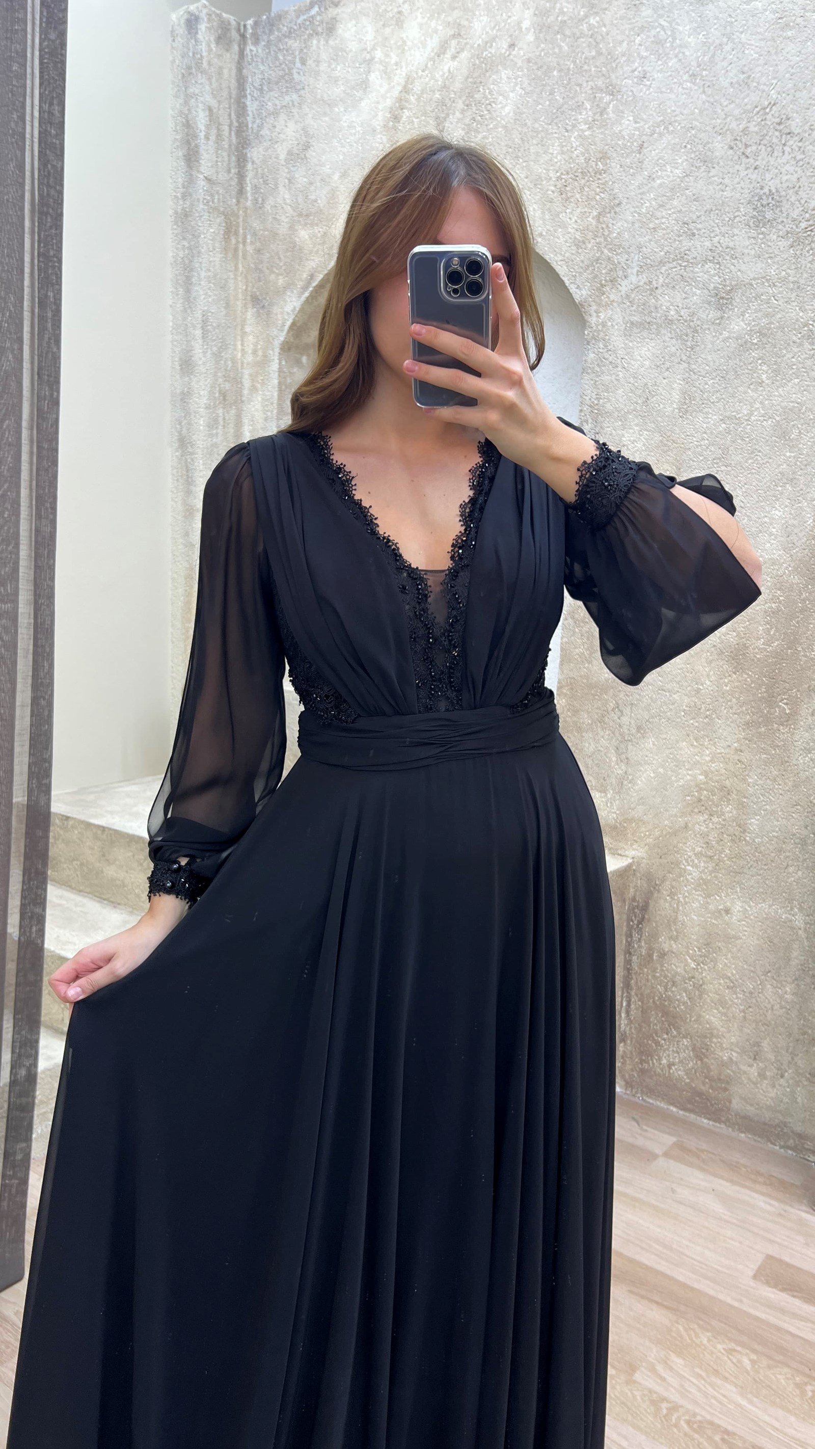 Siyah V Yaka Balon Kol İşlemeli Tasarım Büyük Beden Abiye Elbise