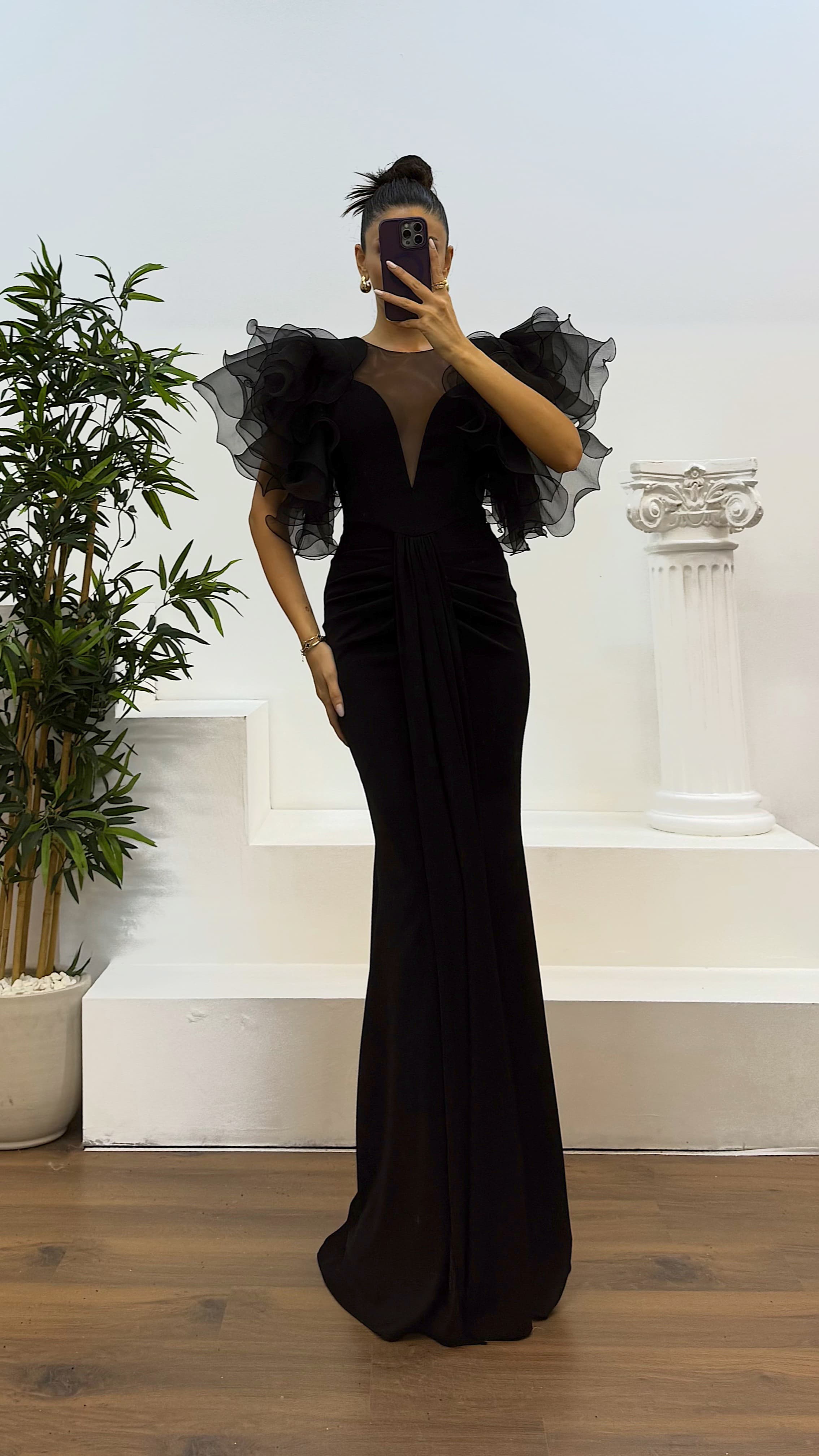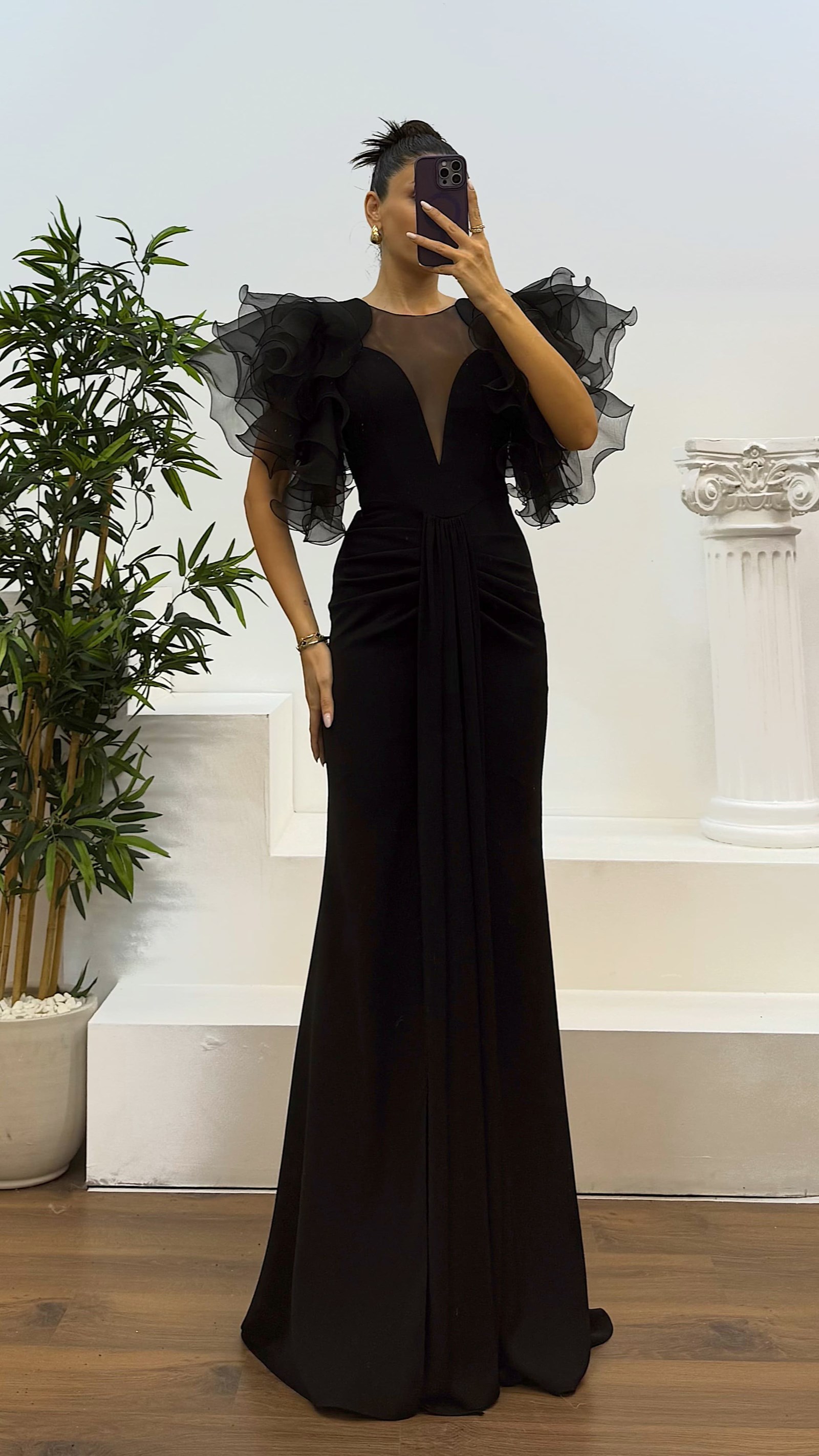 Ürün 36-42 bedene kadar uyumlu, göğüs pedli, astarlı, yırtmaçlı, arka kapama fermuar, bel detay, volanlı abiye olarak tasarlanmıştır.