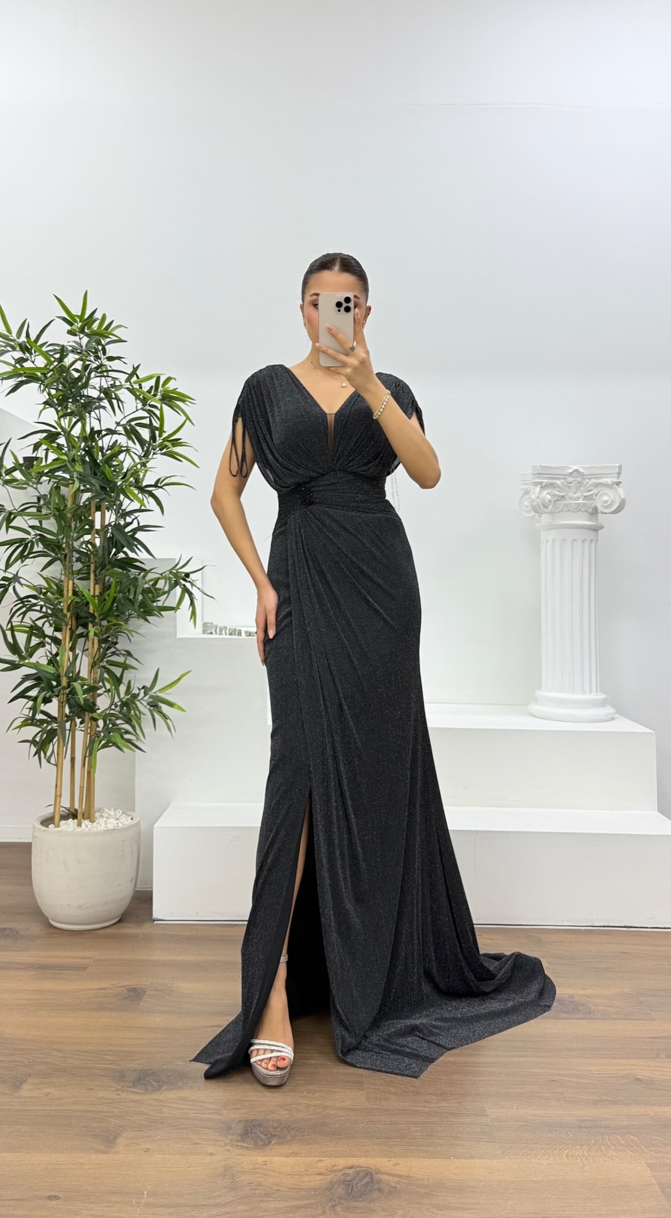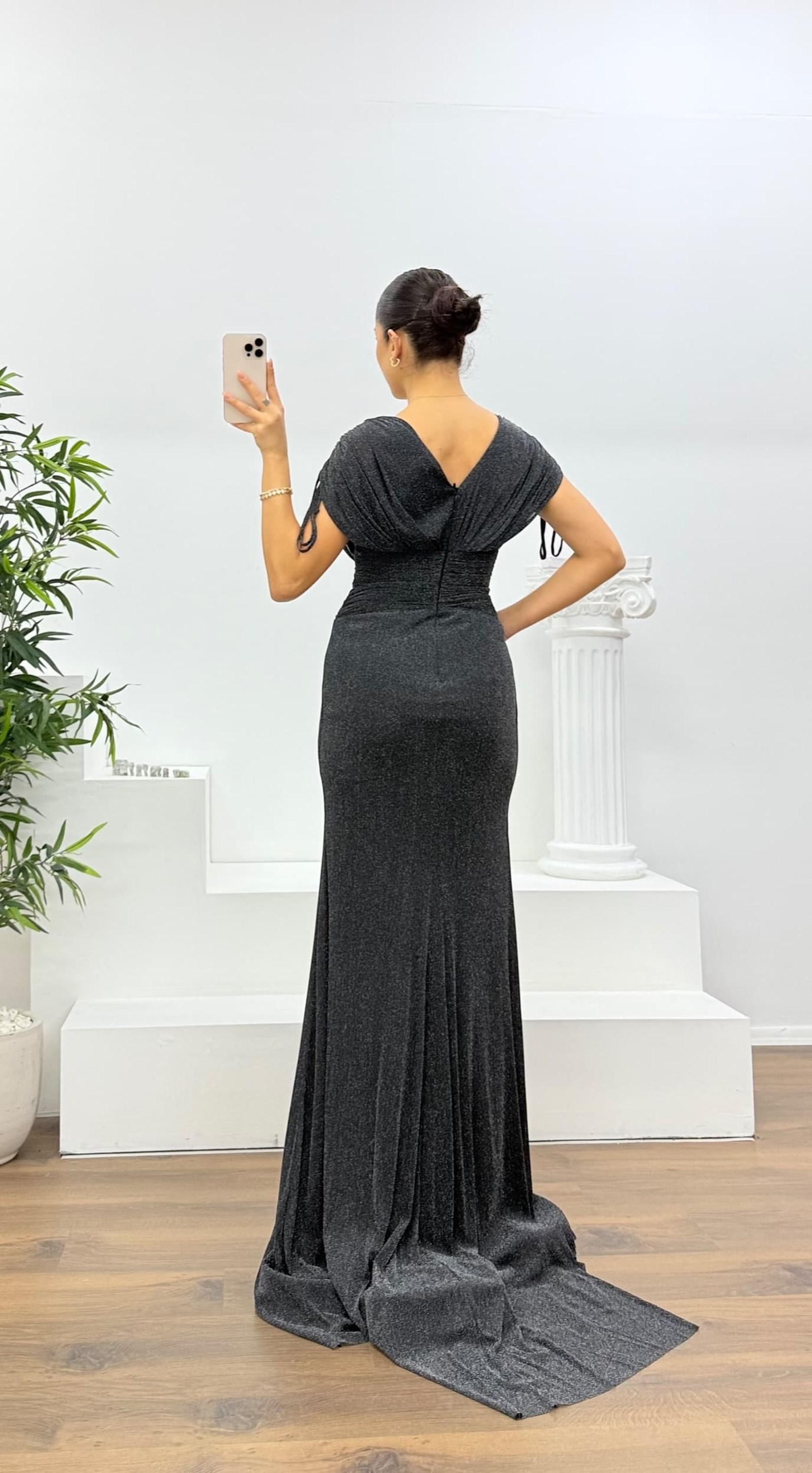• Mürdüm V Yaka Simli Kalın Askılı  Abiye Elbise