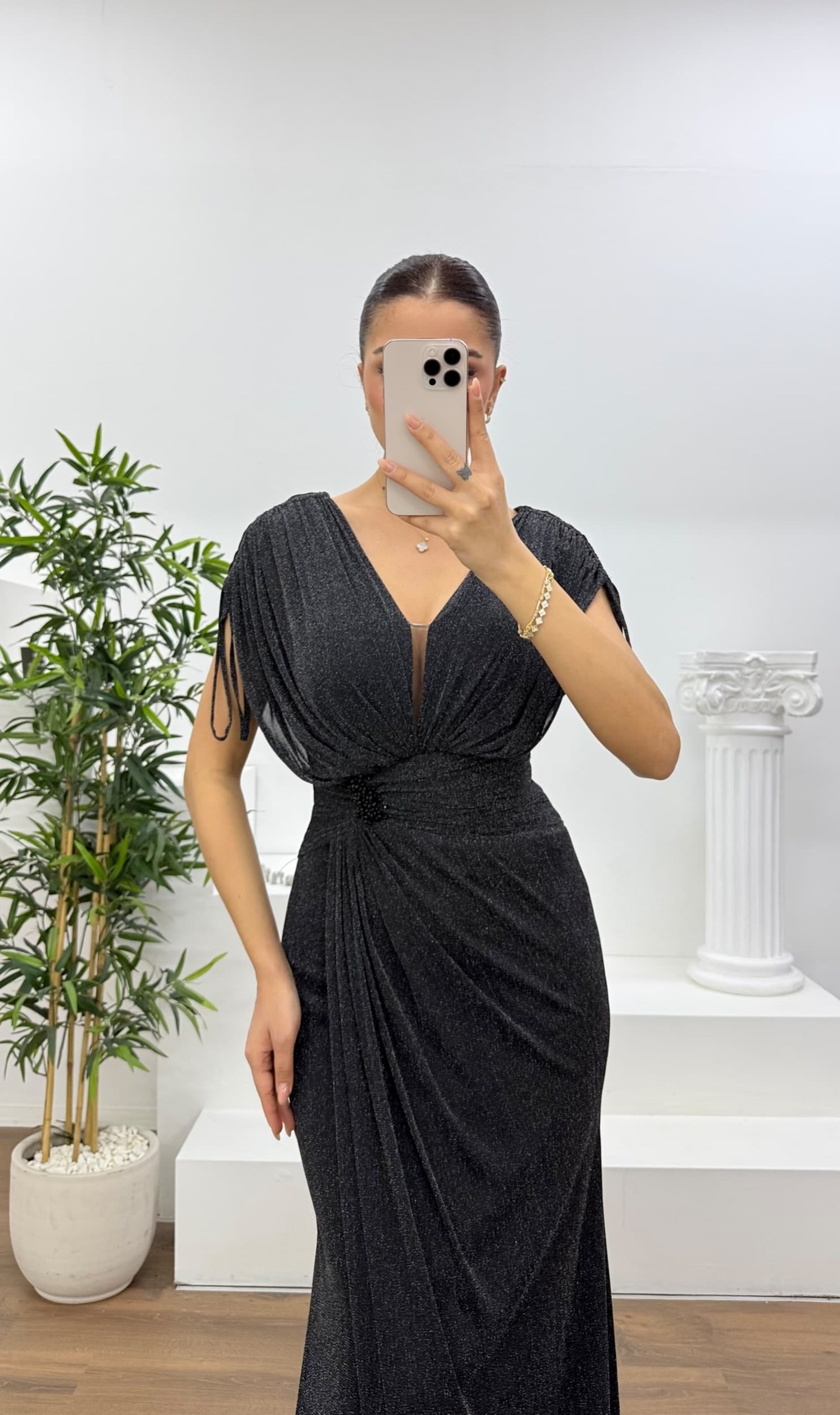 • Siyah V Yaka Simli Kalın Askılı  Abiye Elbise