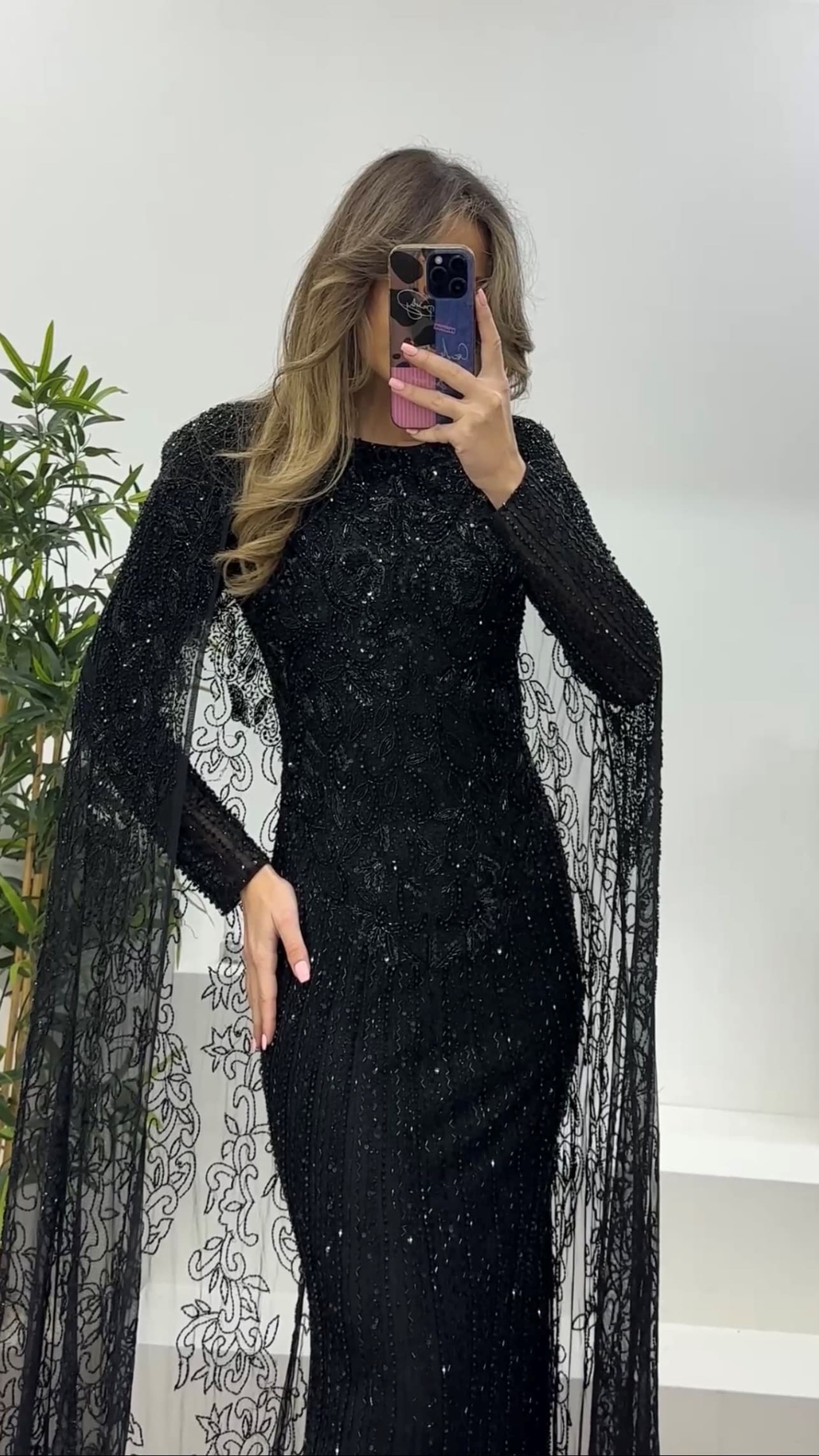 Ürün 36-40 bedene kadar uyumludur. göğüs pedli, astarlı, arka kapama fermuar, uzun kollu, pelerinli, işlemeli abiye olarak tasarlanmıştır.