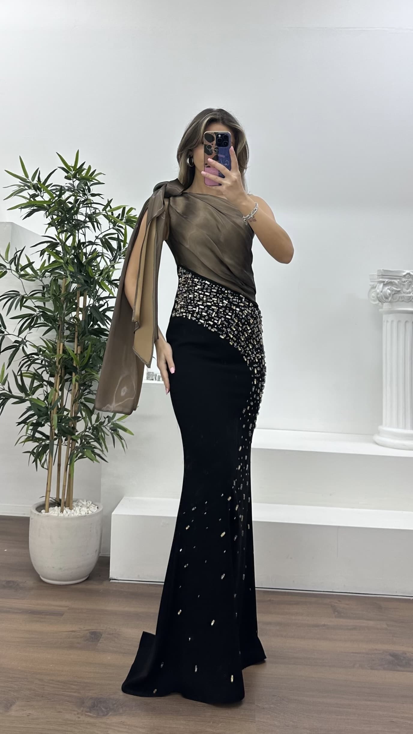 Ürün 36-40 bedene kadar uyumludur. göğüs pedli, astarlı, fermuarlı, drapeli, taş işlemeli abiye olarak tasarlanmıştır.