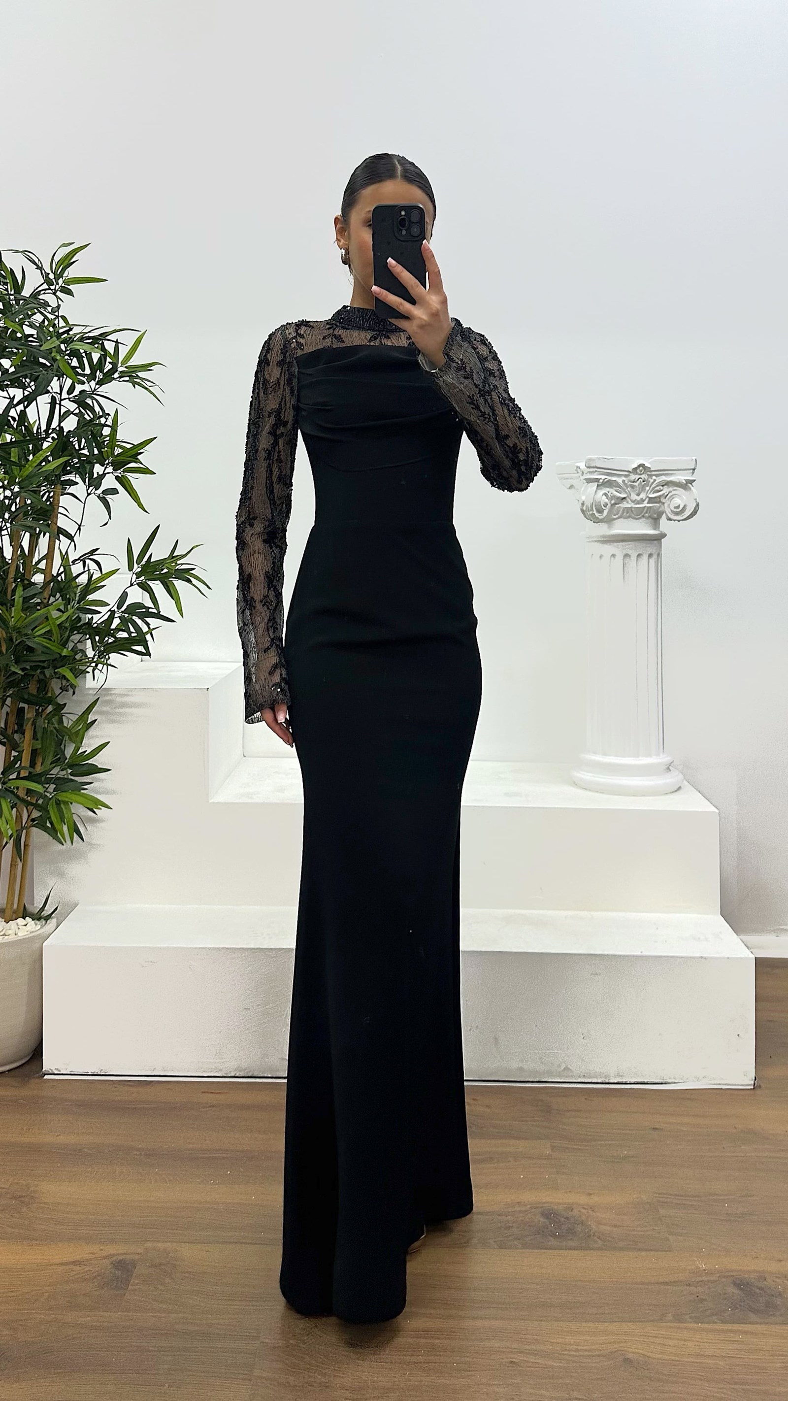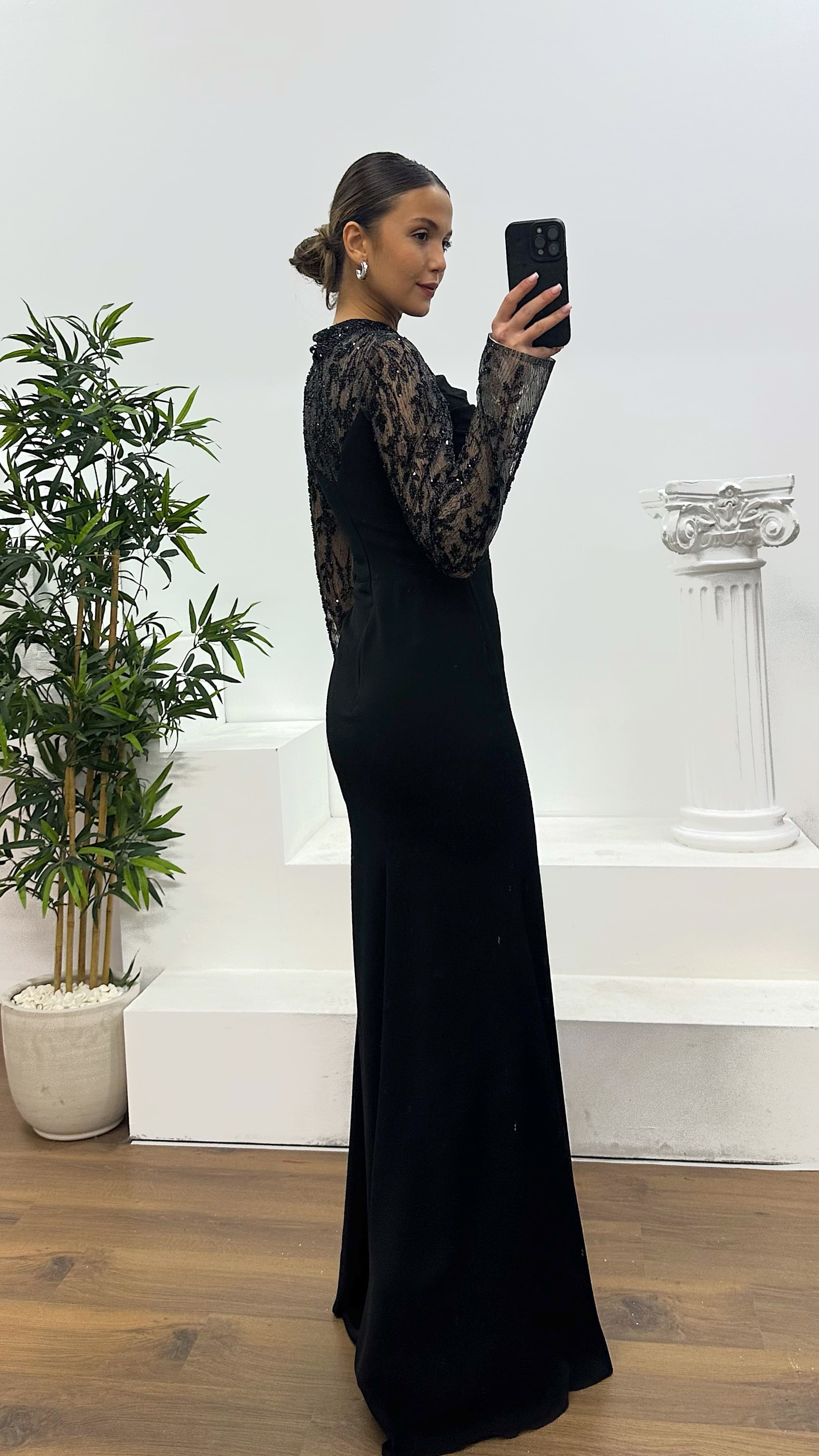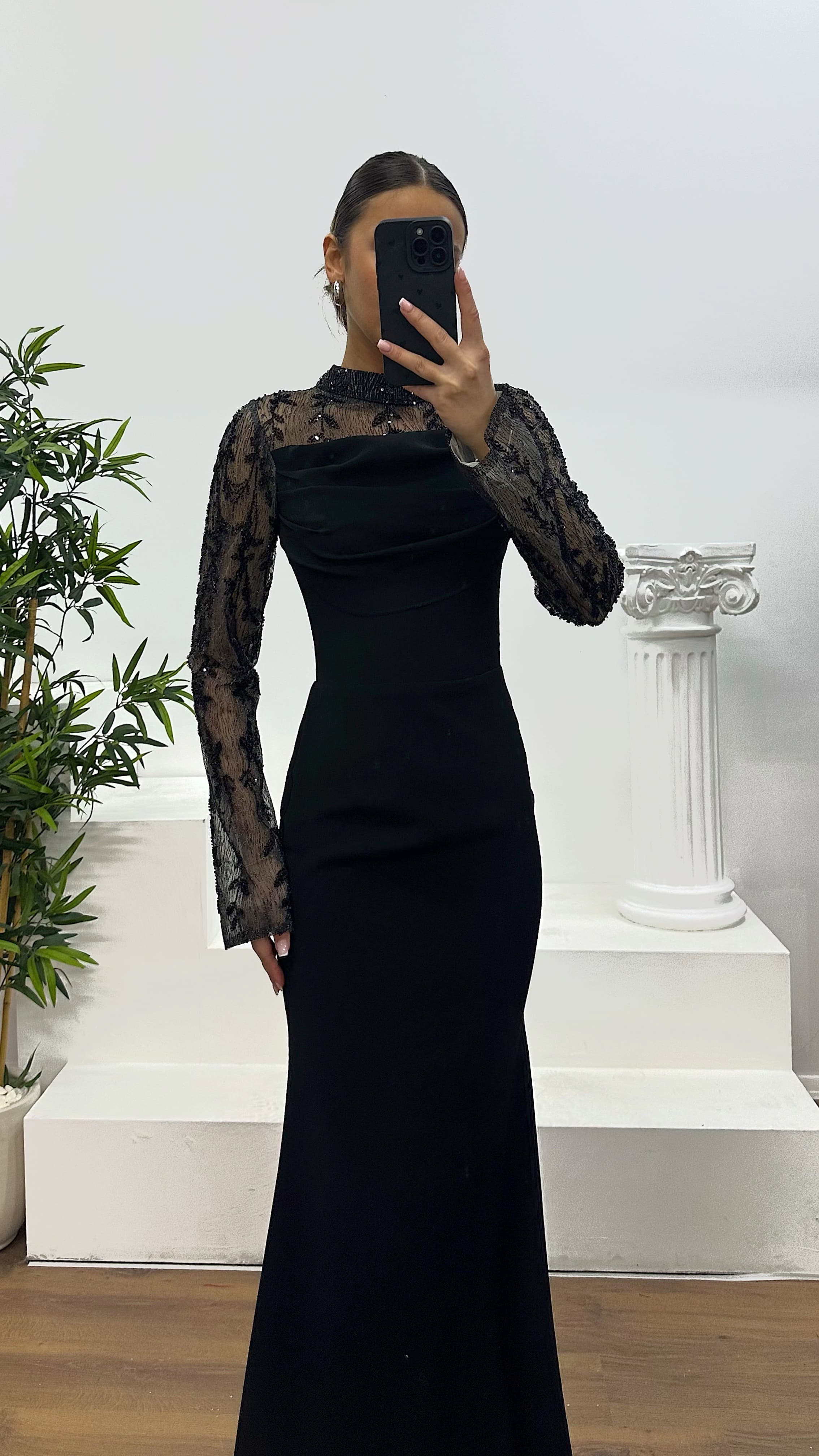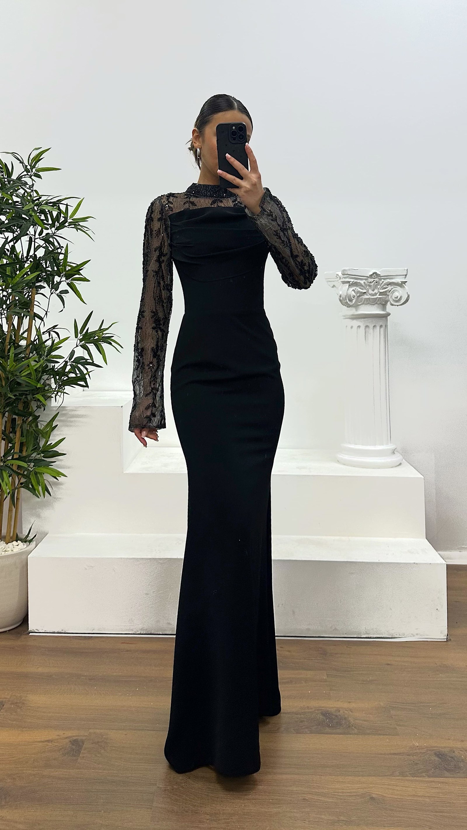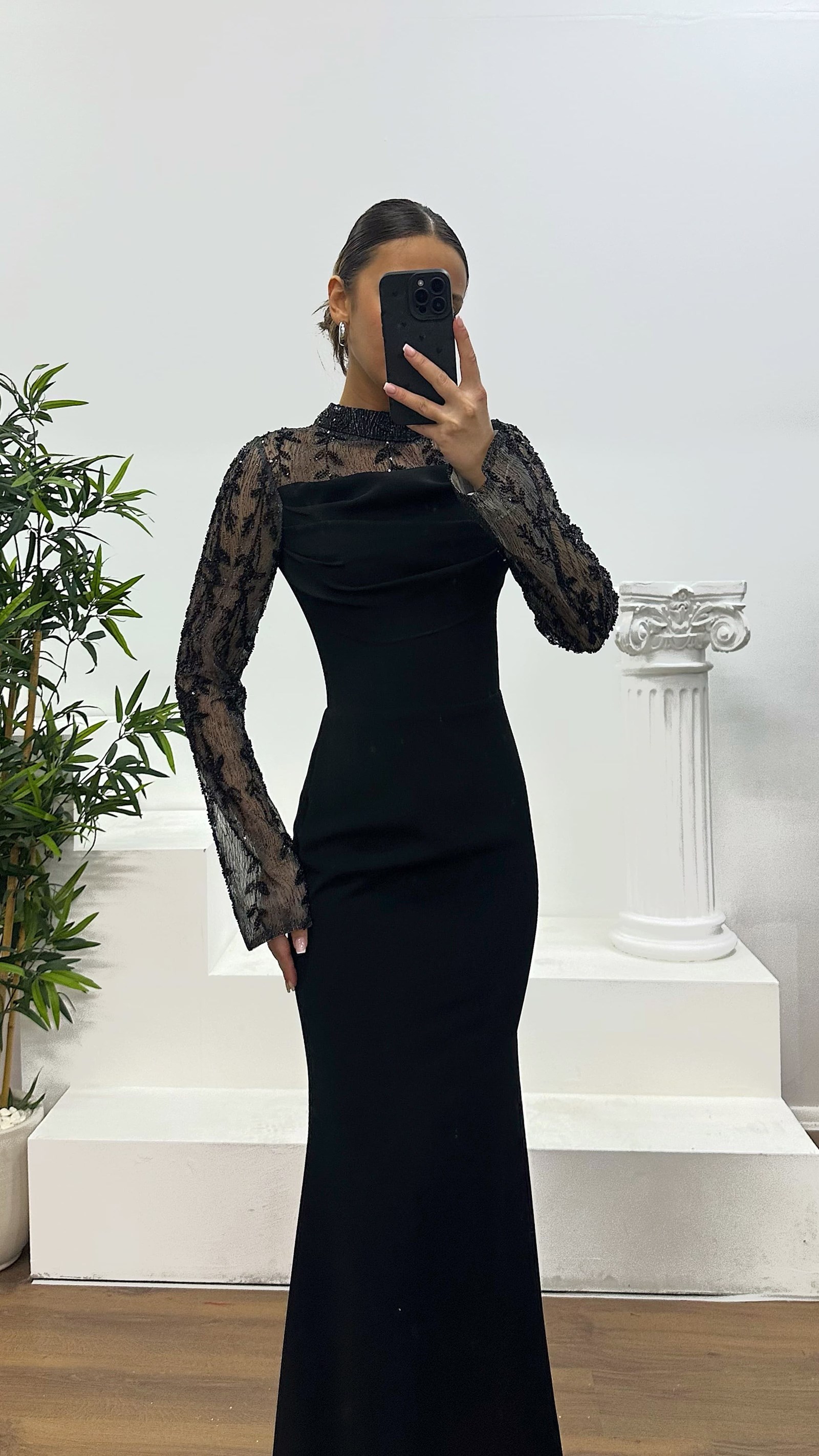 • Siyah Yaka Transparan Detay Abiye Elbise