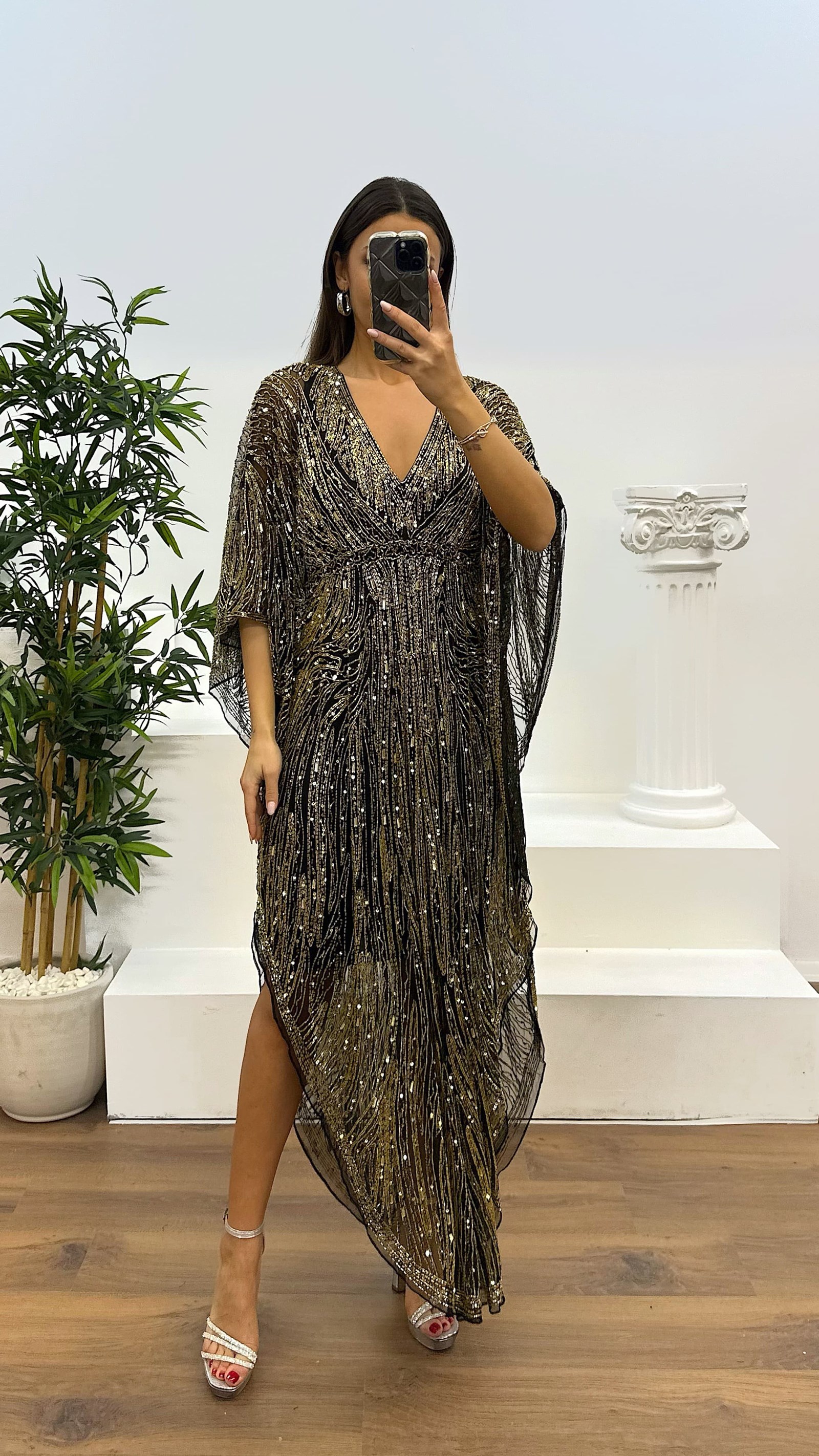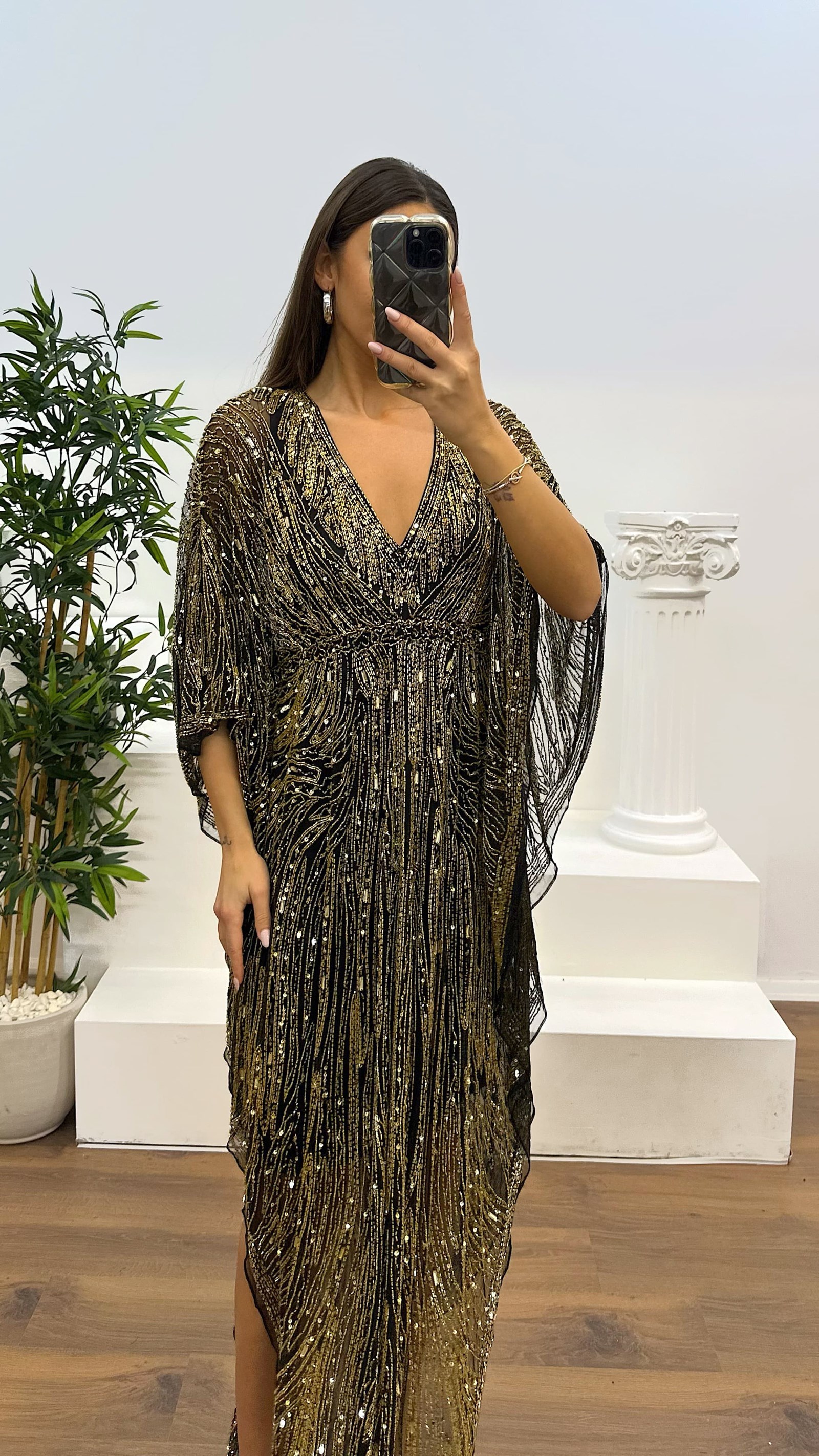 Ürün standart beden, göğüs pedli, astarlı, yarasa kol el işlemeli abiye olarak tasarlanmıştır.