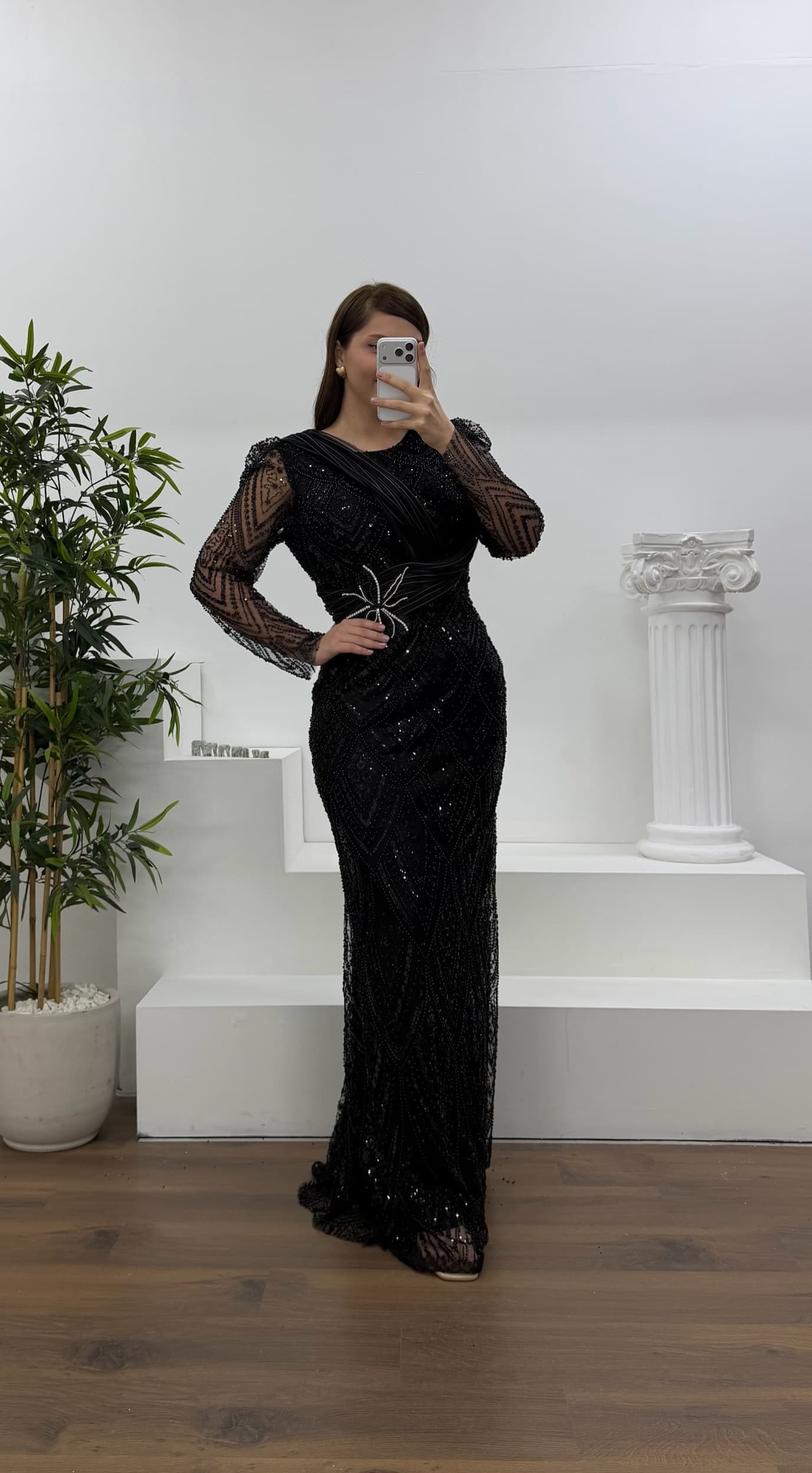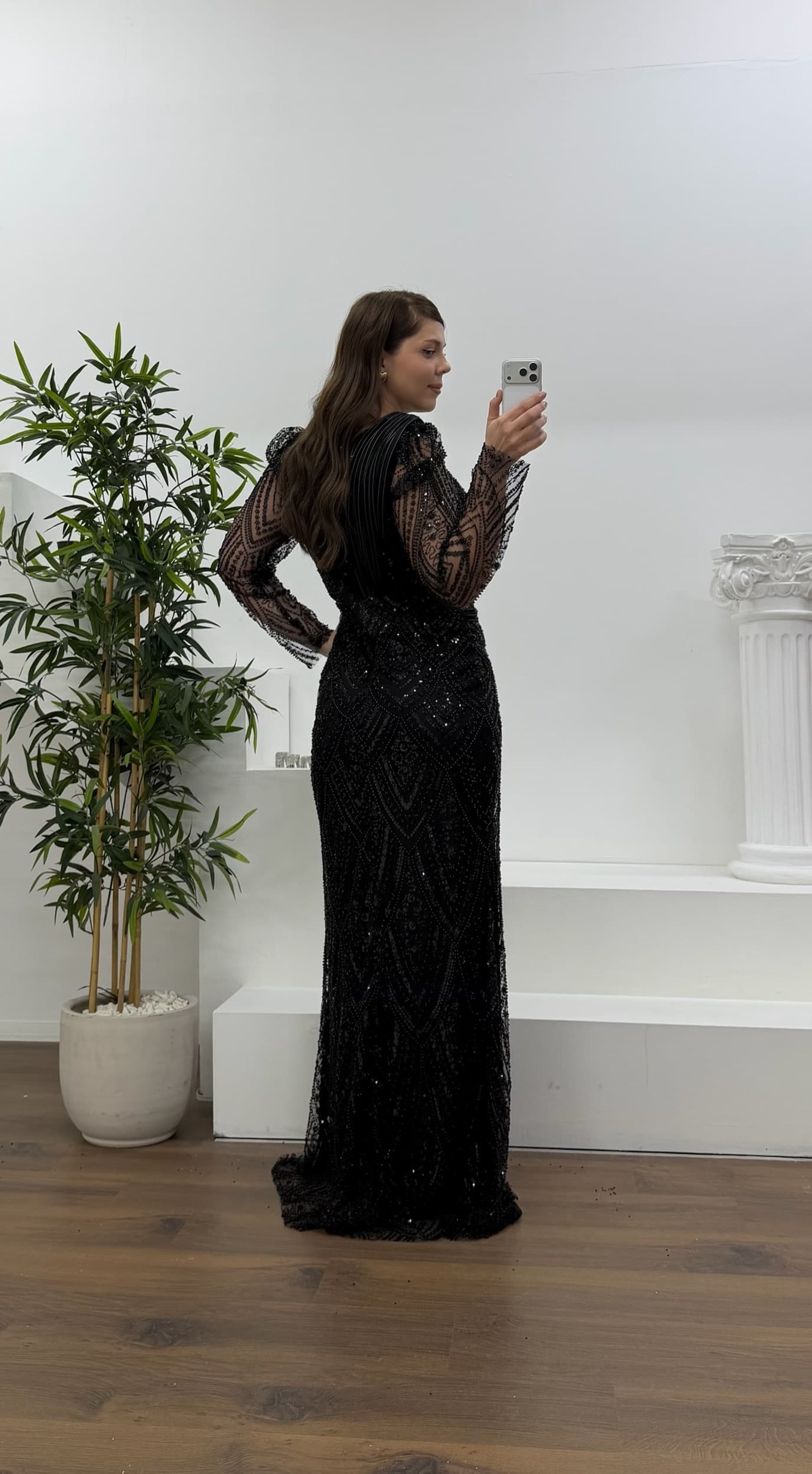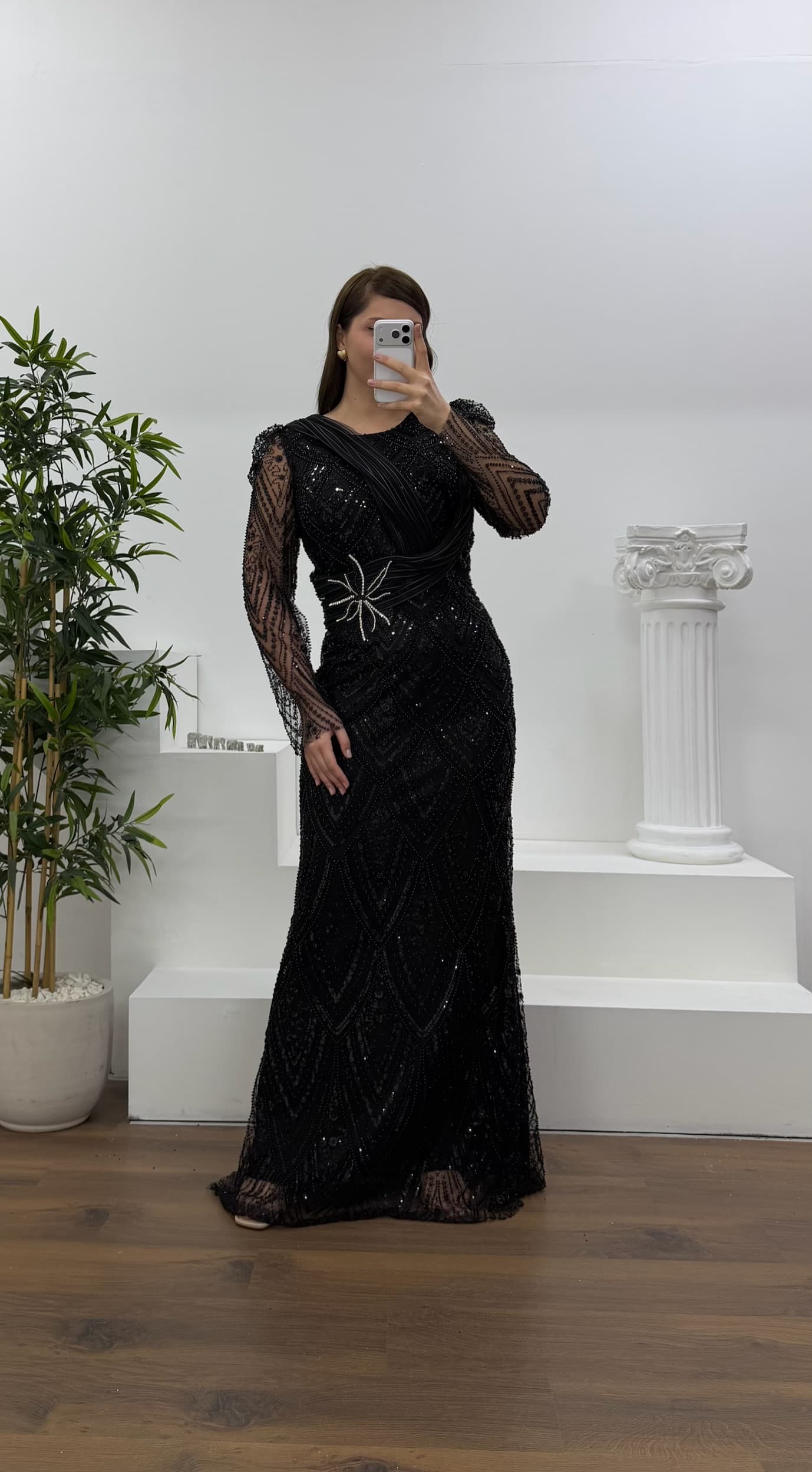 • Siyah Yıldız Boncuk İşlemeli Kolları Tül Detaylı Büyük Beden Abiye Elbise