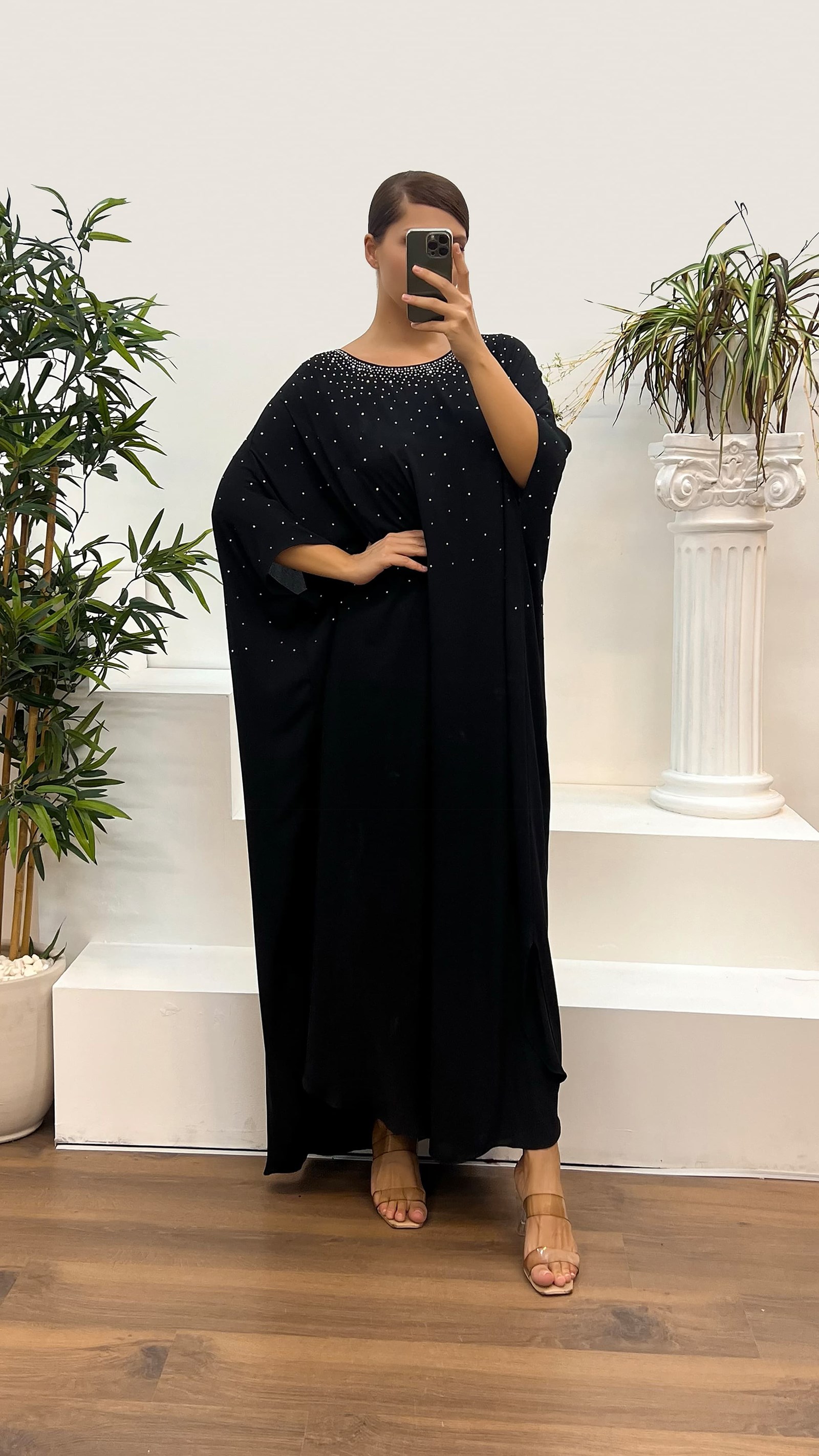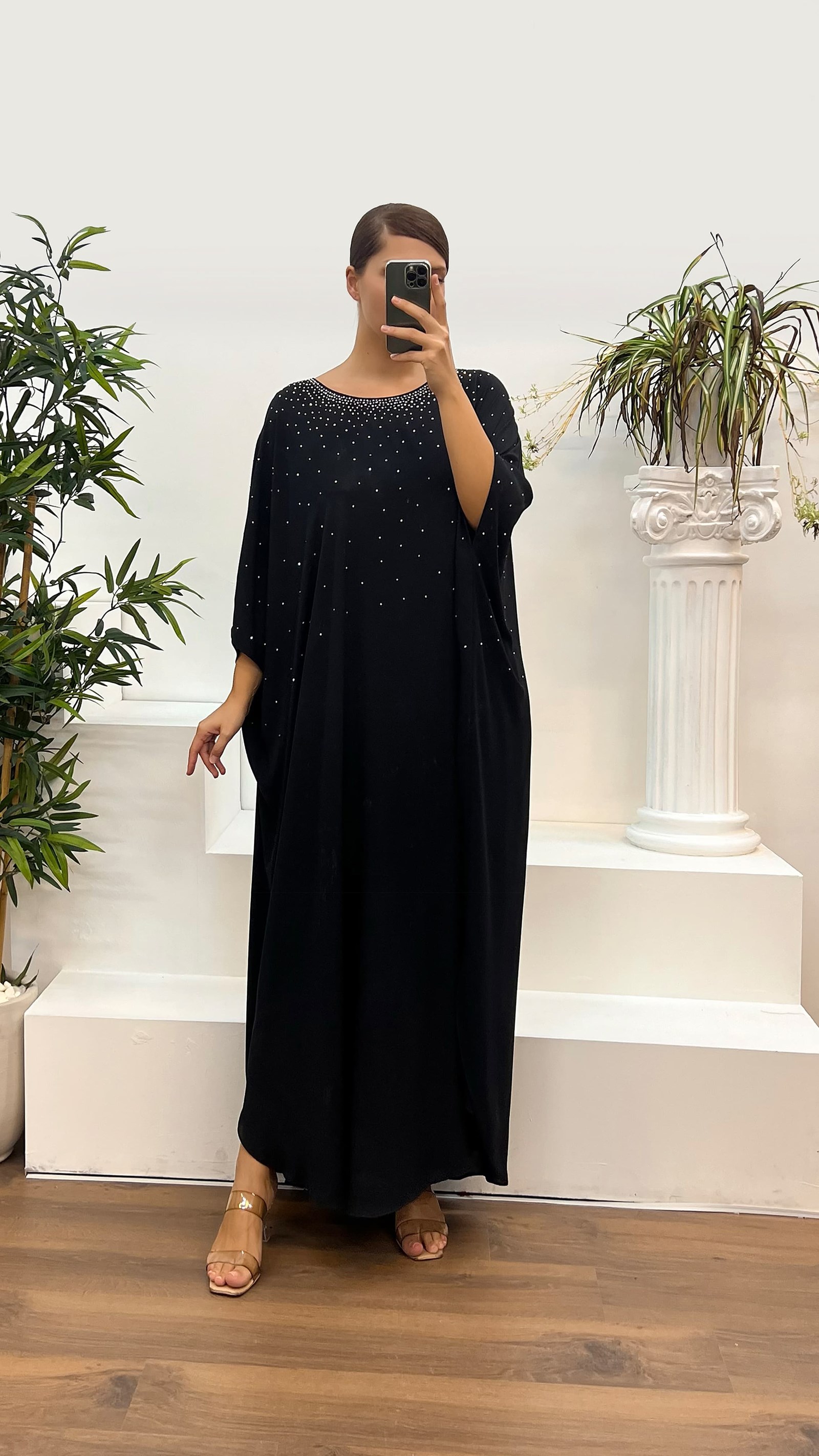 • Siyah Yuvarlak Yaka Taş Detay Büyük Beden Abiye Elbise