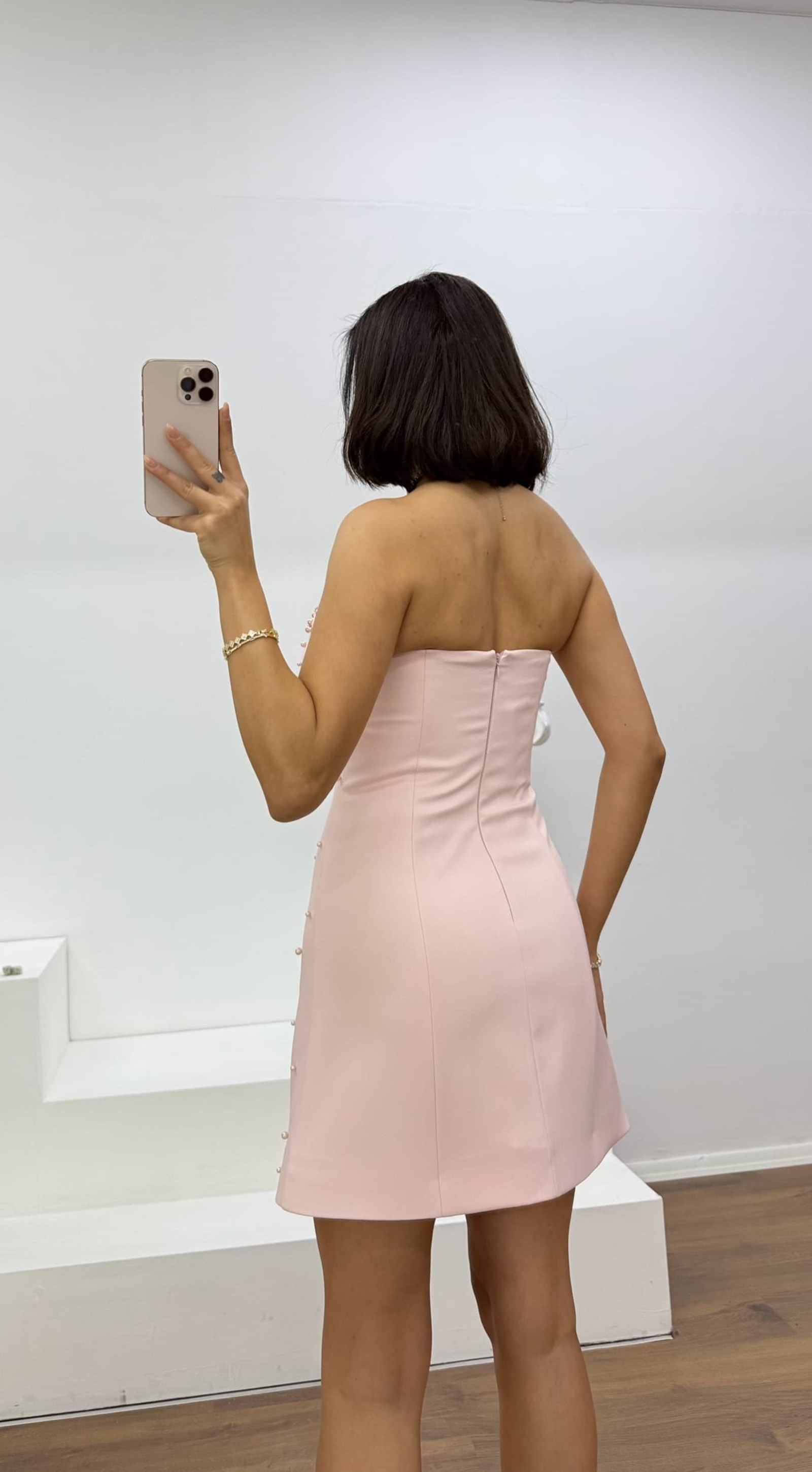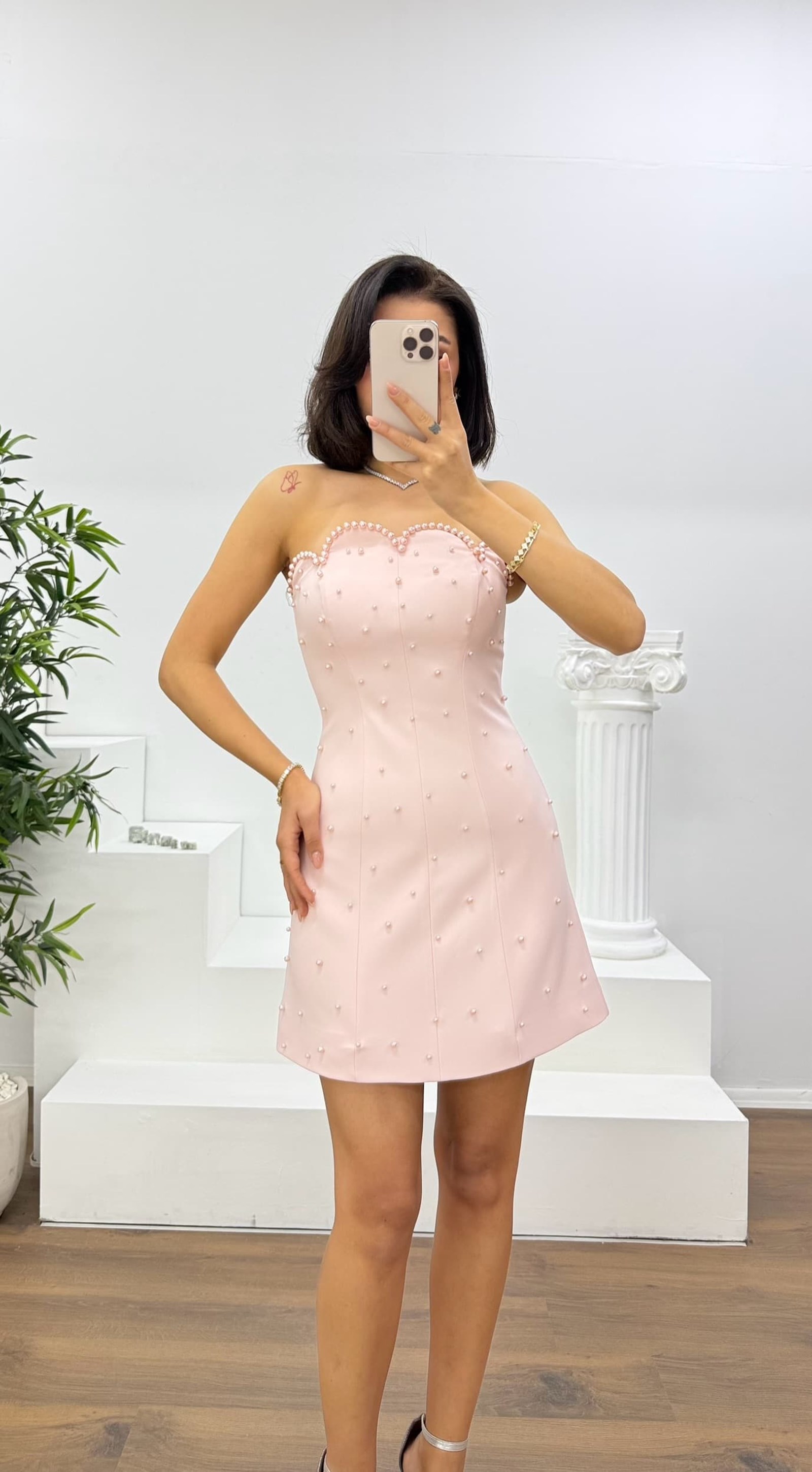 • Kemik İnci Detaylı Kalp Yaka Straplez Mini Abiye Elbise