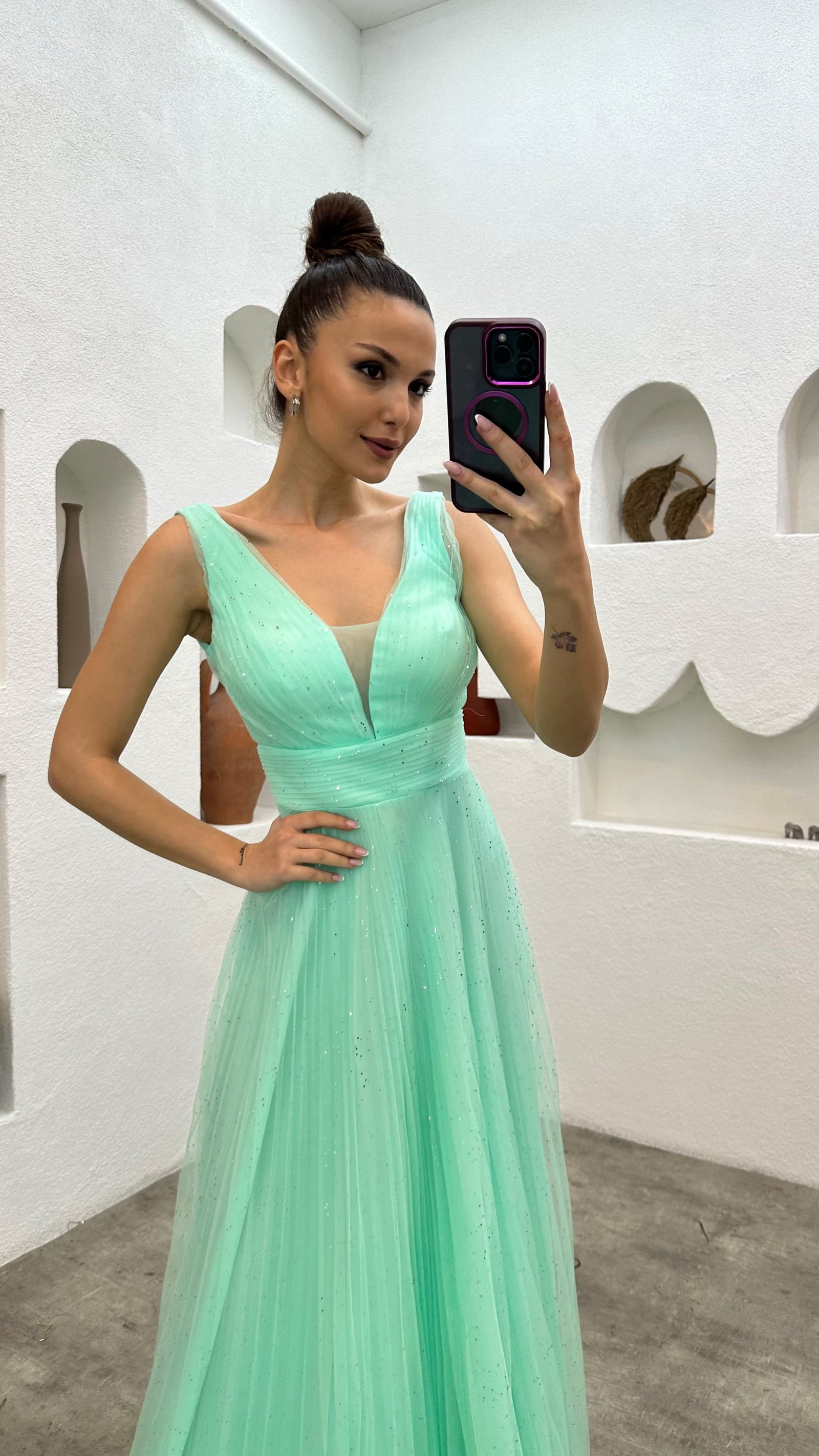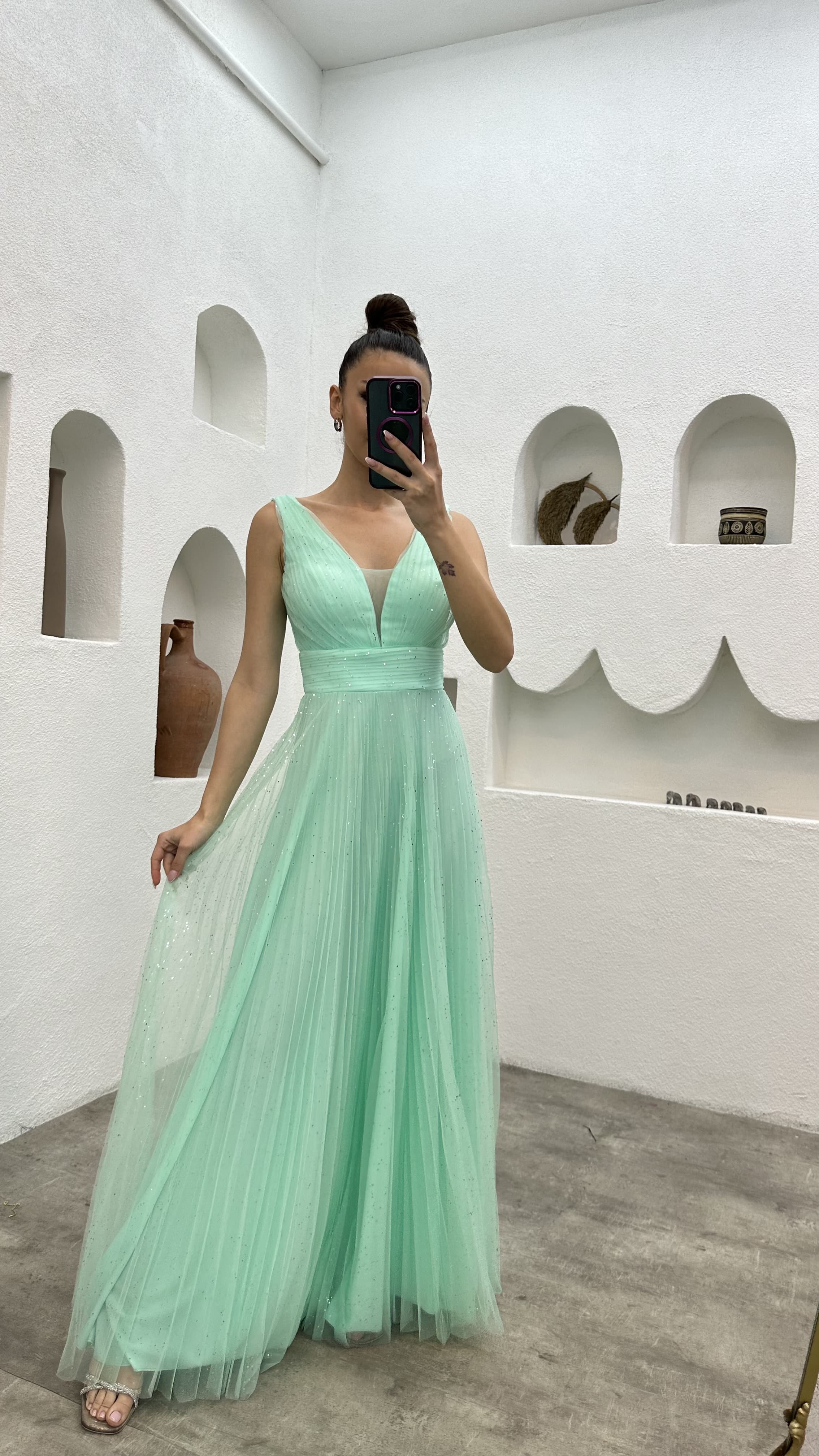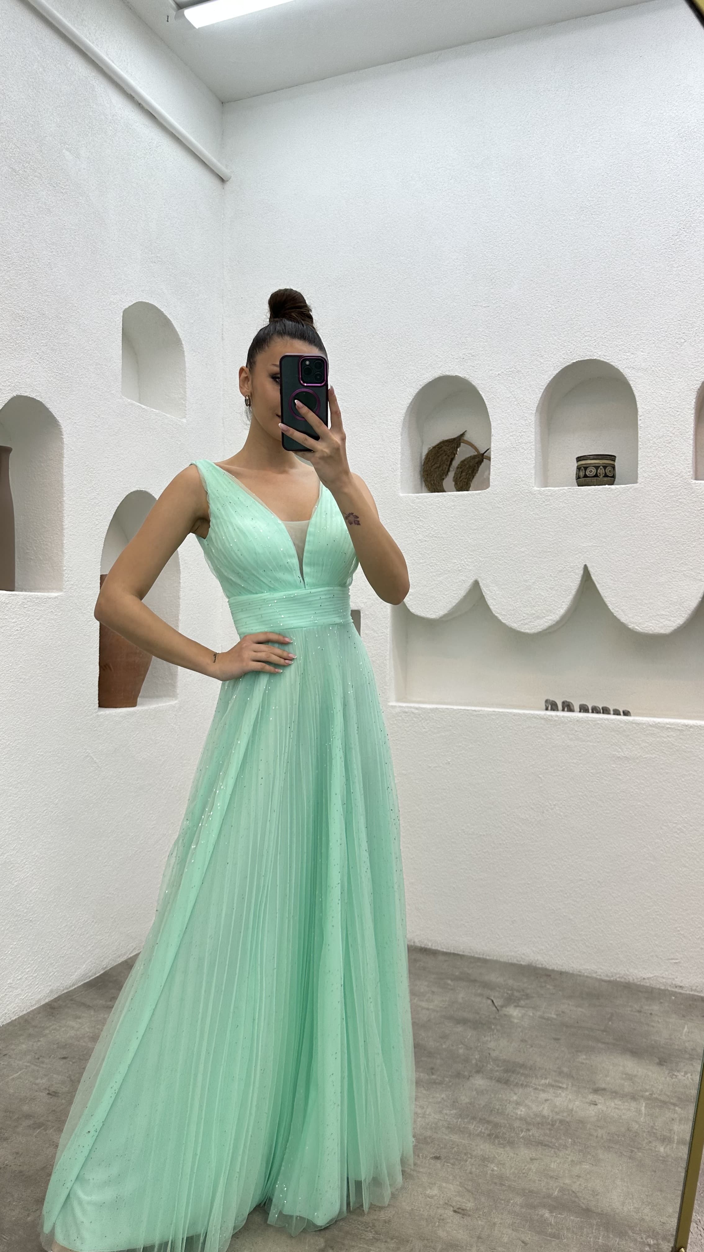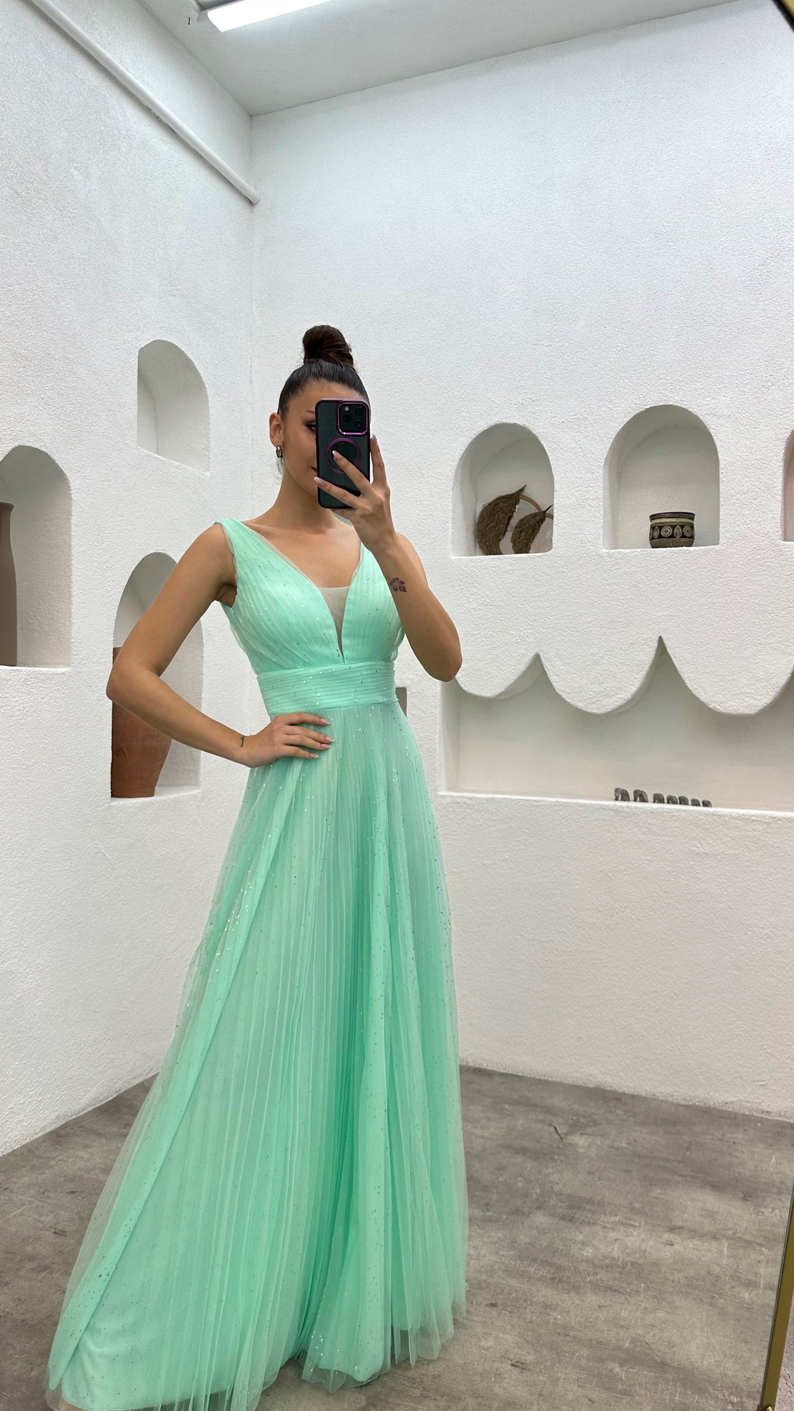 Su Yeşili Simli Tül Abiye Elbise
