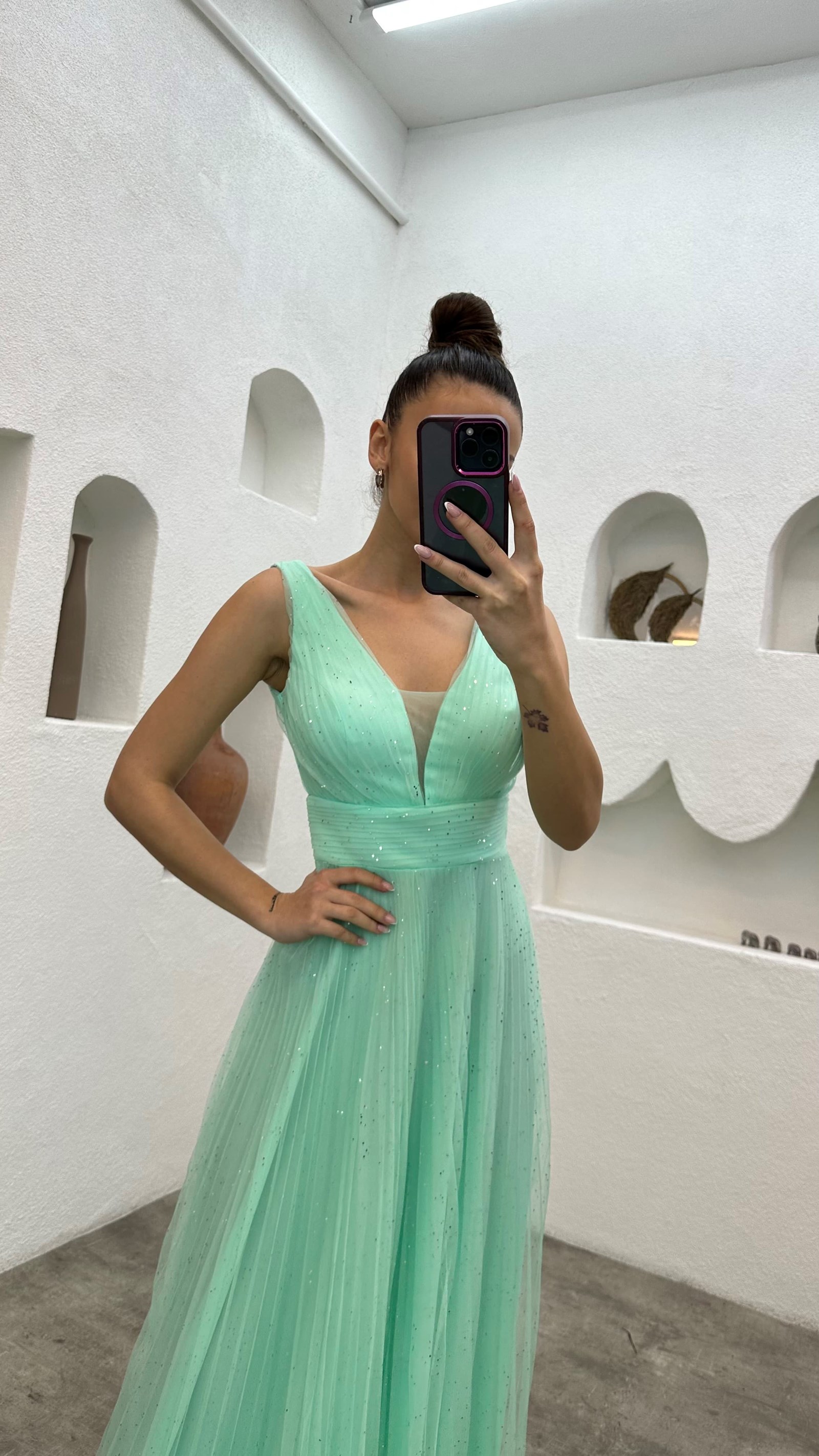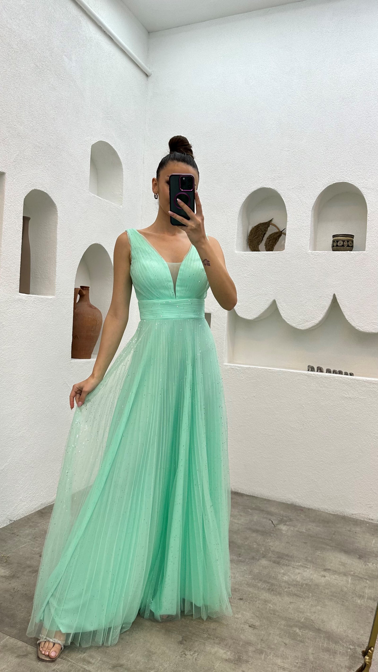 • Su Yeşili Simli Tül Abiye Elbise