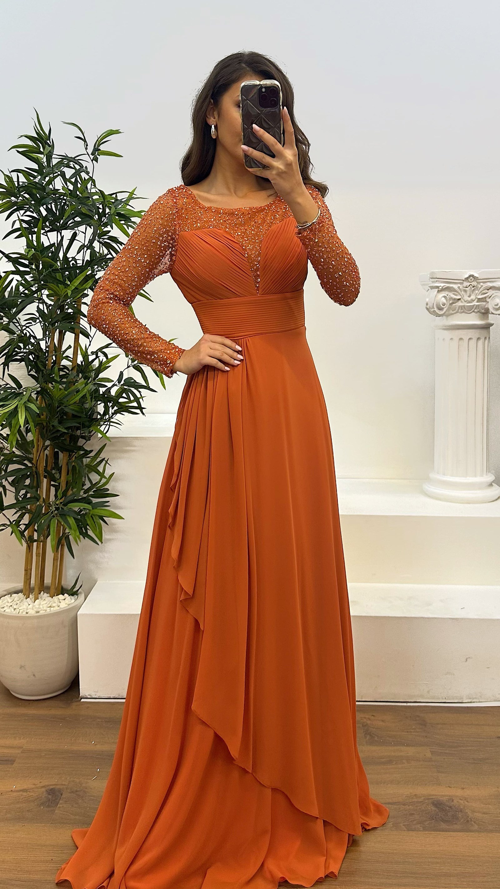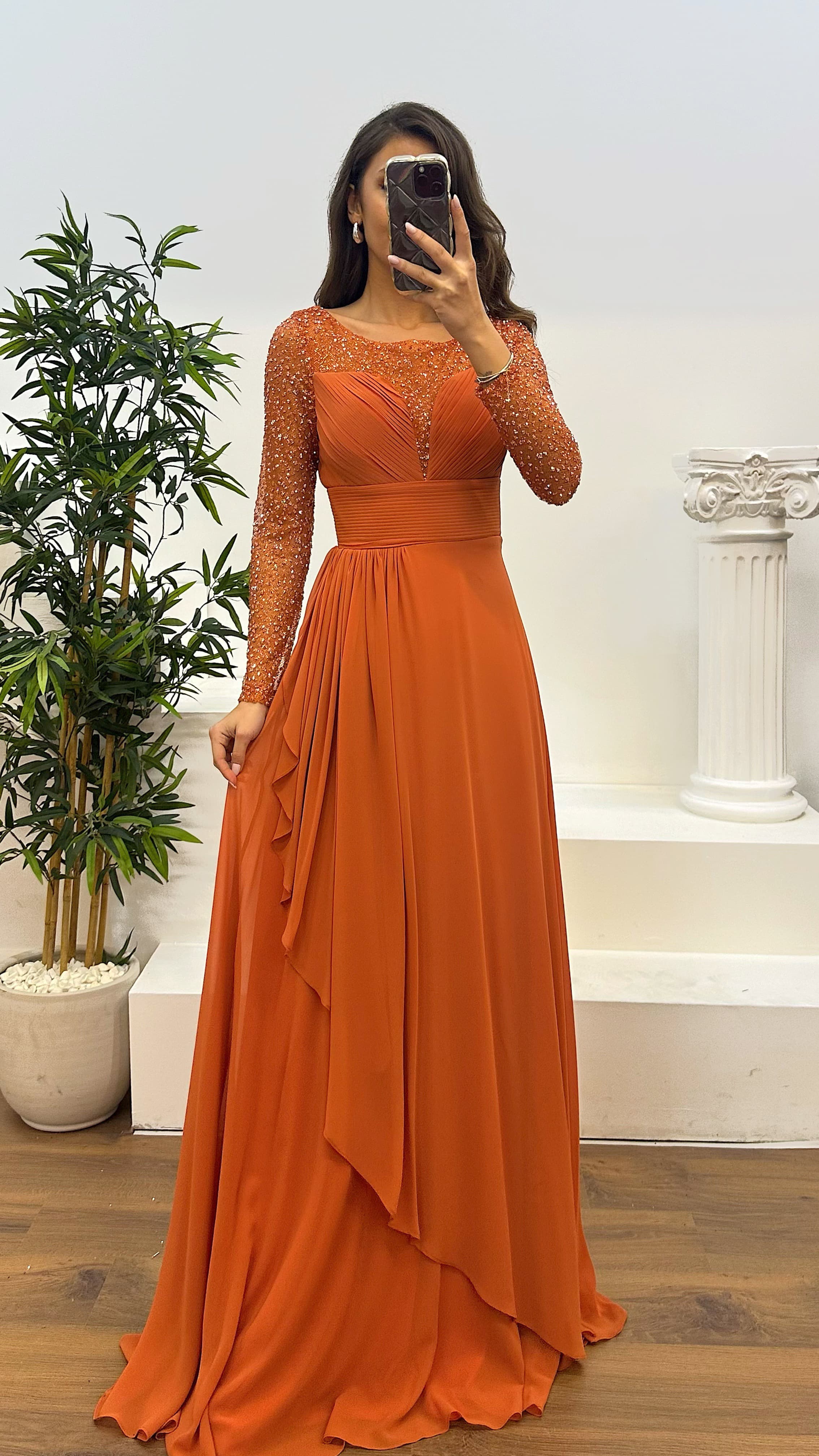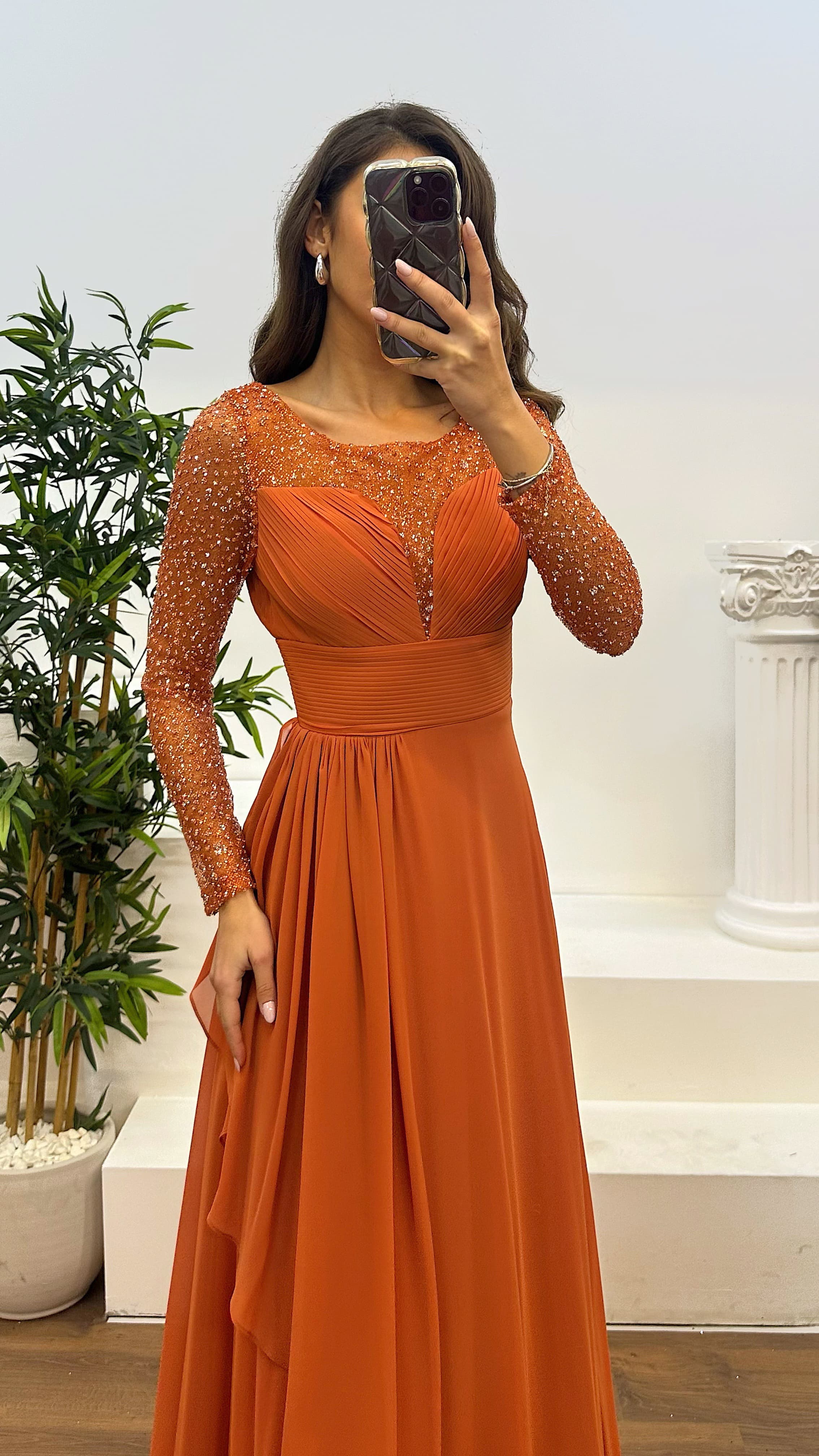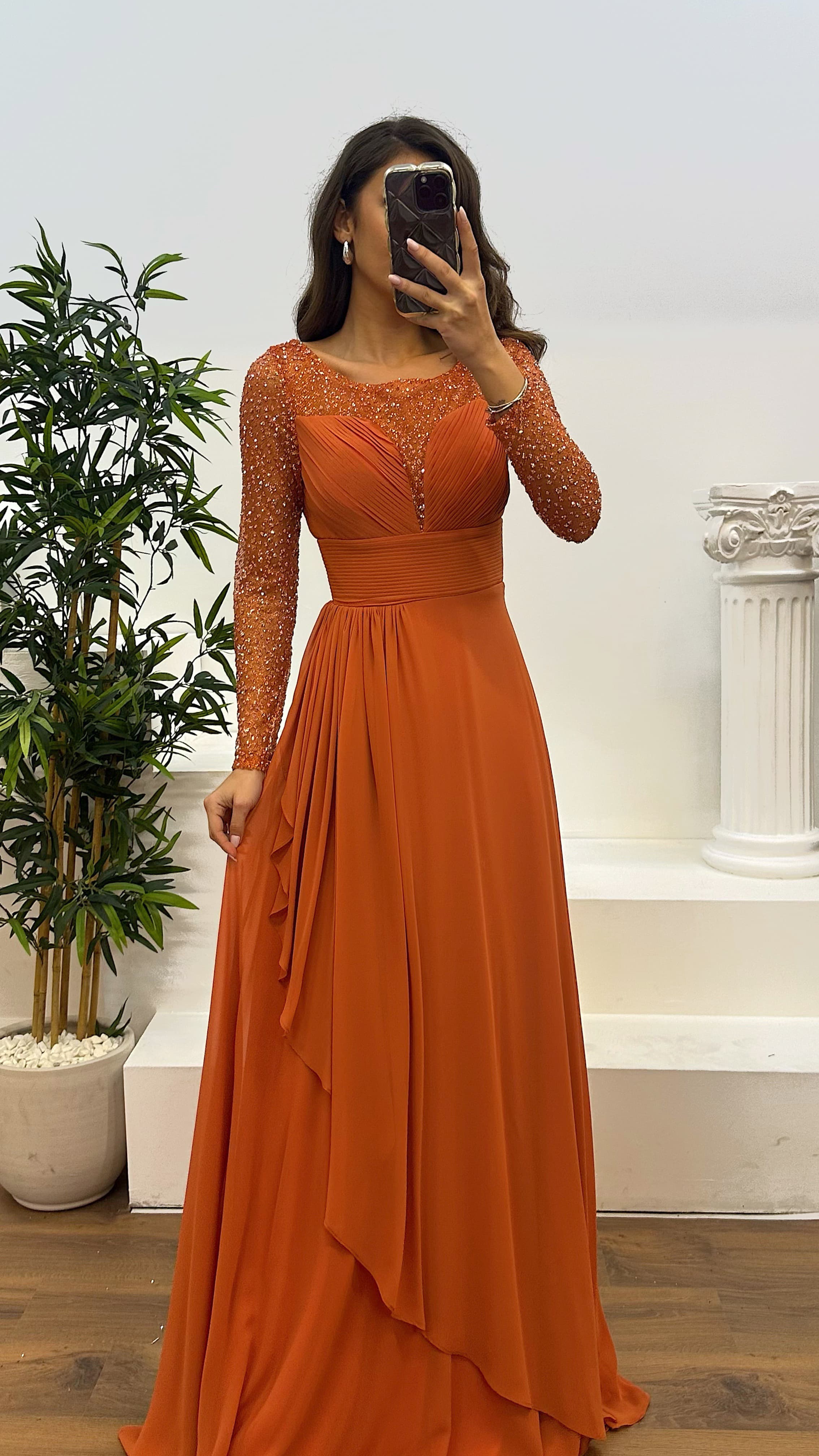 • Tarçın Transparan Detay Şifon Abiye Elbise