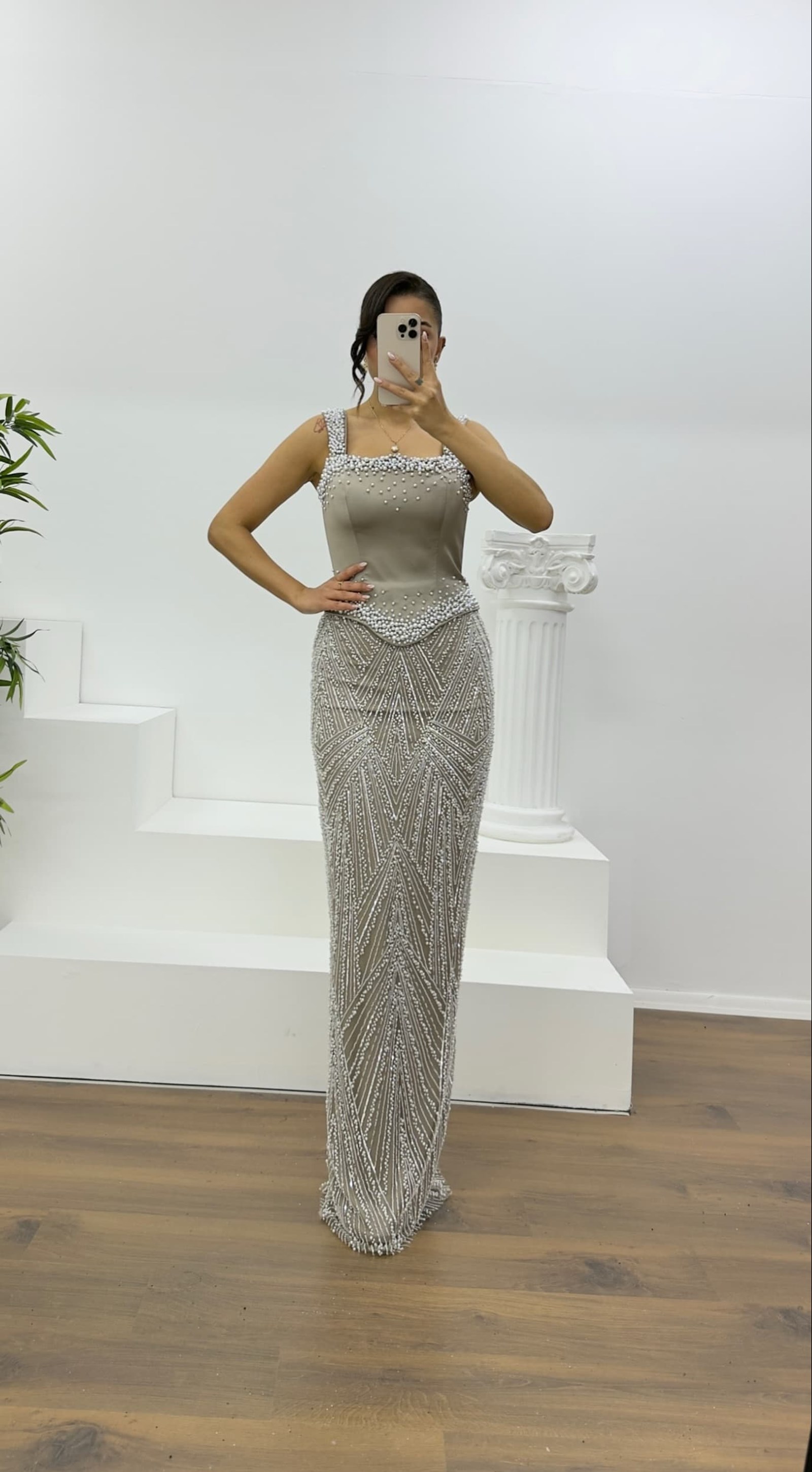 • Cappuccıno Boncuk İşlemeli Abiye Elbise