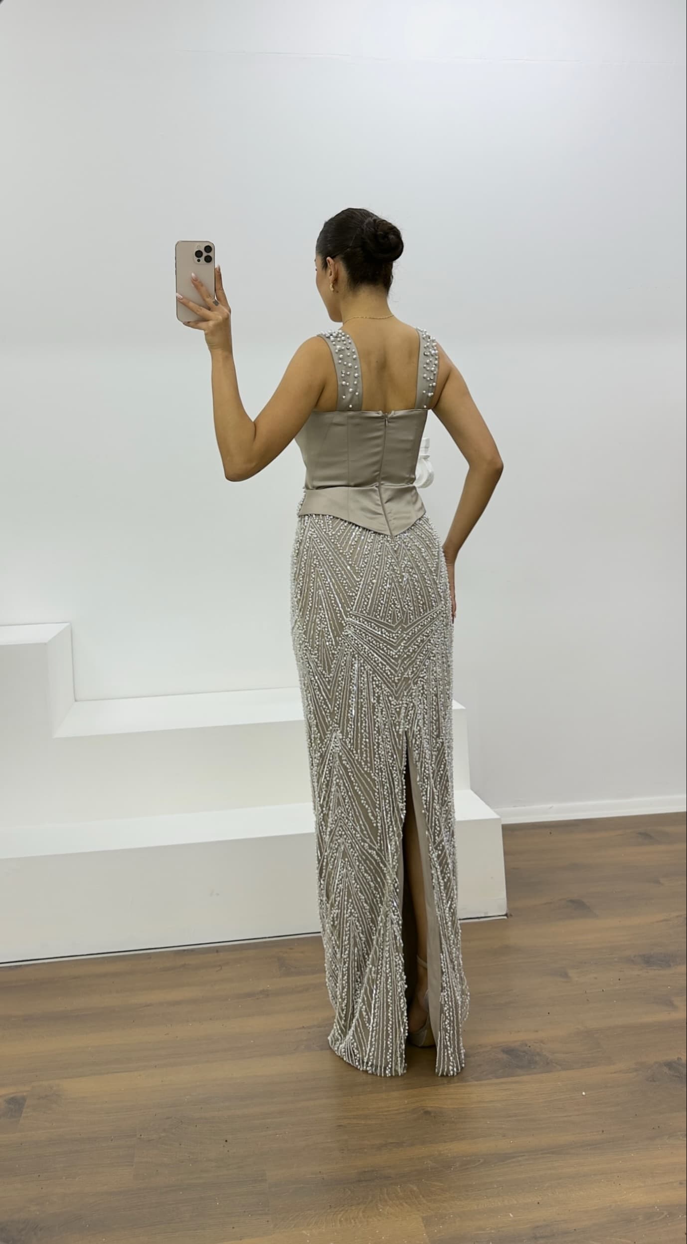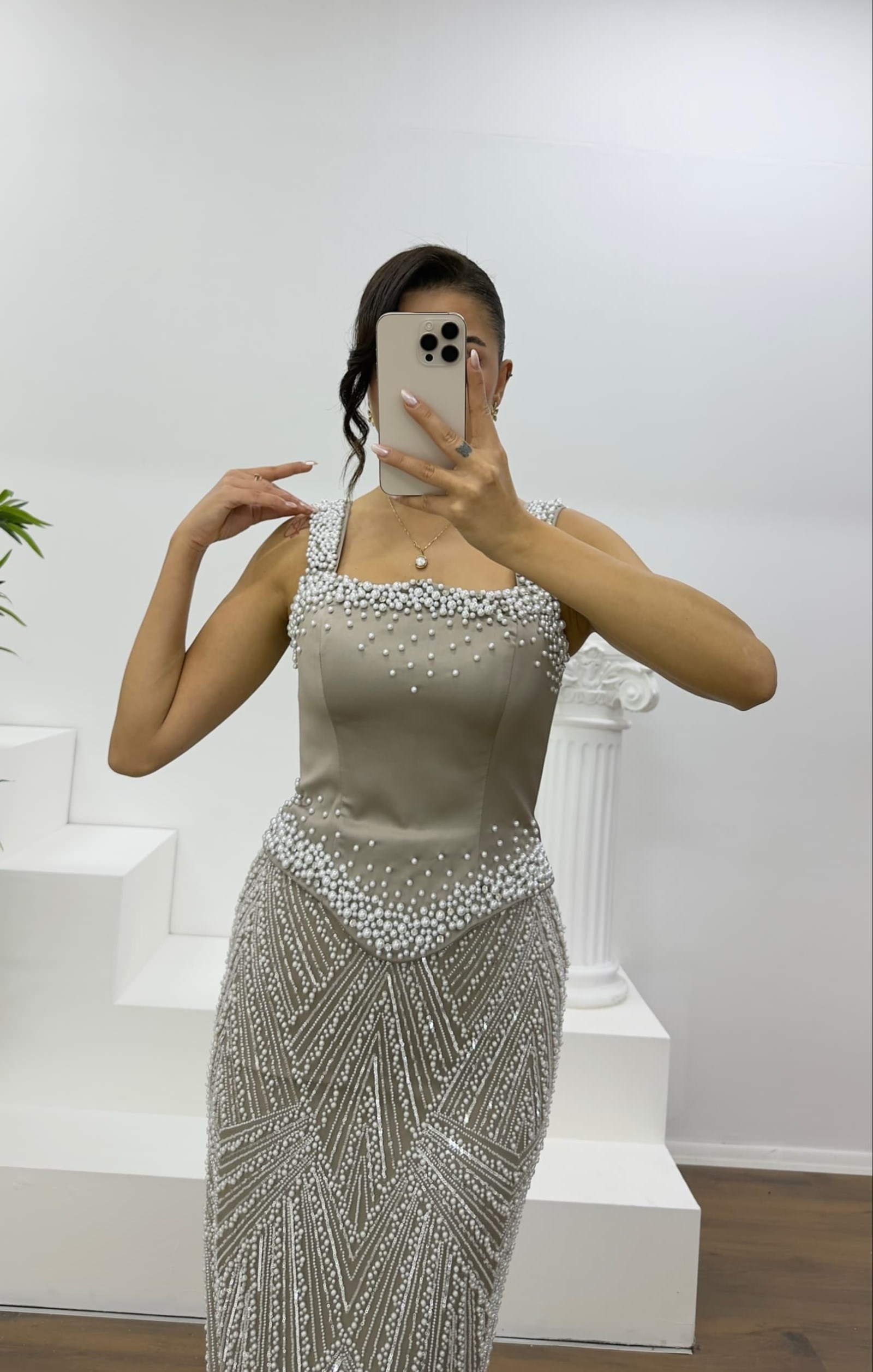 • Pudra Boncuk İşlemeli Abiye Elbise