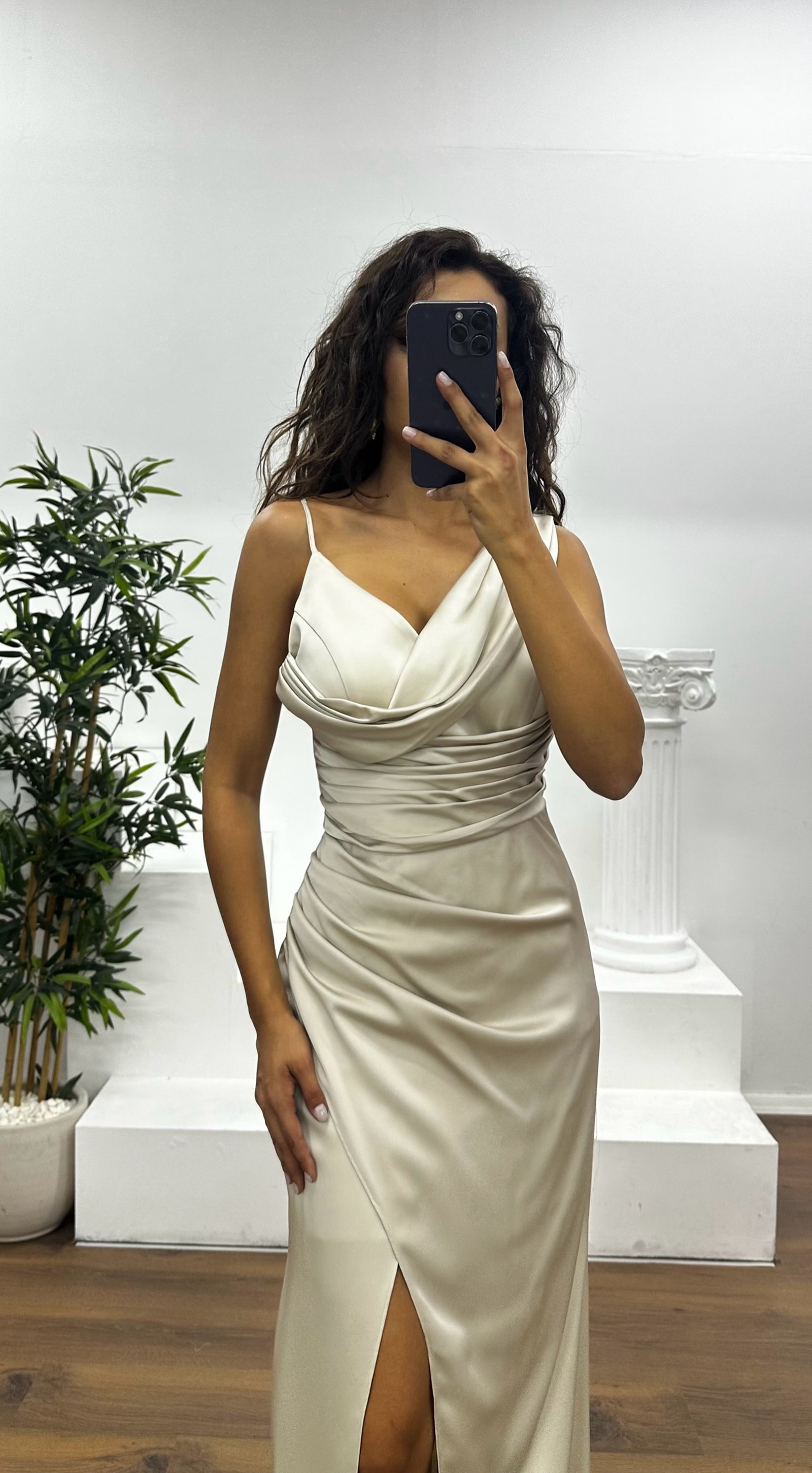 Ürün 36-42 bedene kadar uyumlu, göğüs pedli, astarlı, sırt capraz ip ve fermuar kapamalı, yırtmaçlı, drapeli abiye olarak tasarlanmıştır.