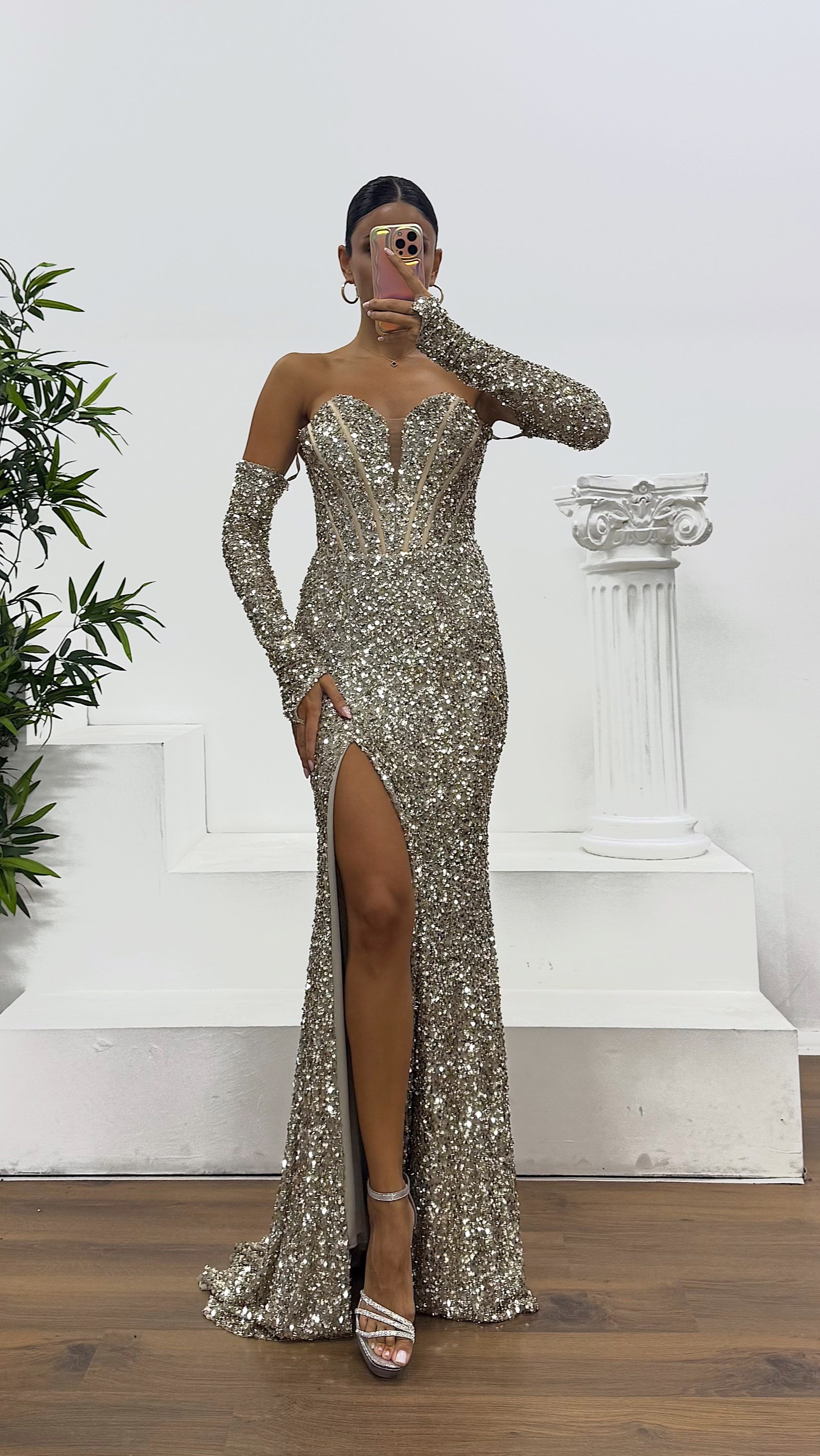 Ürün 36-42 bedene kadar uyumlu, göğüs pedli, astarlı, yırtmaçlı, sırt capraz ip ve fermuar kapamalı, eldiven detay abiye olarak tasarlanmıştır.