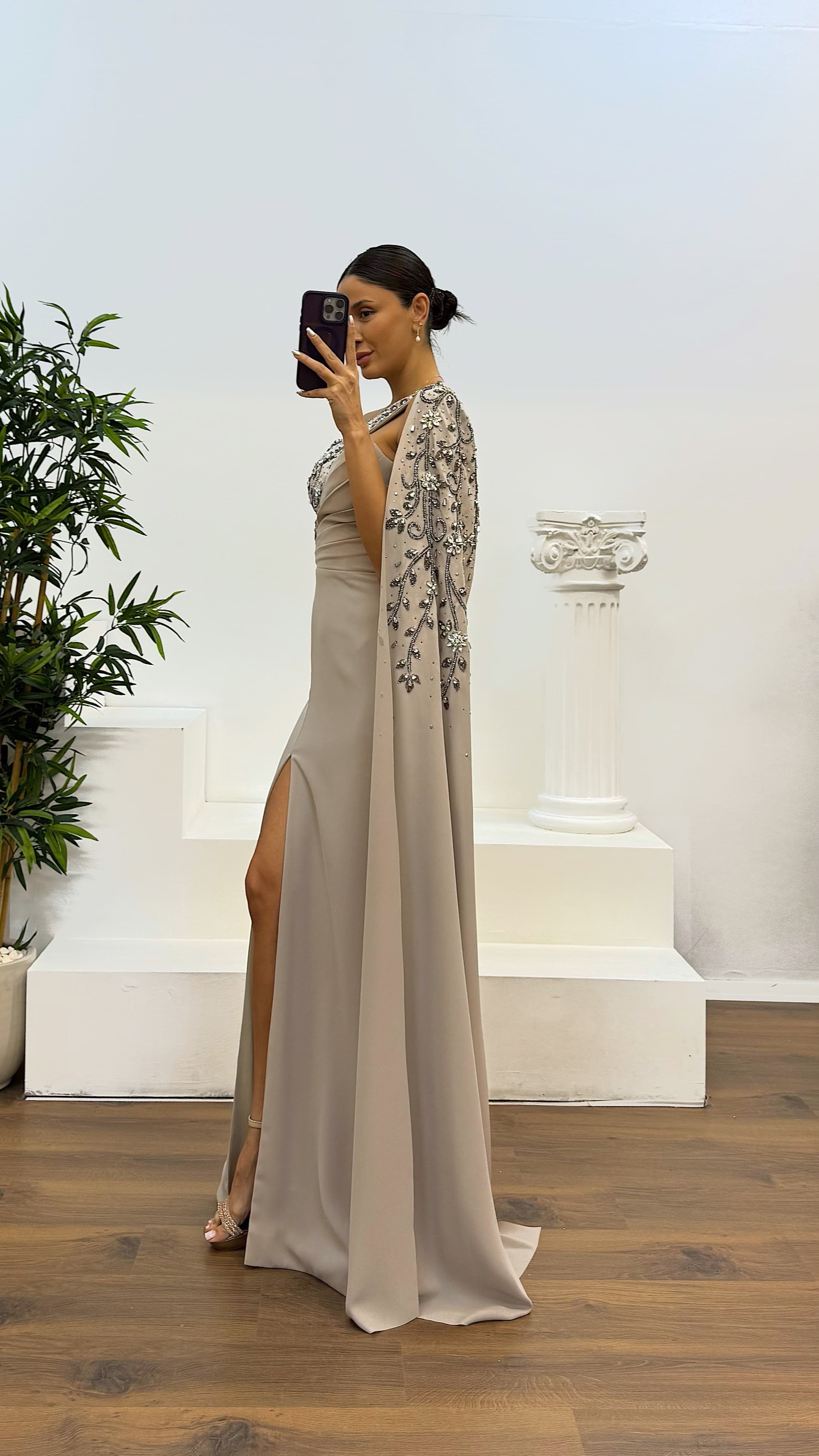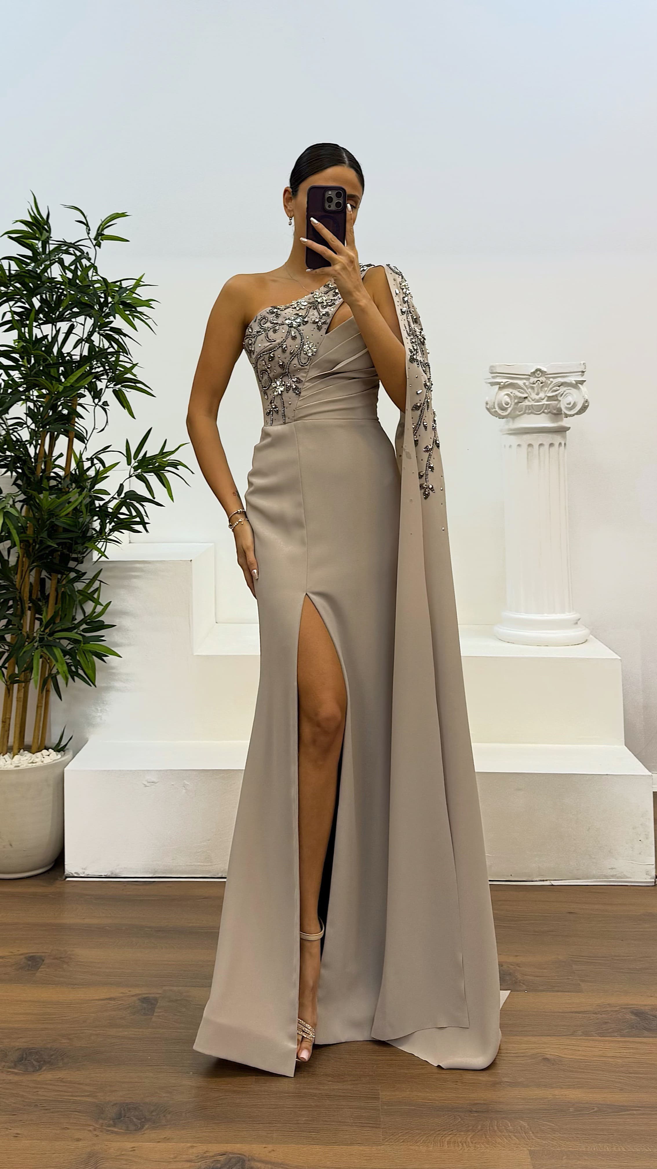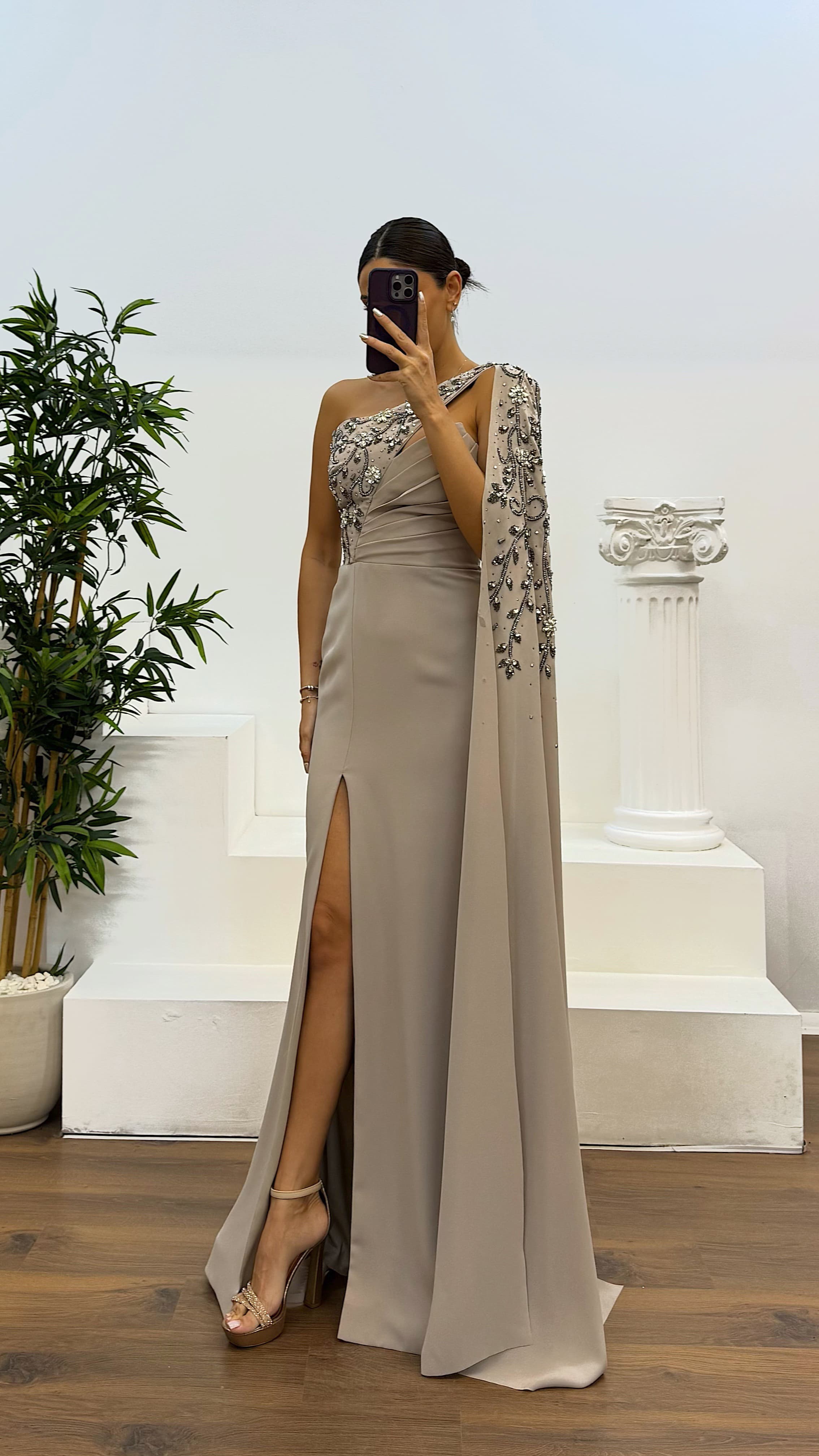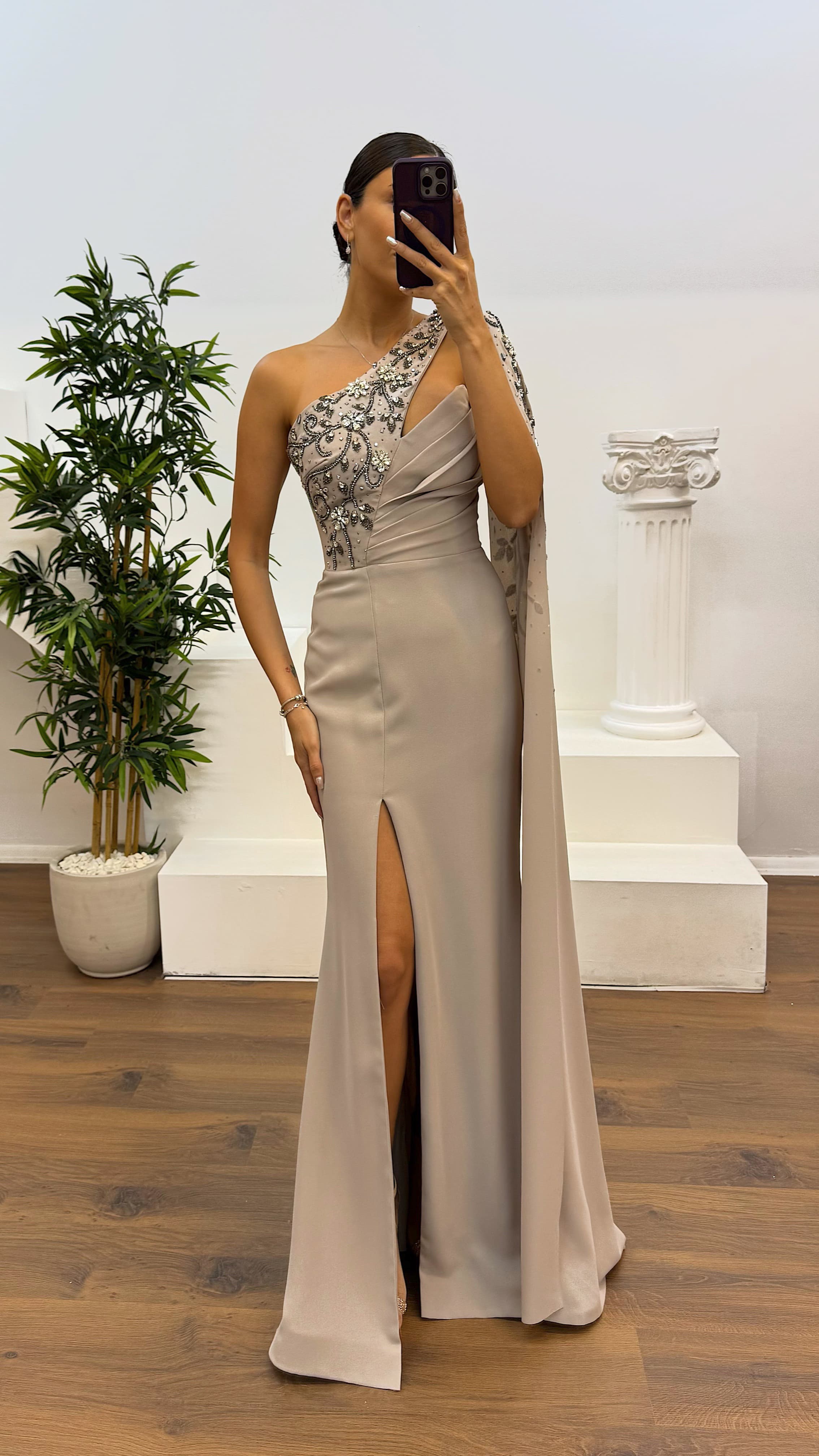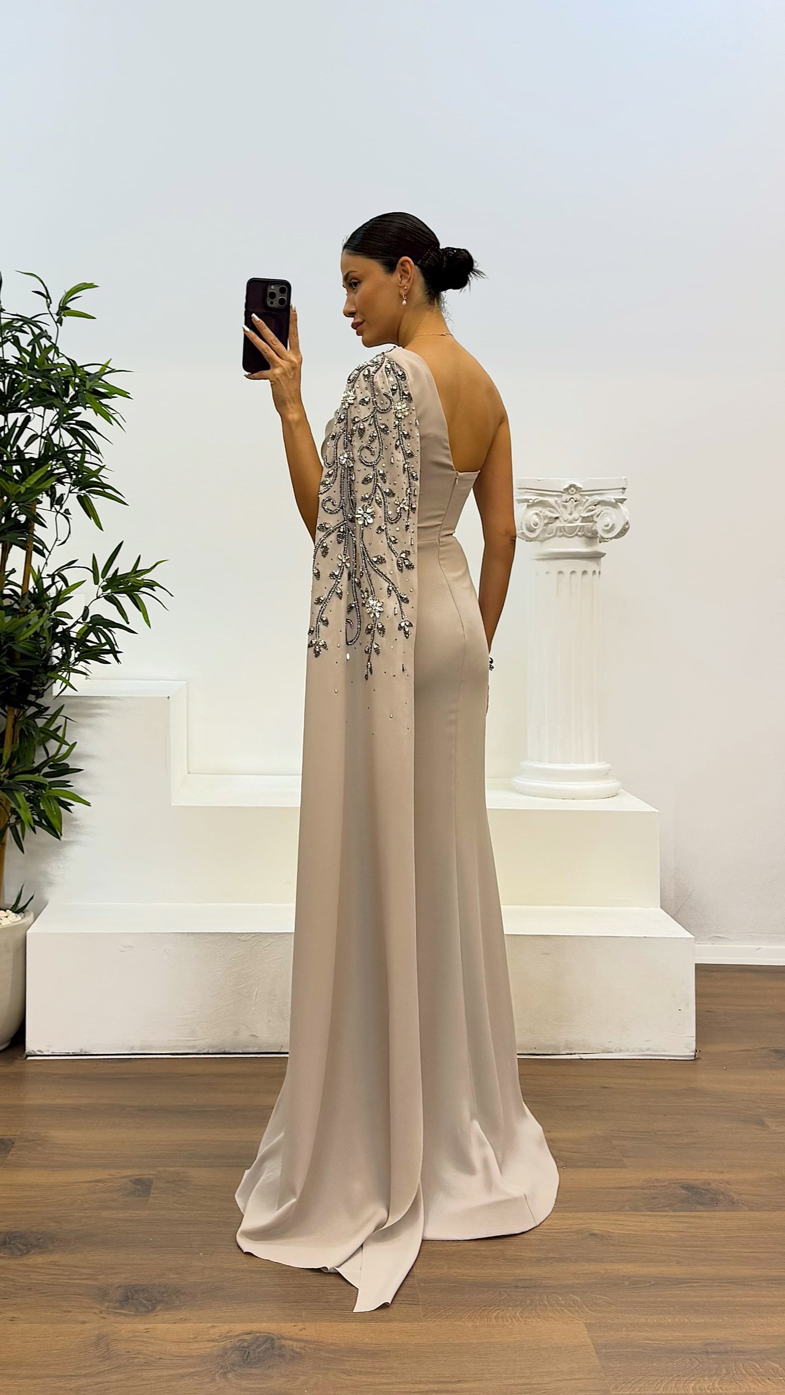 Ürün 36-42 bedene kadar uyumlu, göğüs pedli, astarlı, arka kapama fermuar, yırtmaçlı, tek kol, işleme detay abiye olarak tasarlanmıştır.