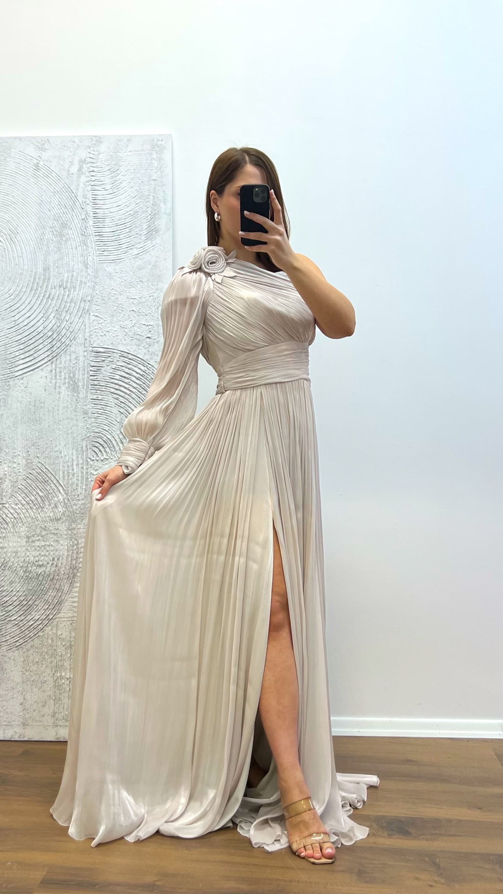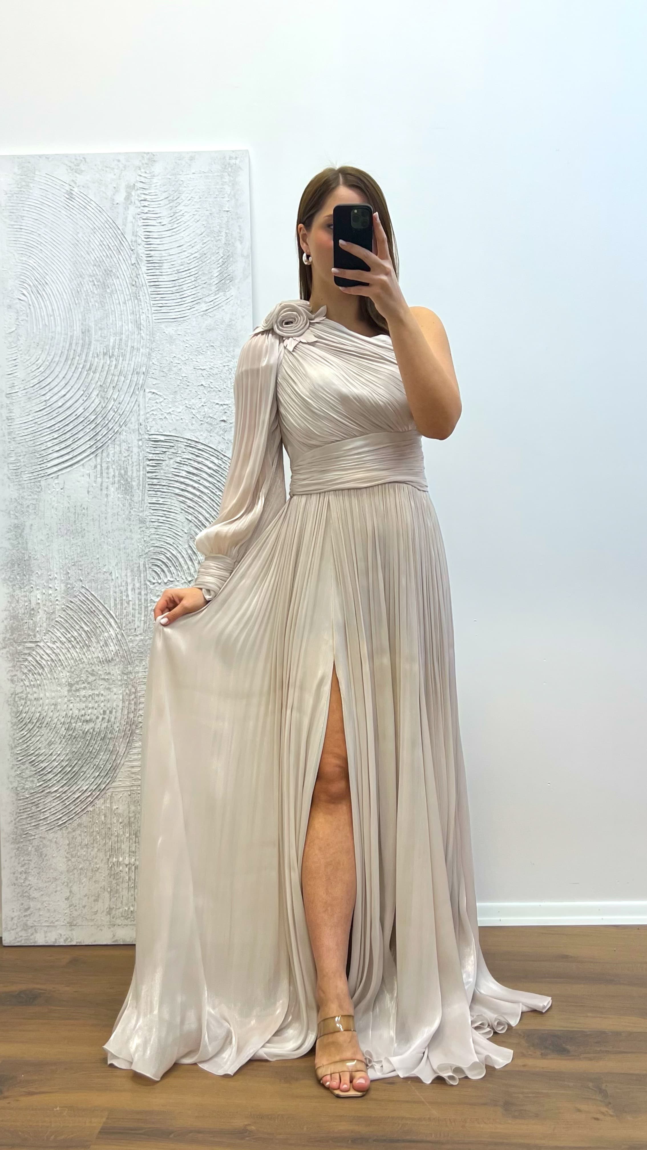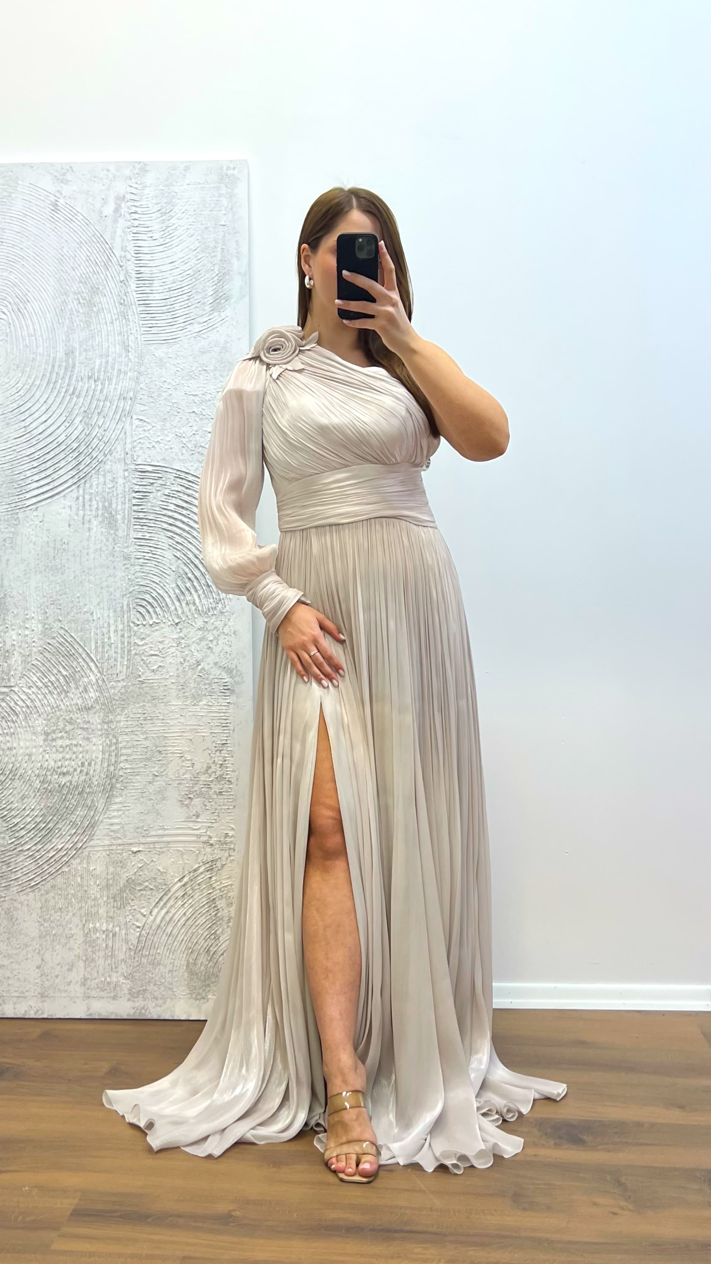 Tek kol piliseli abiye elbise