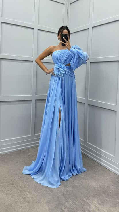 • Tek Kol Beli Transparan Çiçek Detay Abiye Elbise