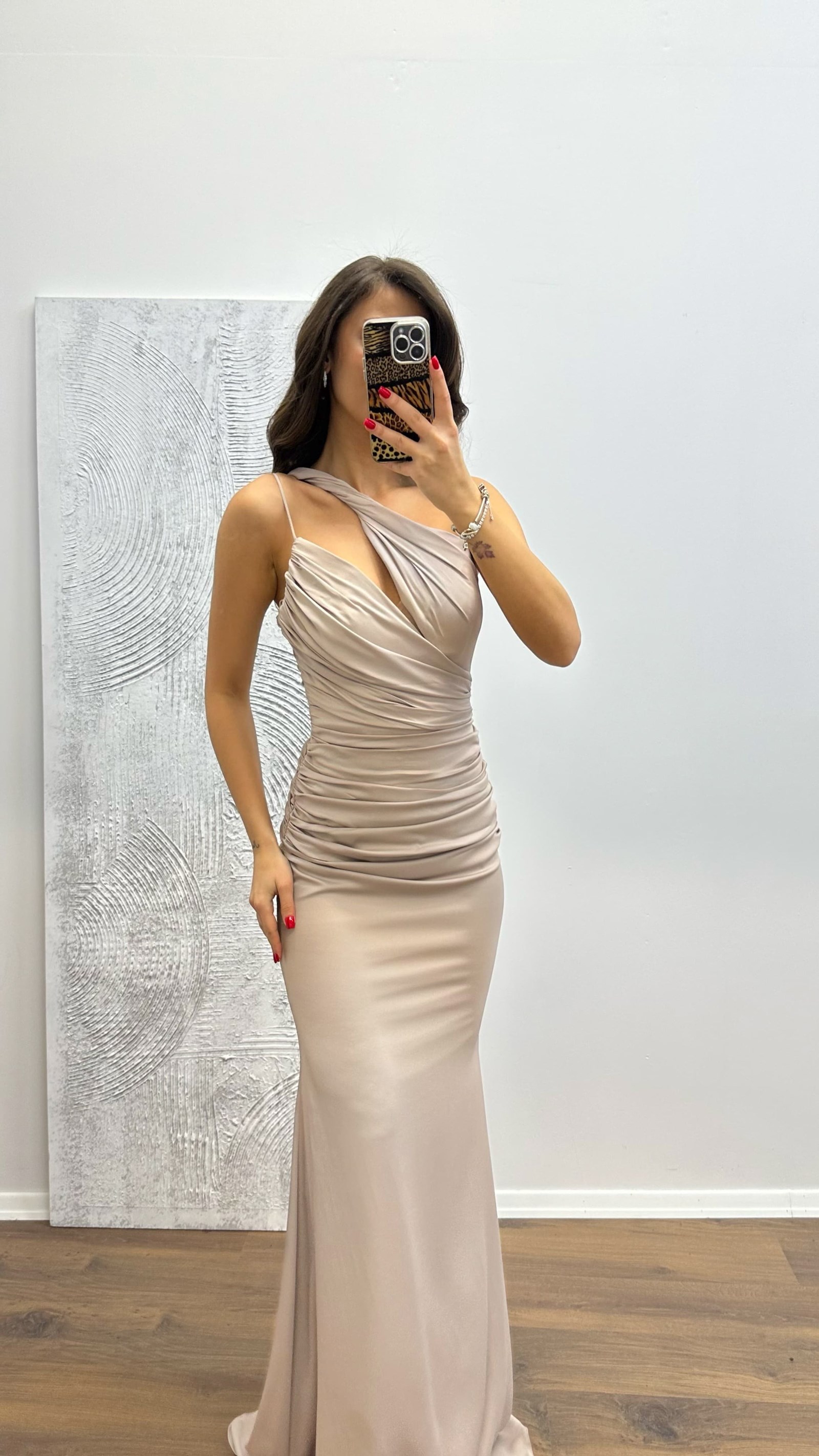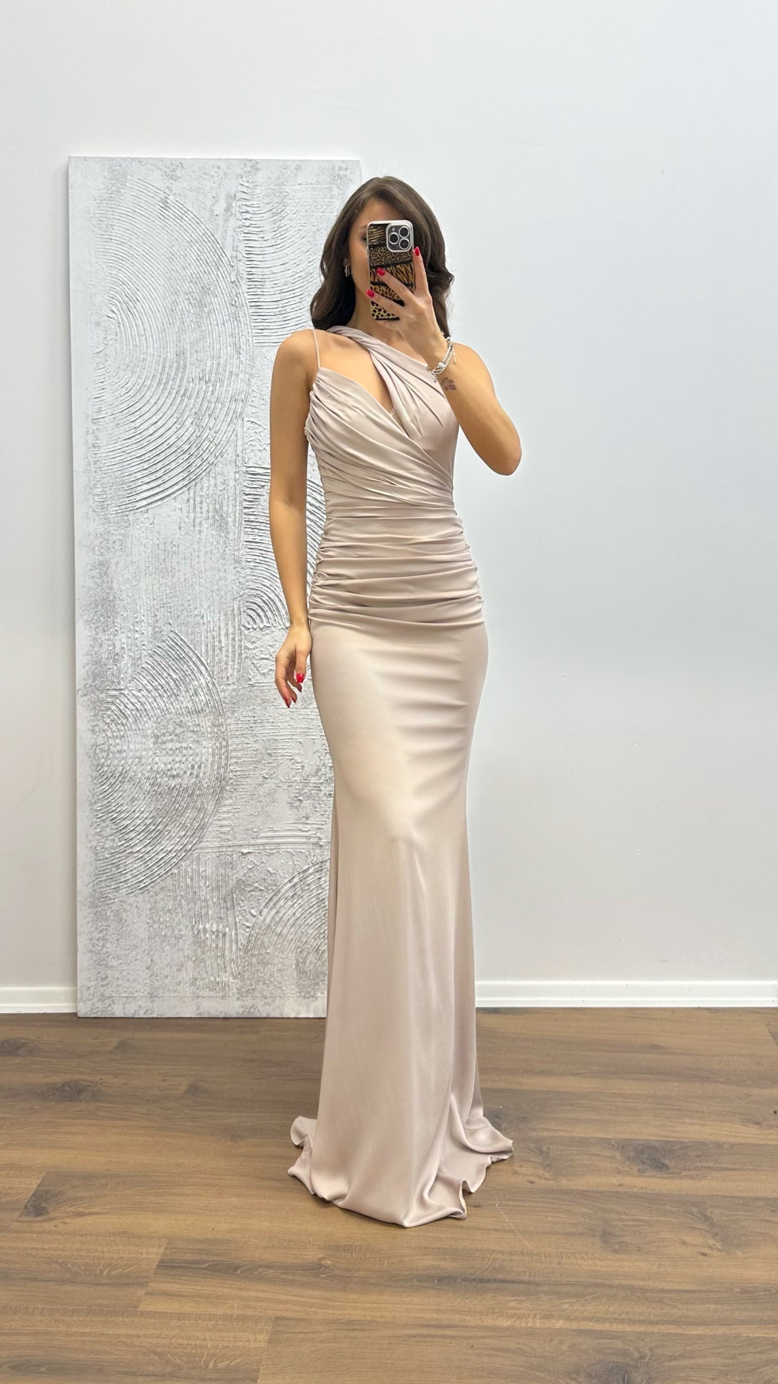 Ürün 36-44 bedene kadar uyumlu, göğüs pedli, astarlı, arka kapama fermuar, tek omuz abiye olarak tasarlanmıştır.