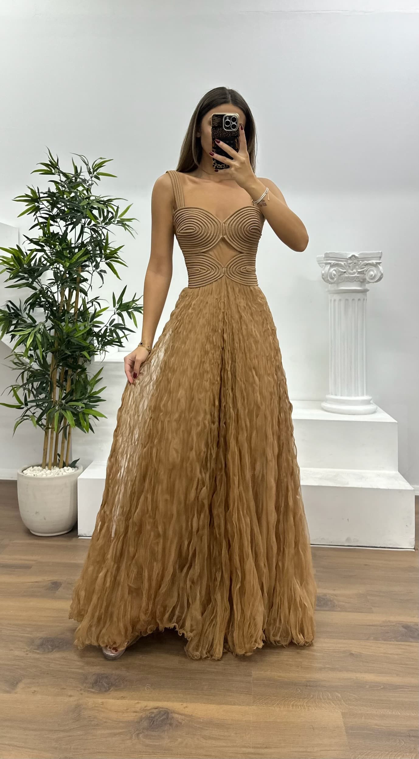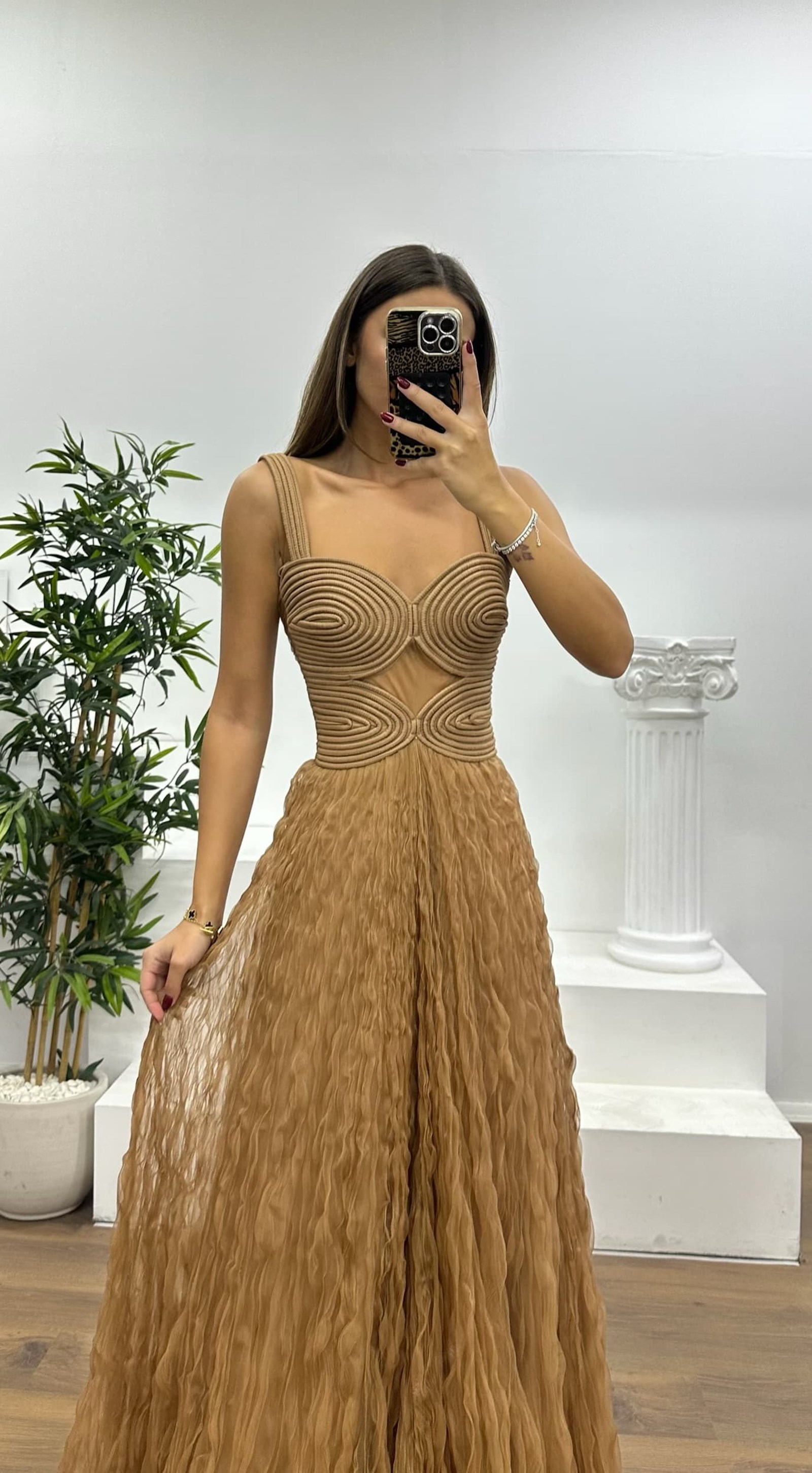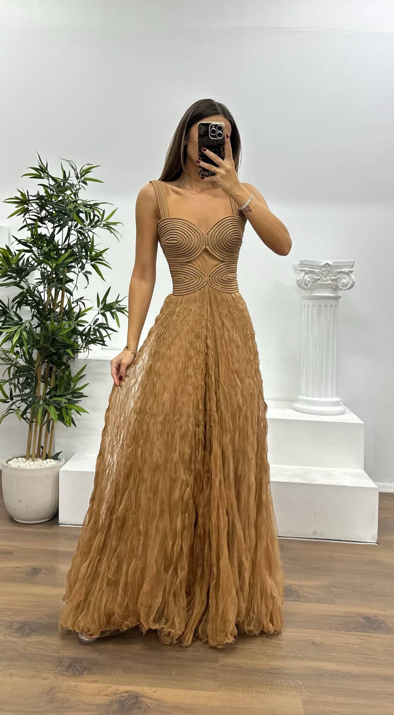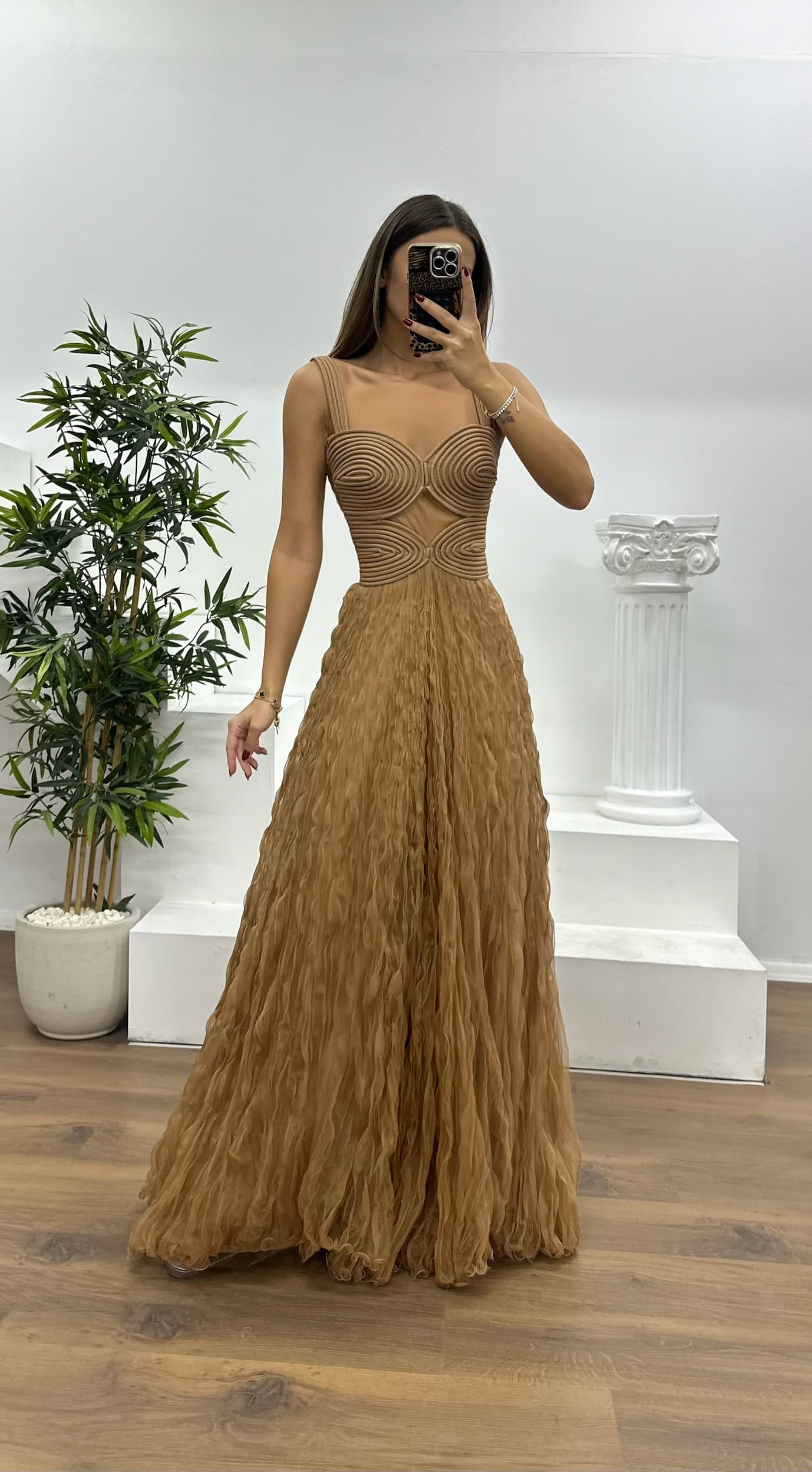 Ürün 36-44 bedene kadar uyumlu, göğüs pedli, astarlı, arka kapama fermuar, göğüs detay abiye olarak tasarlanmıştır.