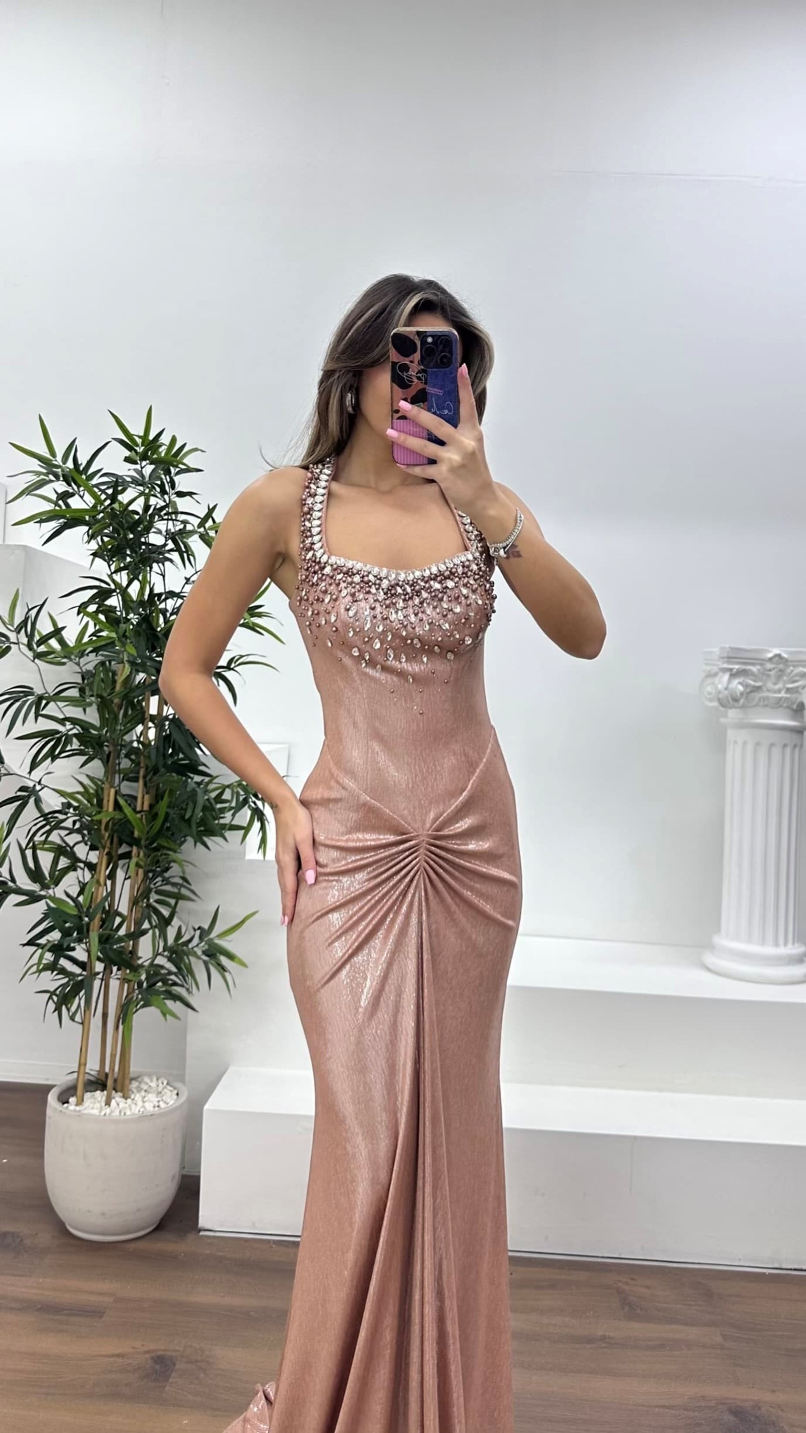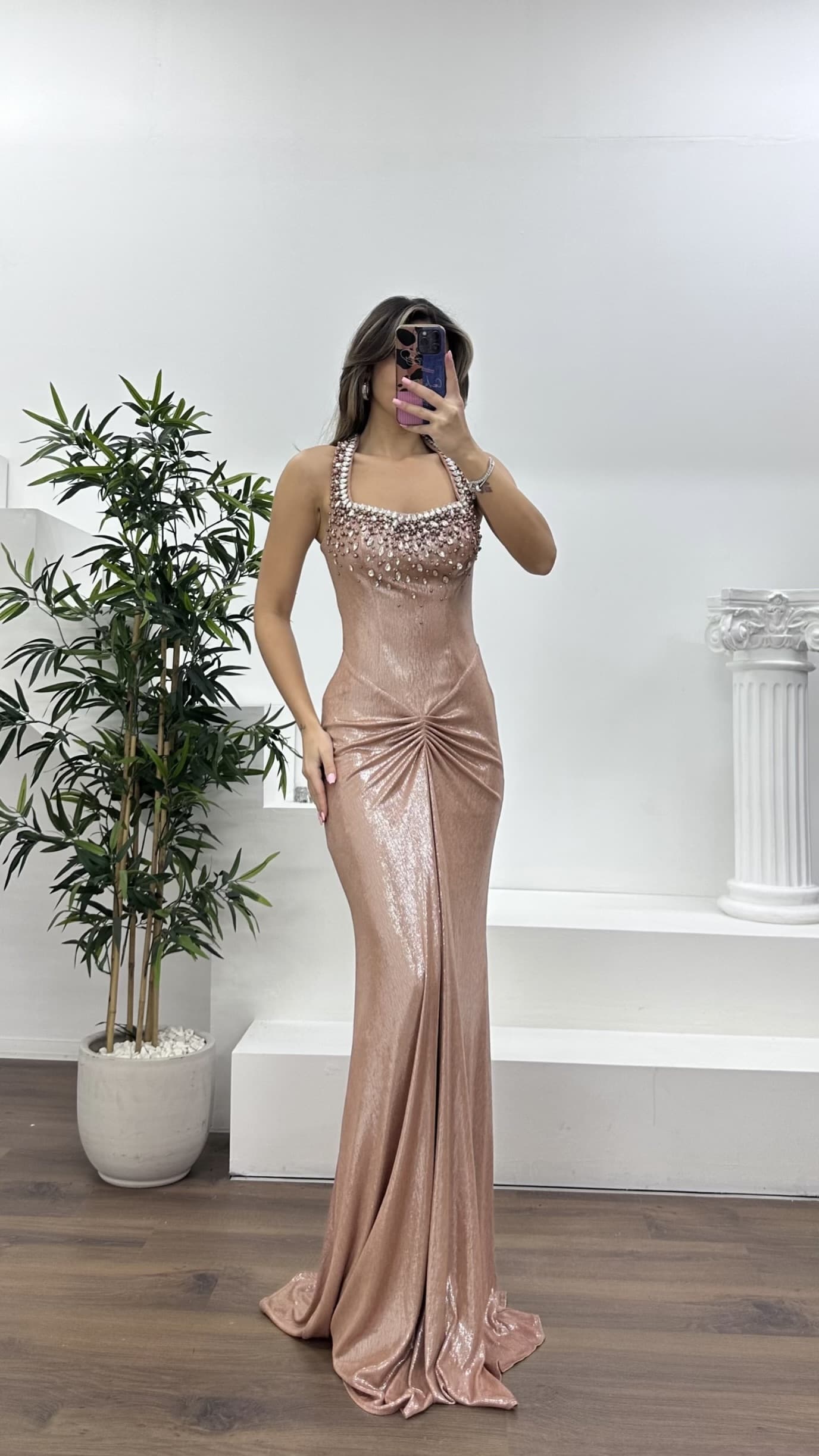 • Bakır Taş İşlemeli Drapeli Saten Abiye Elbise