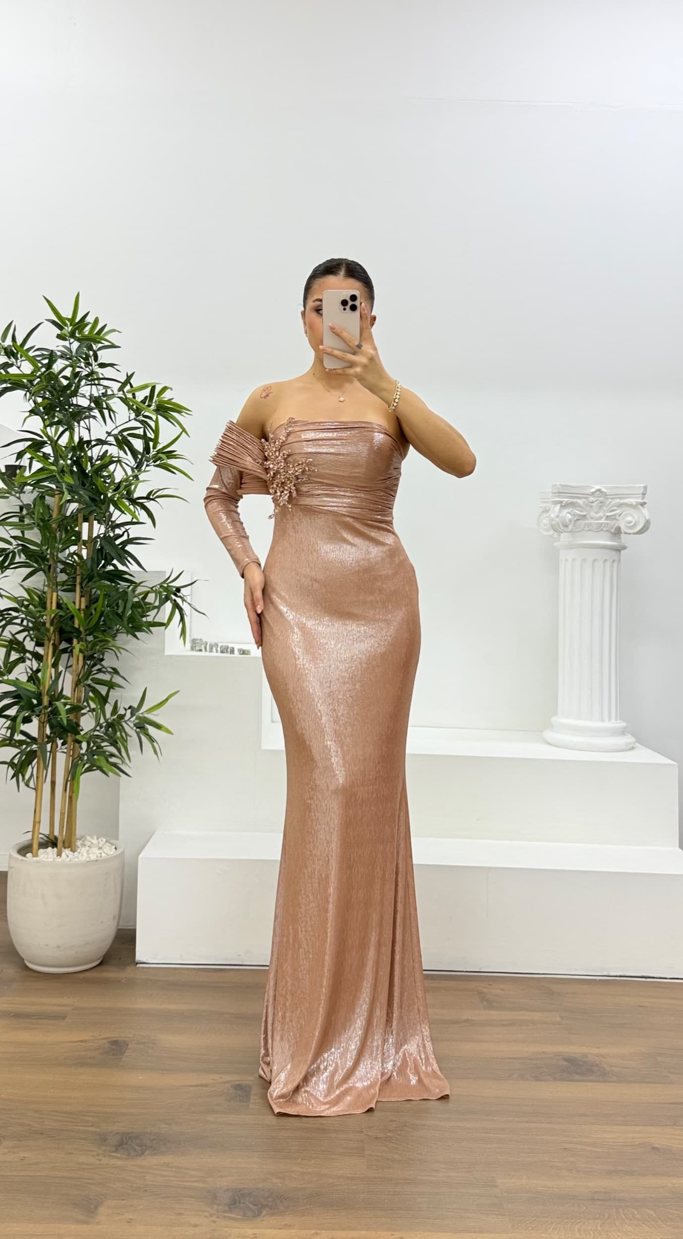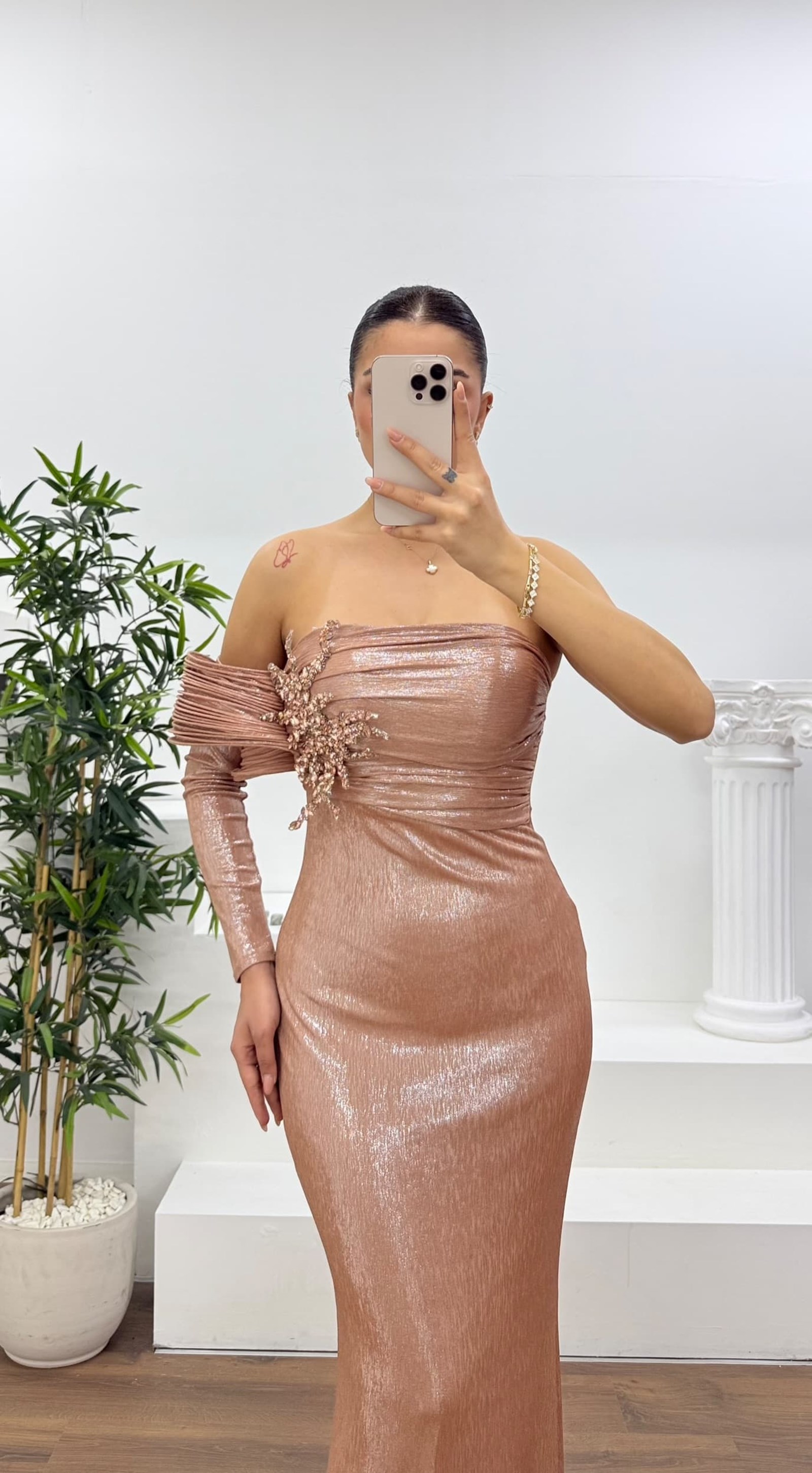 • Bakır Tek Omuz Pile Kollu Taş Aplikeli Abiye Elbise