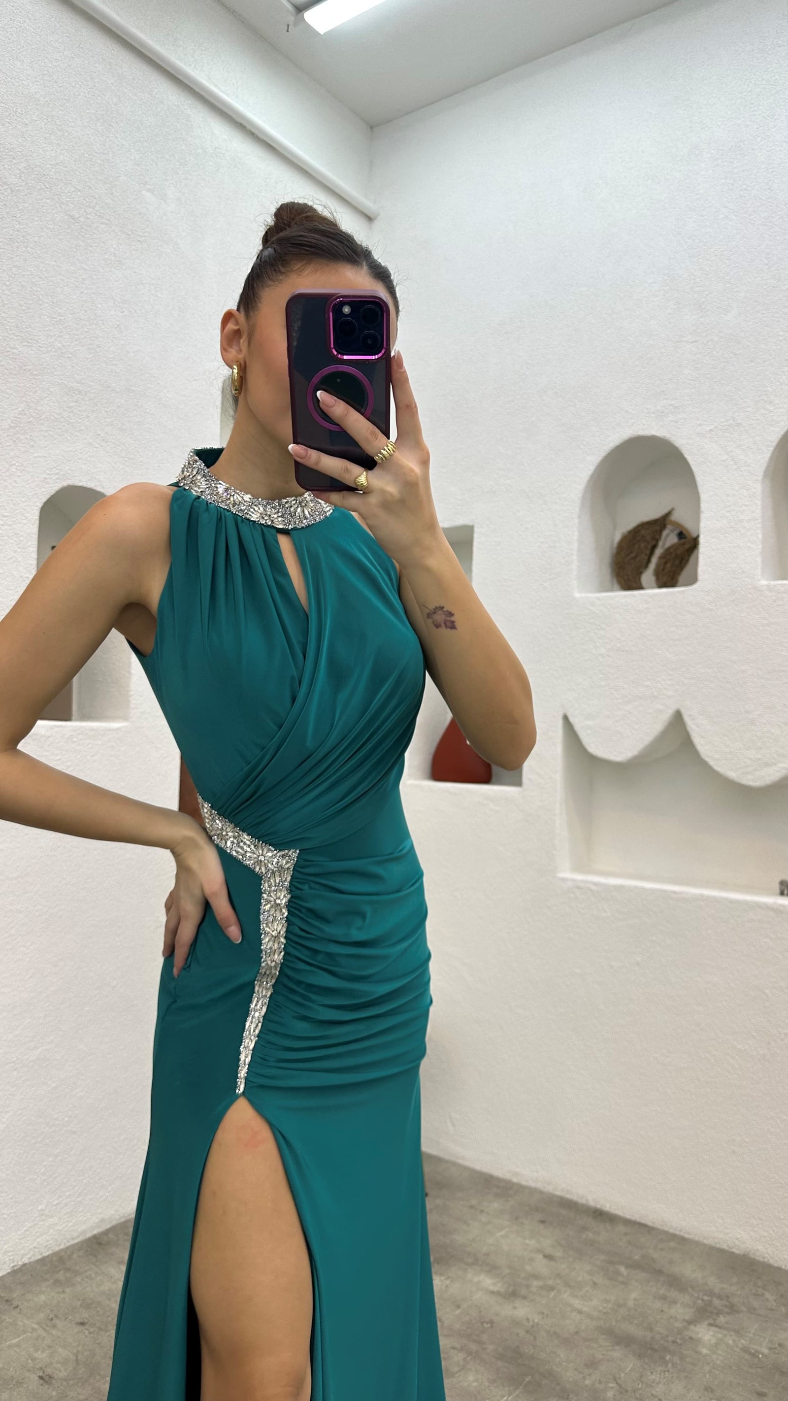 Turkuaz Boyun Ve Bel İşlemeli Büzgülü Saten Abiye Elbise
