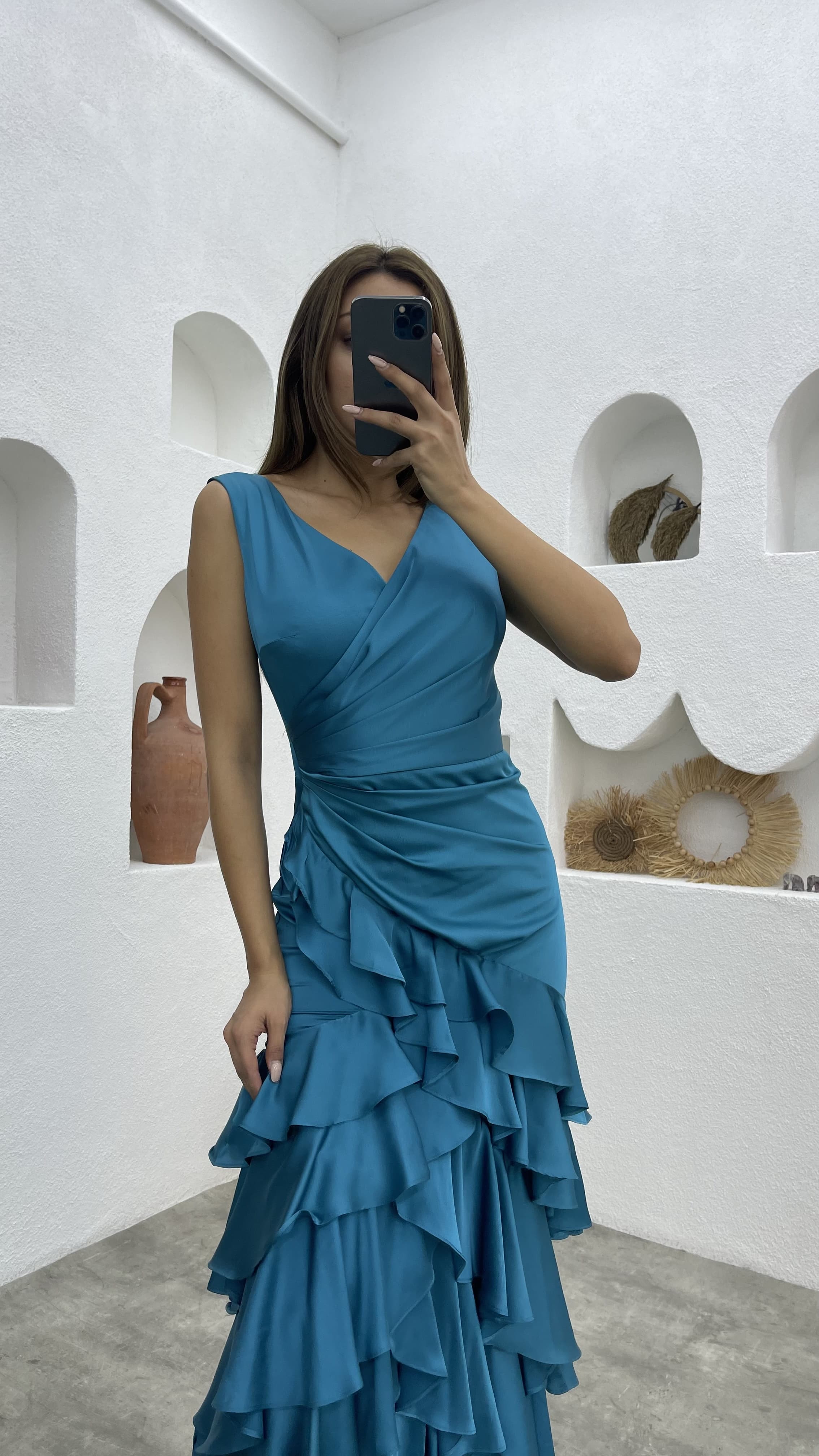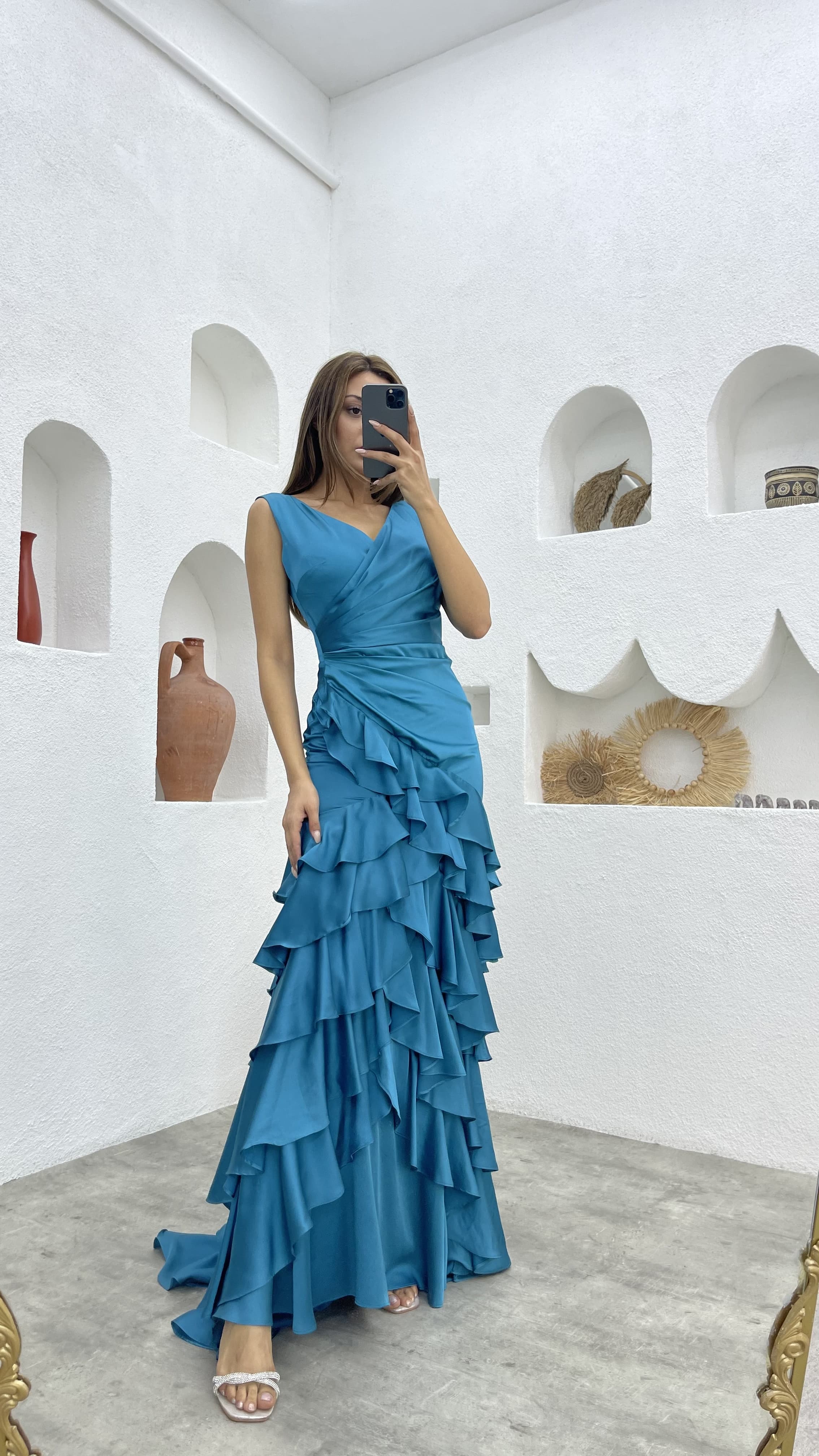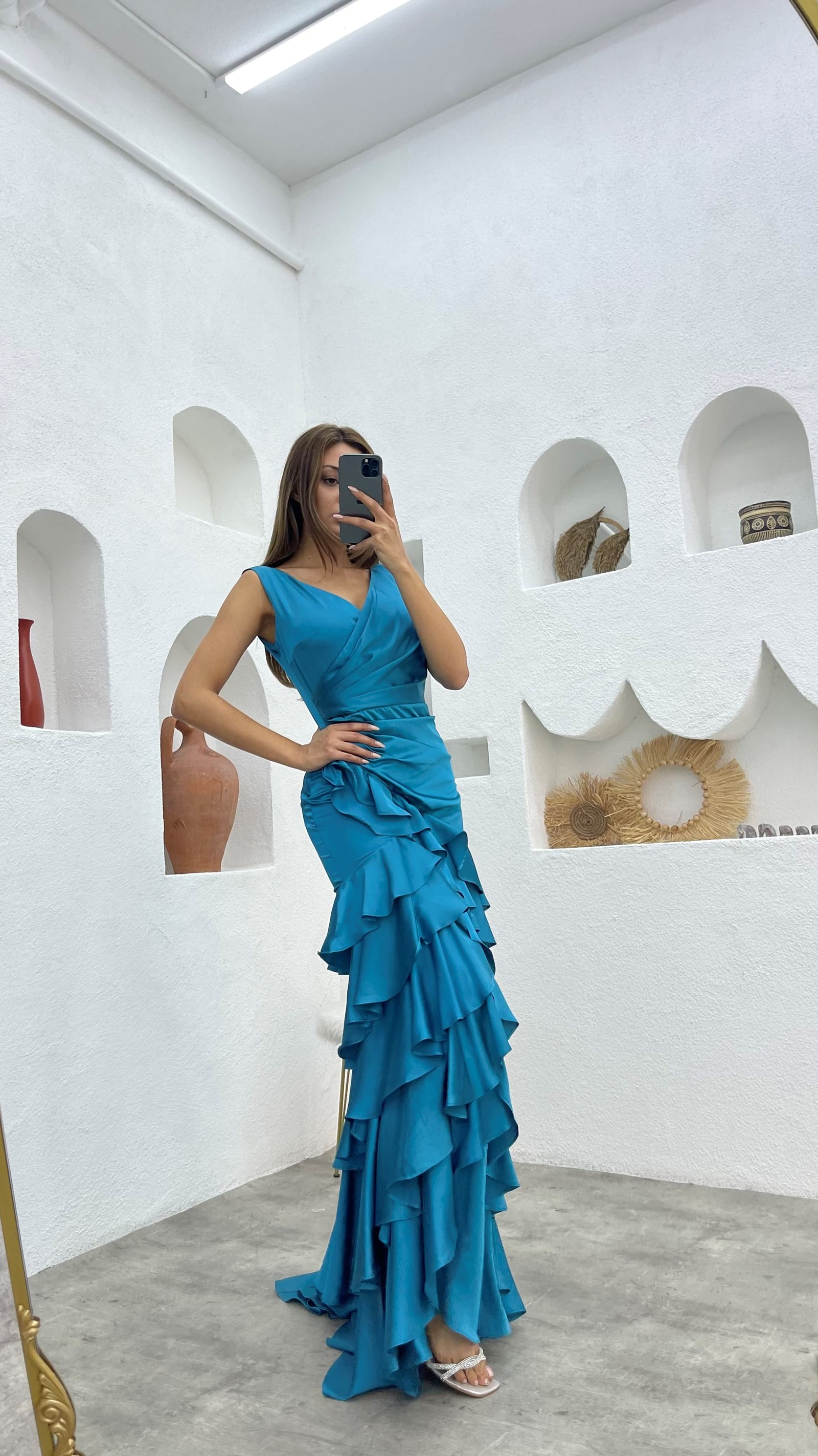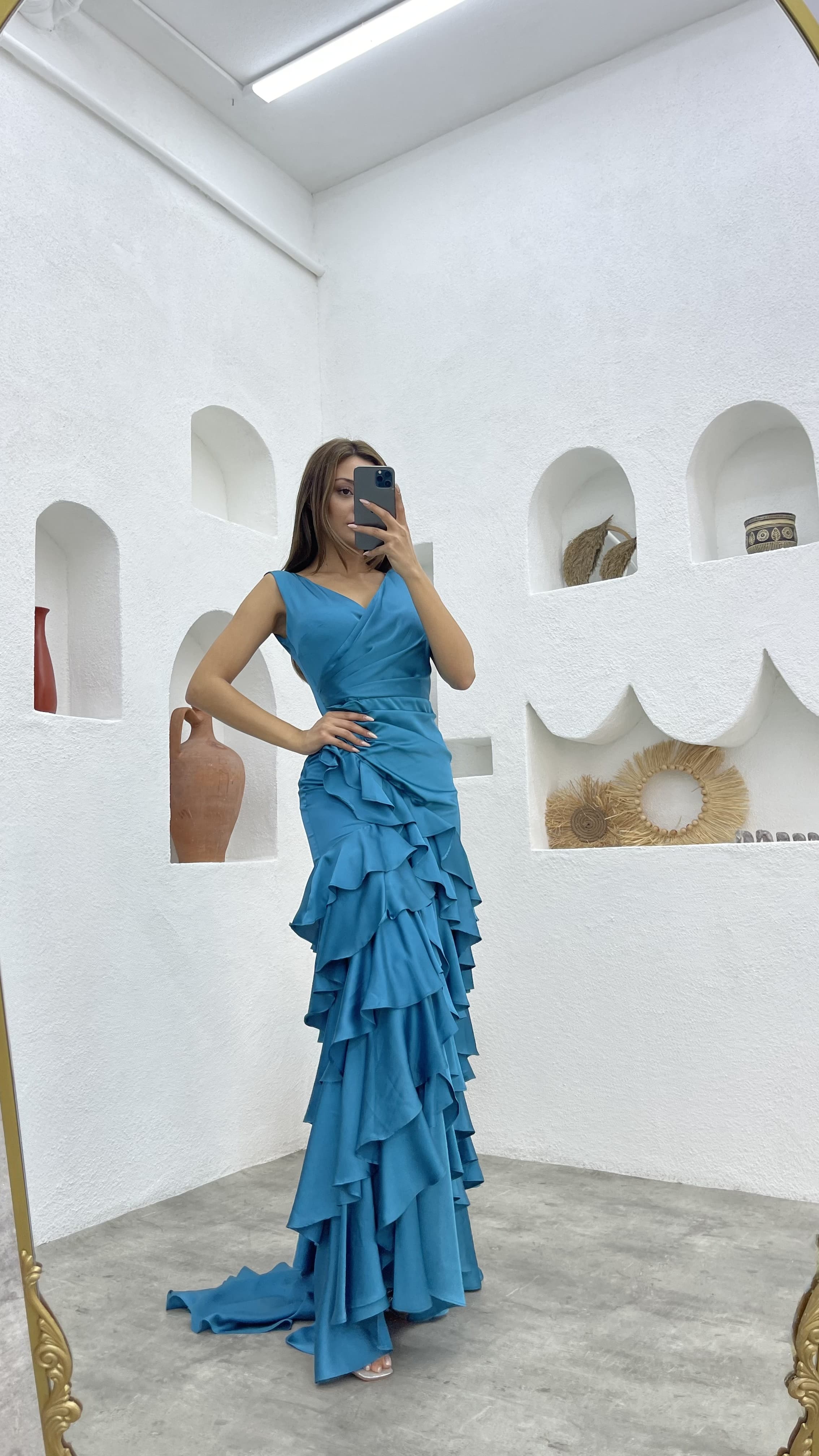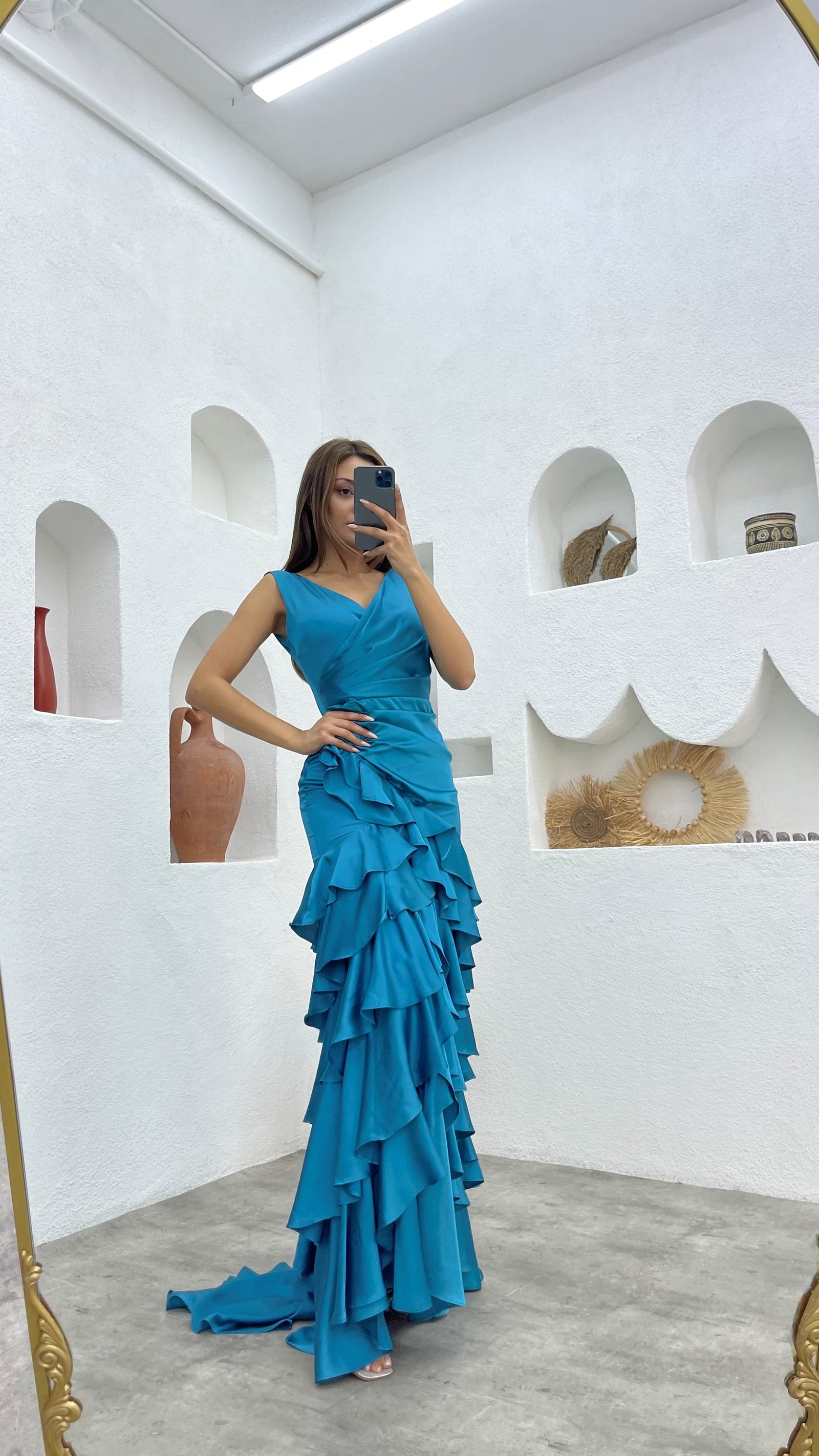 • Turkuaz Drapeli Volanlı Abiye Elbise