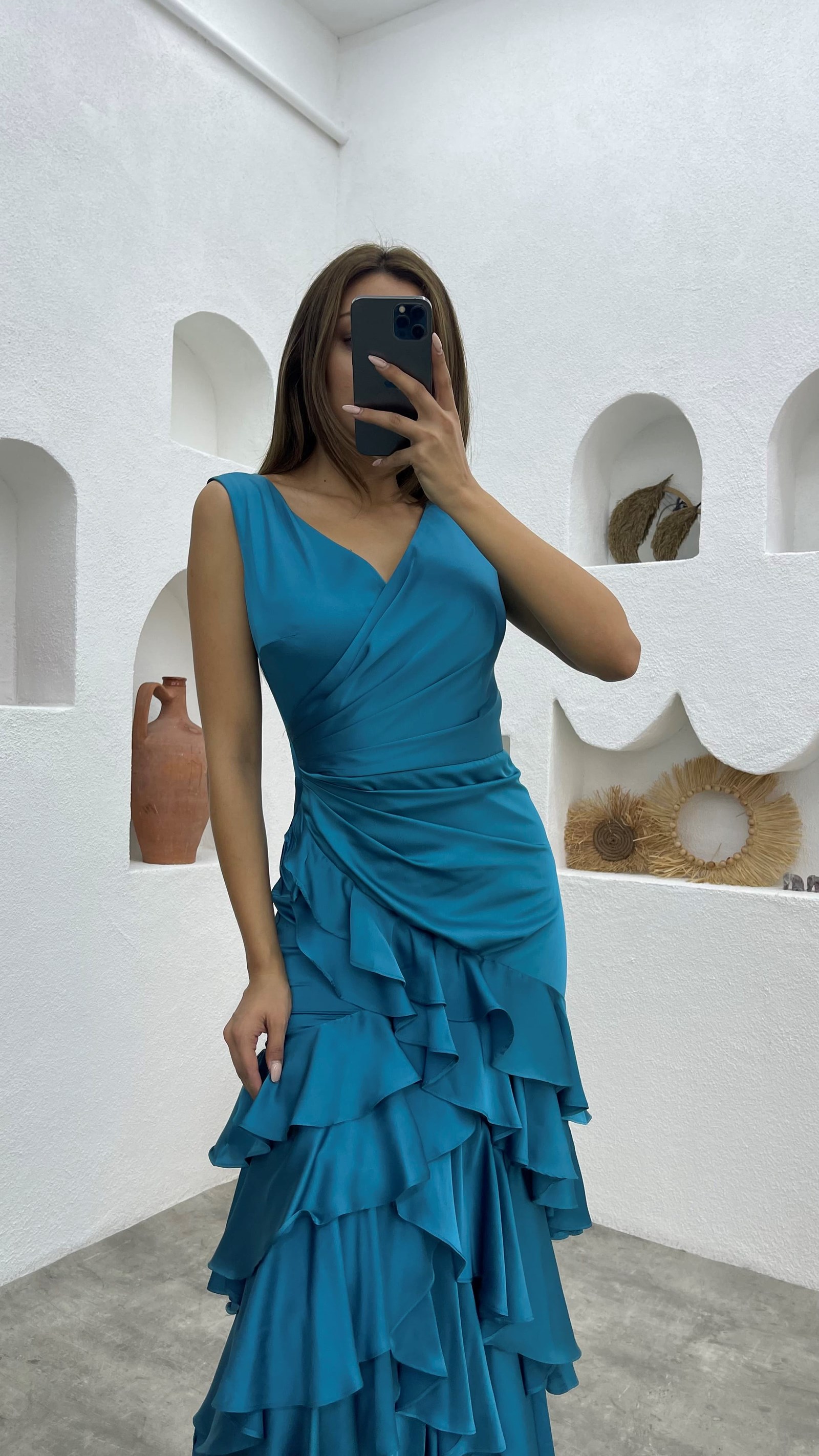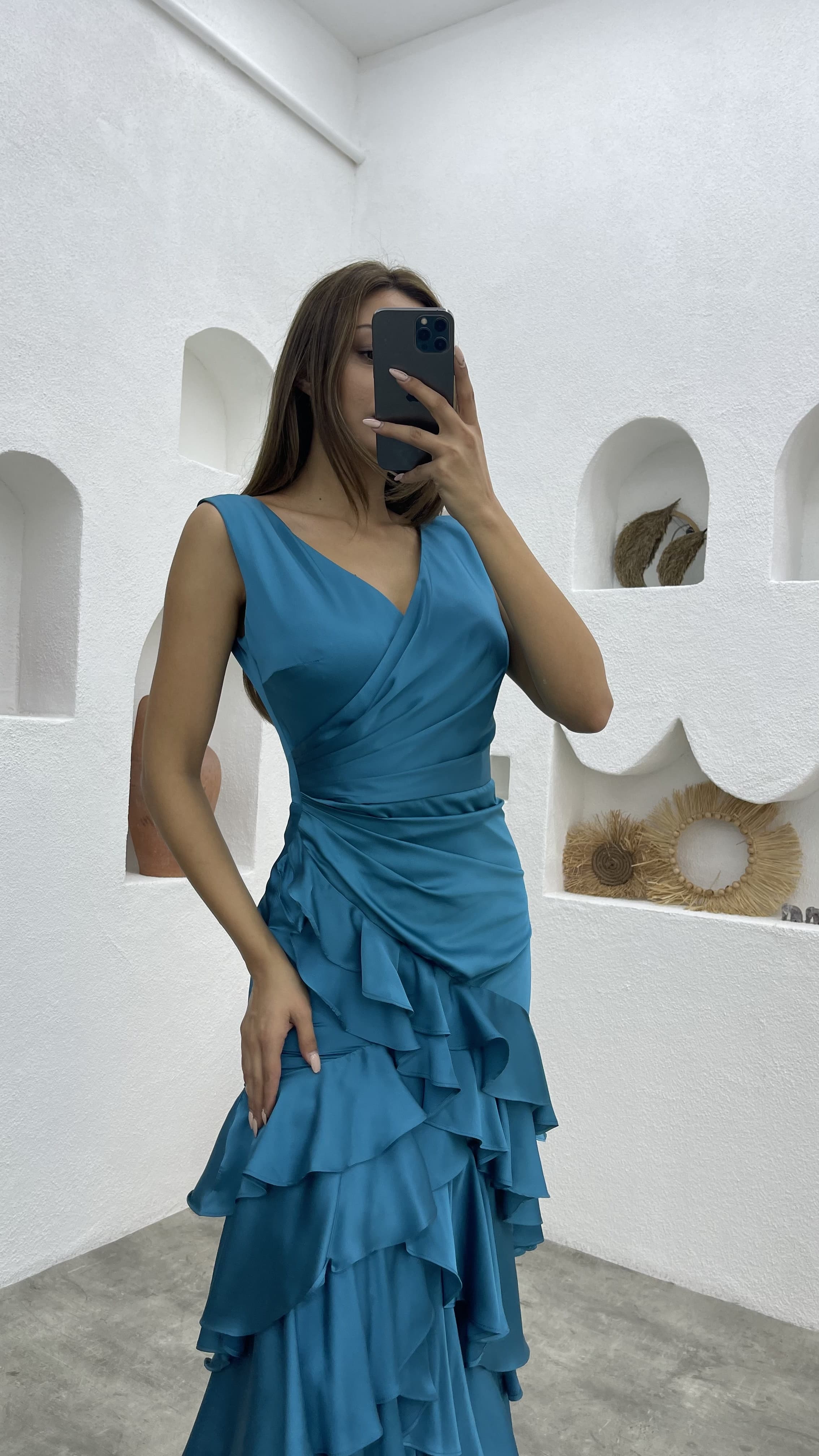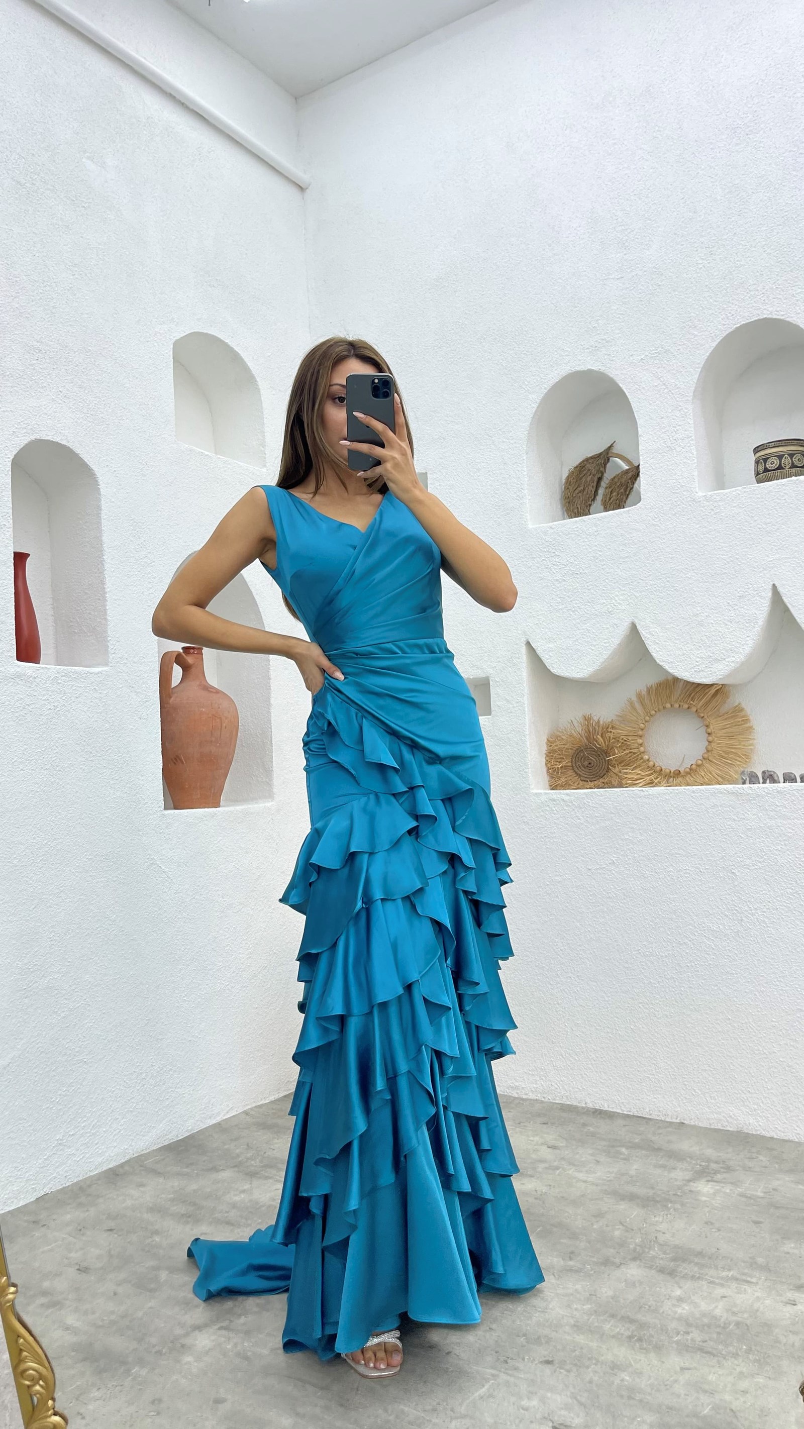 Turkuaz Drapeli Volanlı Abiye Elbise
