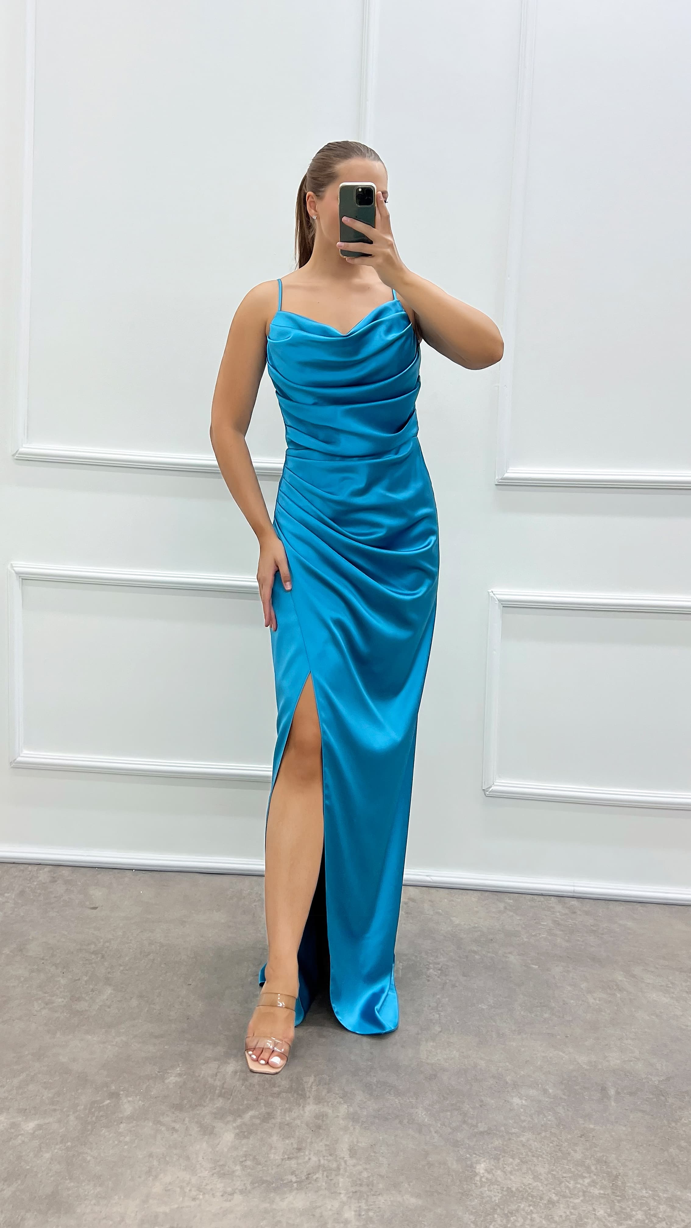 Turkuaz İp Askılı Sırt Detay Büyük Beden Abiye Elbise