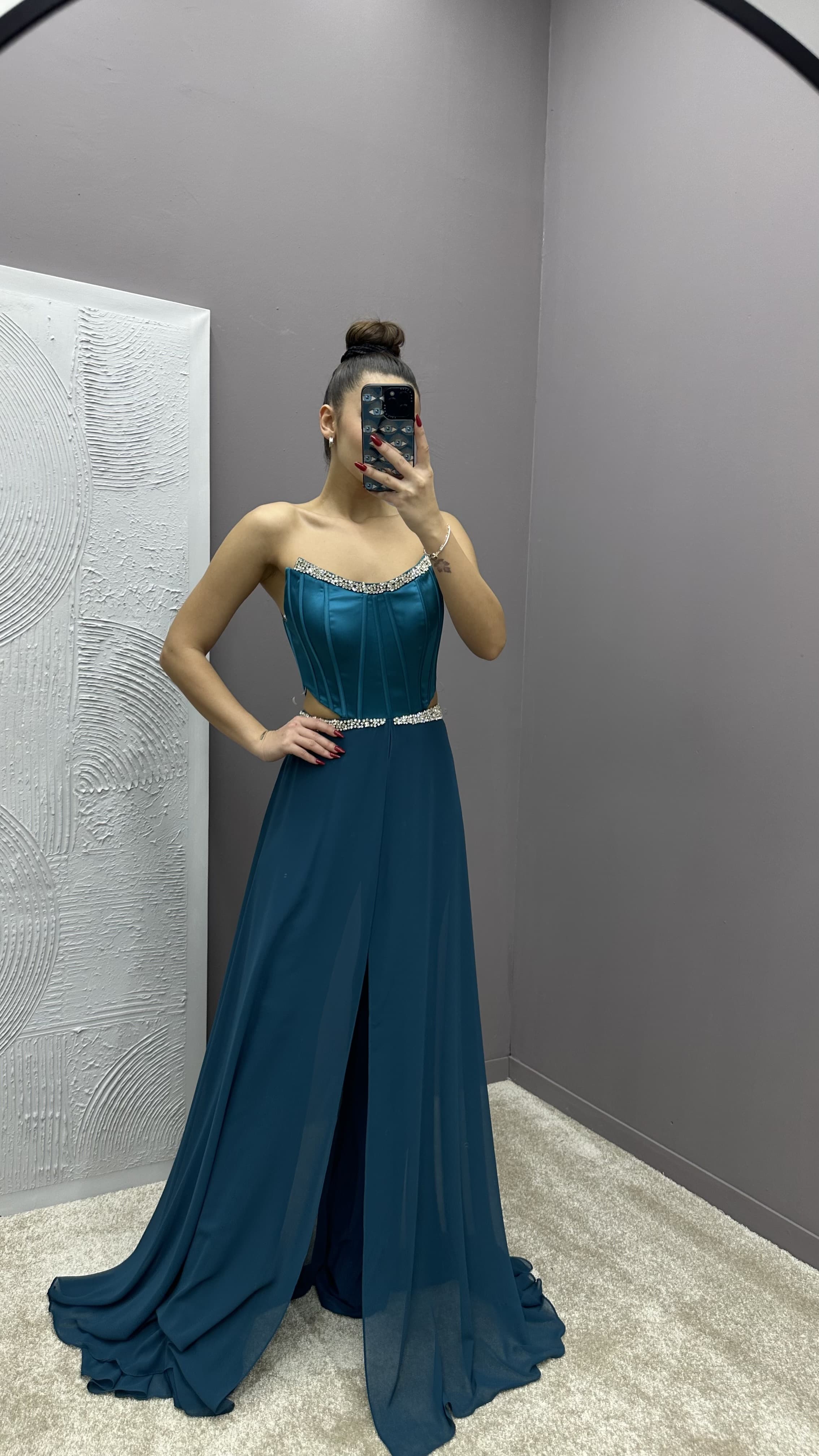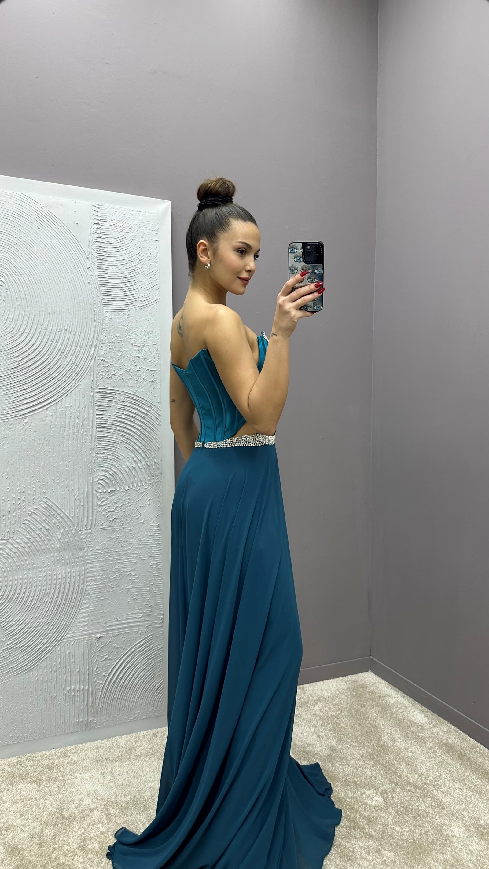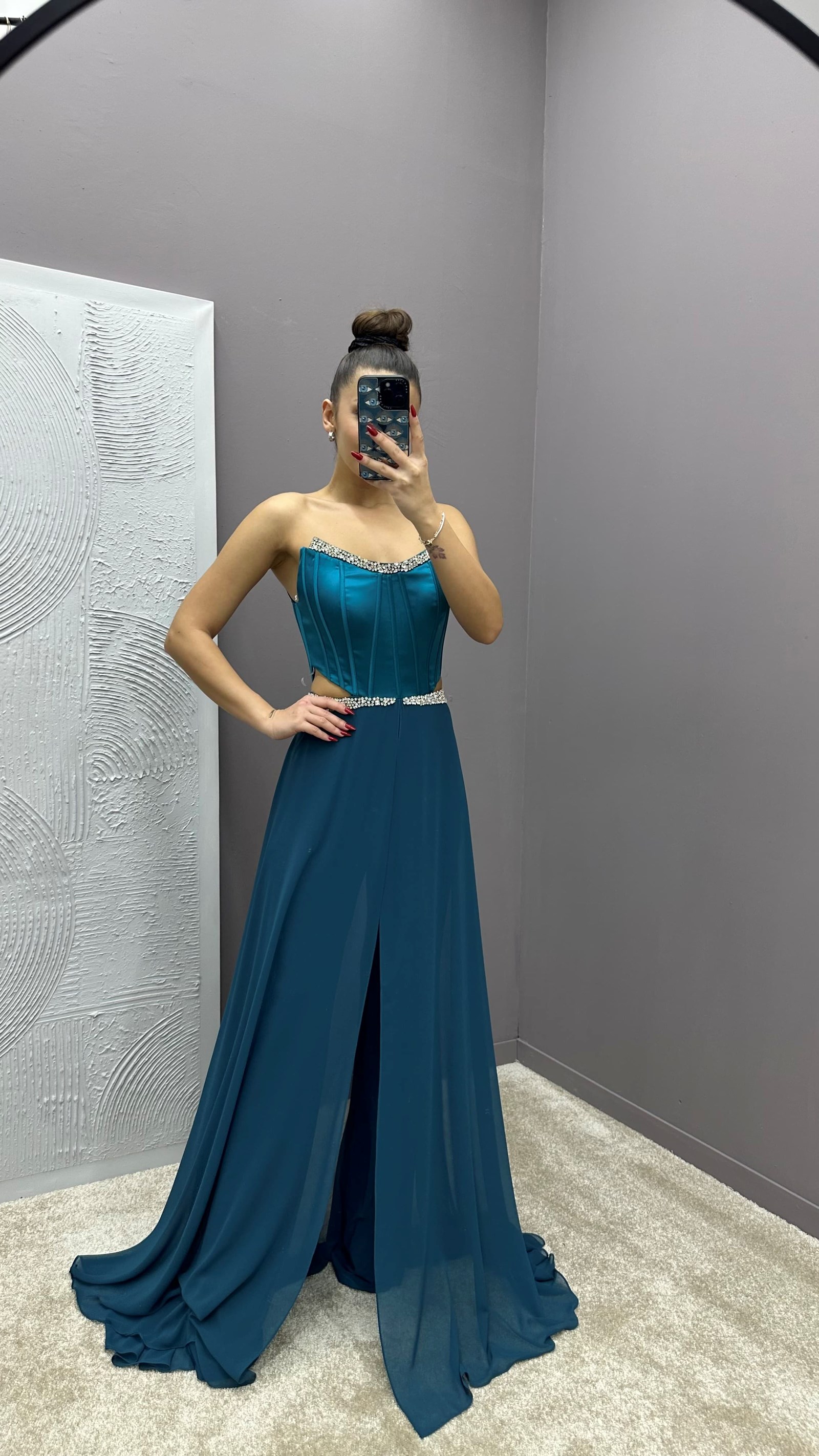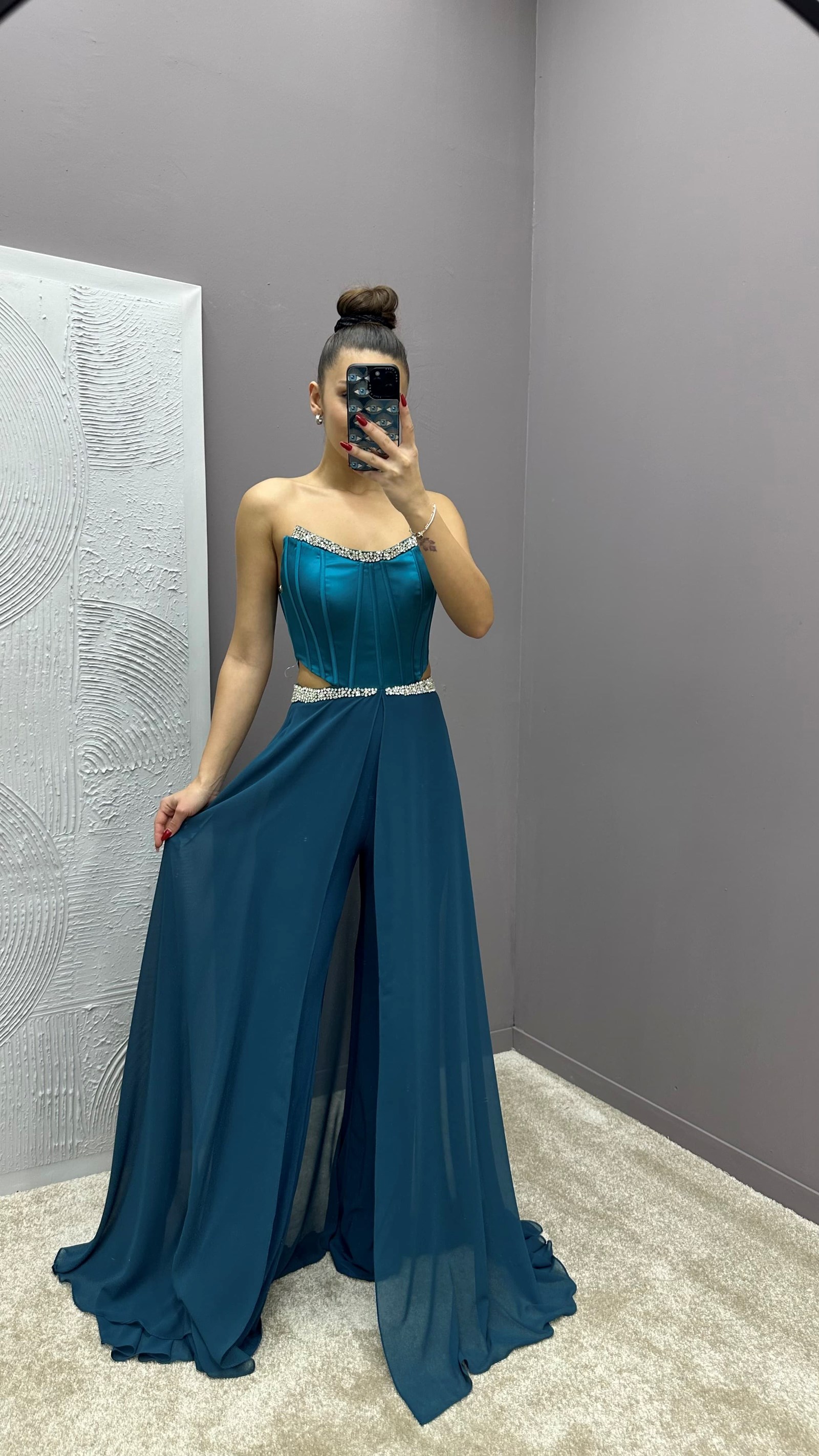 • Turkuaz Straplez Transparan İşlemeli Tasarım Tulum