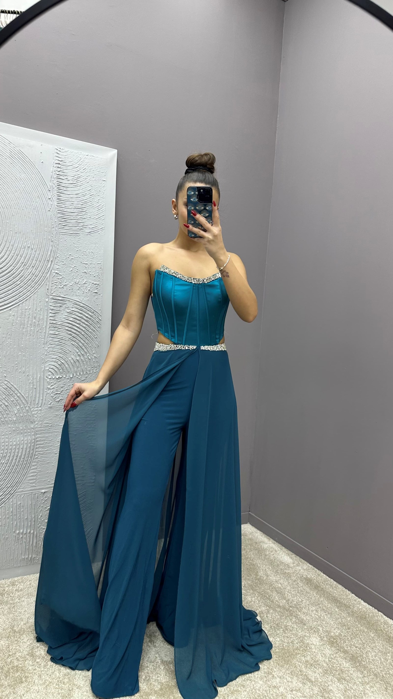 Turkuaz Straplez Transparan İşlemeli Tasarım Tulum