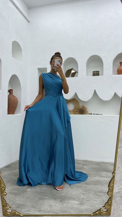 Turkuaz Tek Omuz Kemerli Volanlı Saten Abiye Elbise