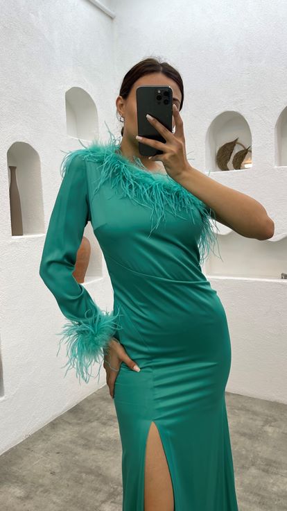 • Turkuaz Tüy Detay Yırtmaçlı Tek Kol Abiye Elbise