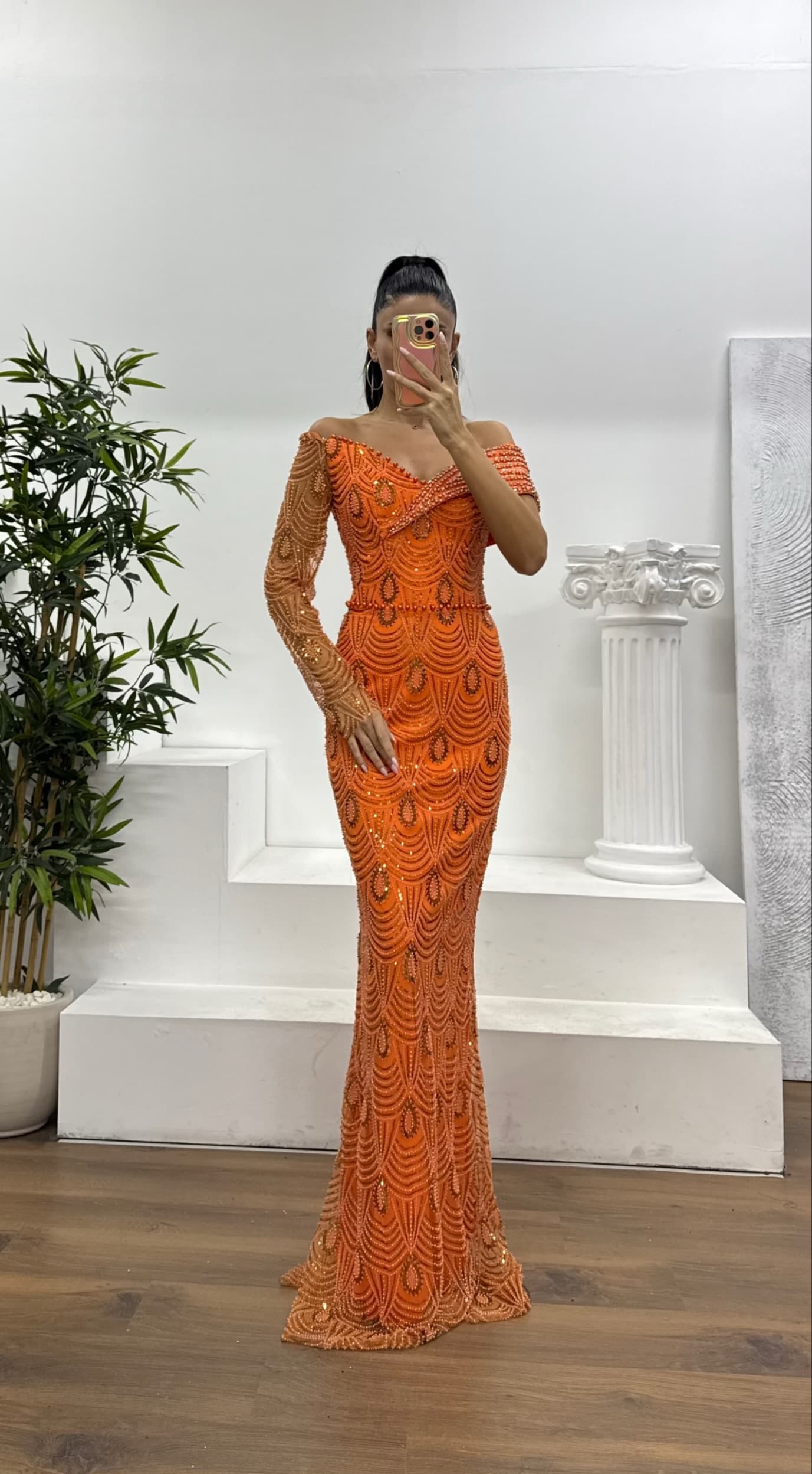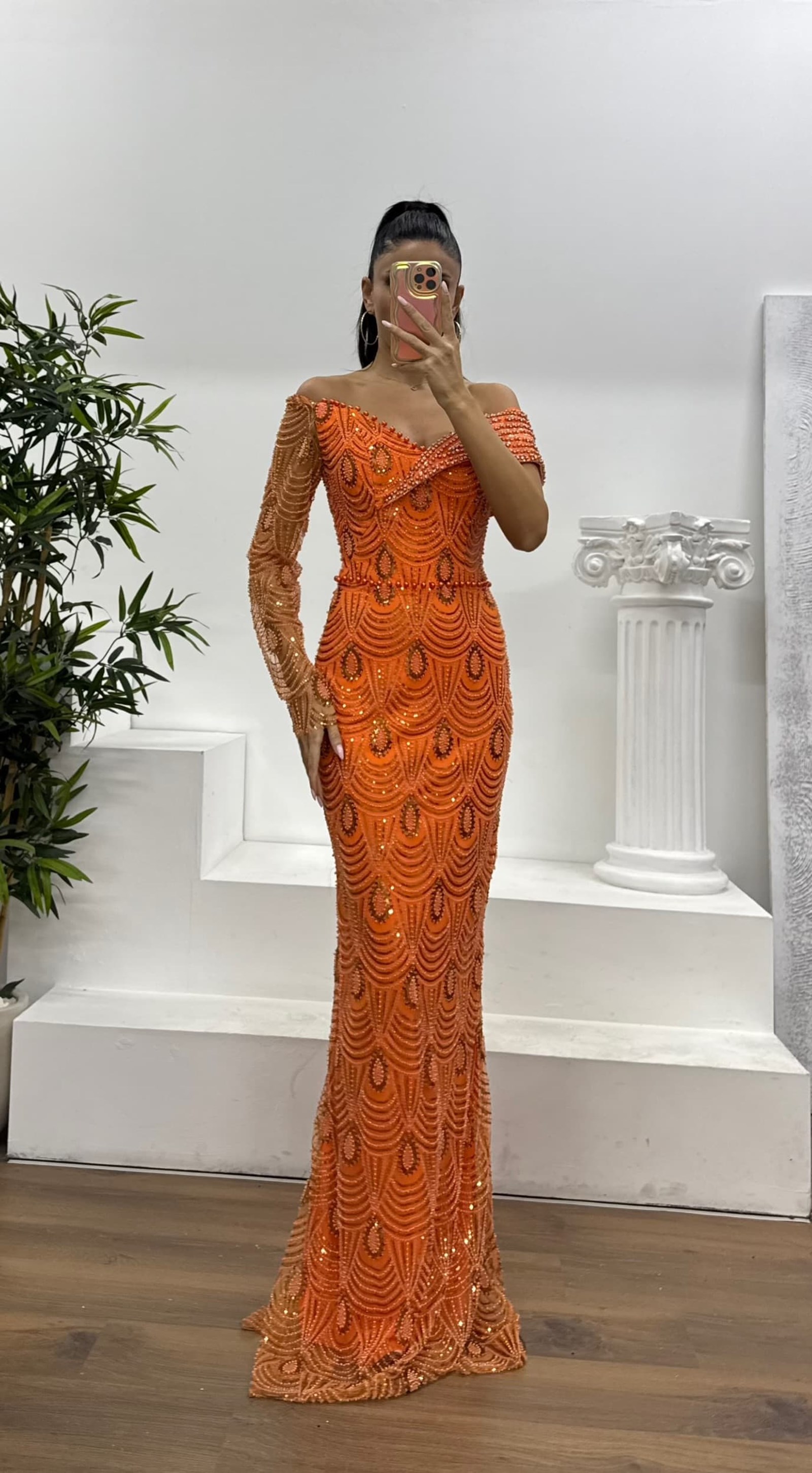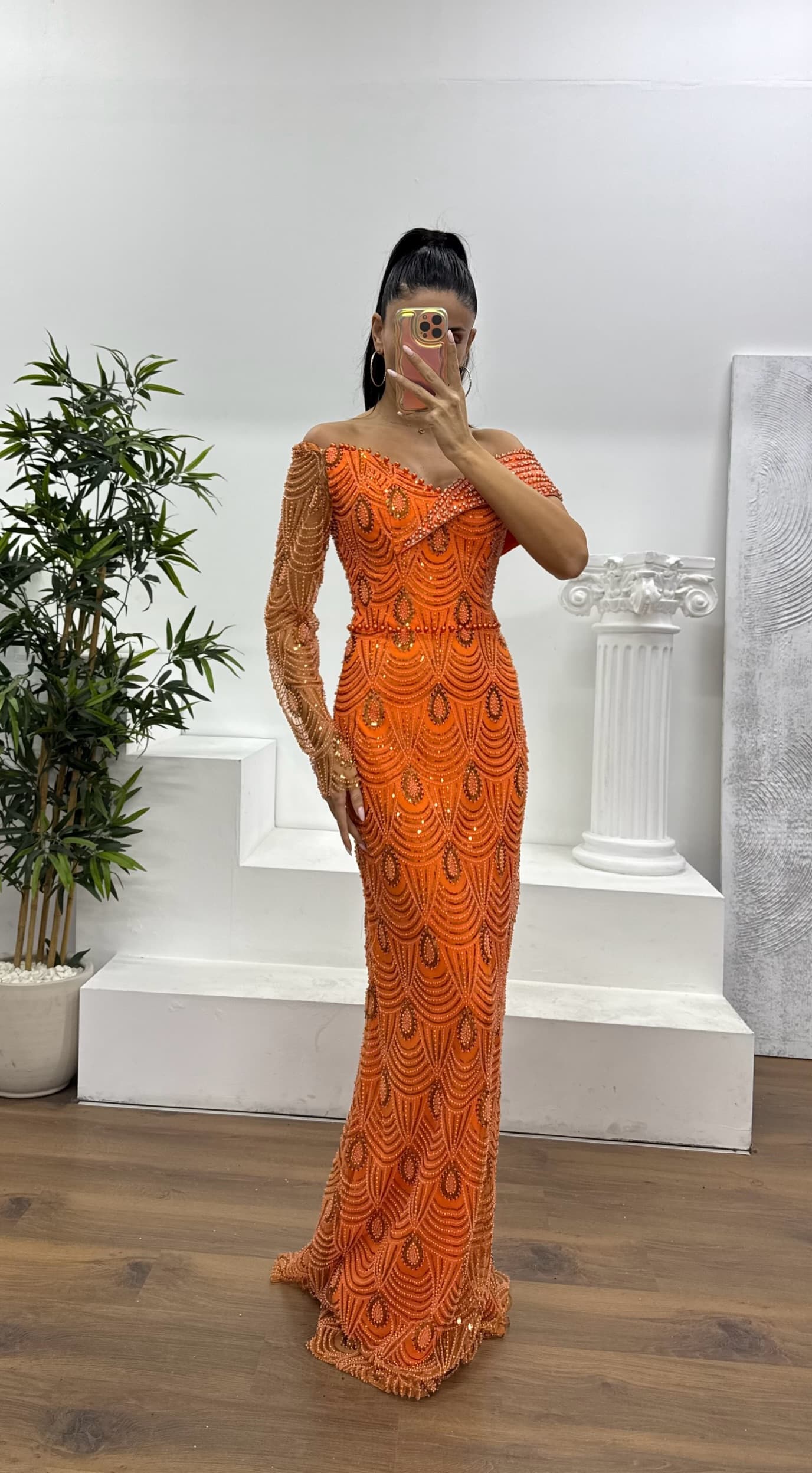 • Turuncu Asimetrik Yaka İşlemeli Abiye Elbise